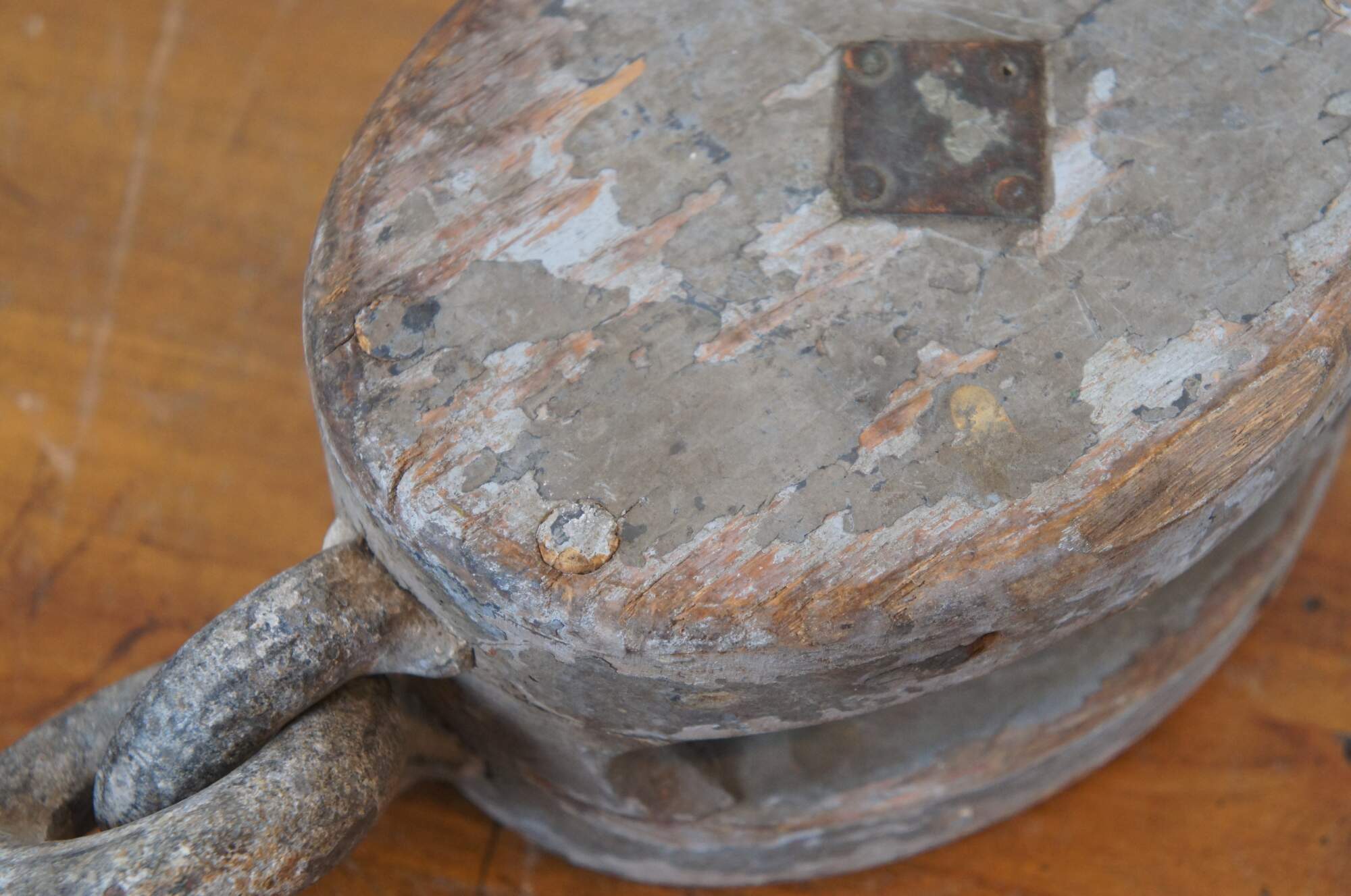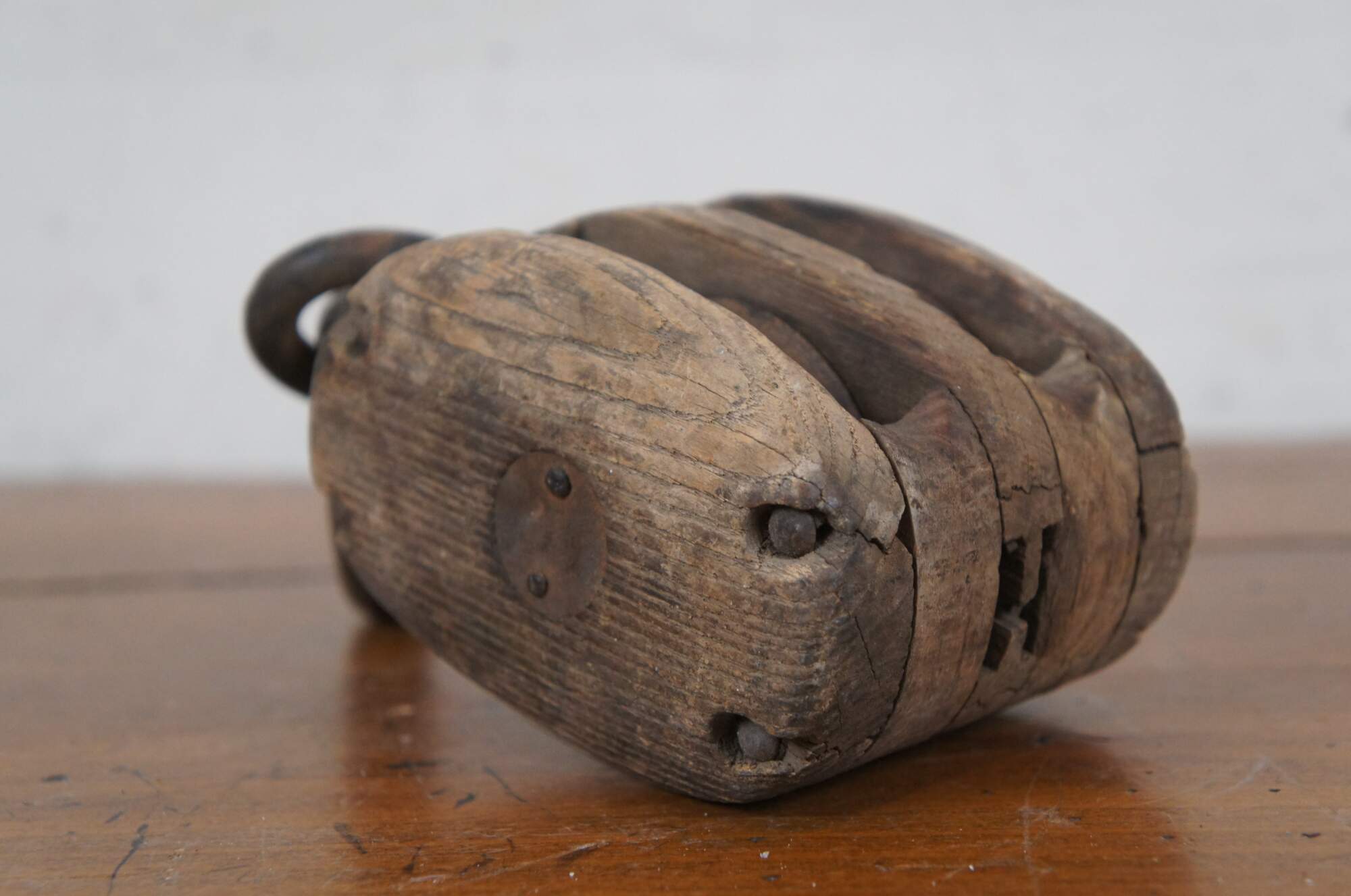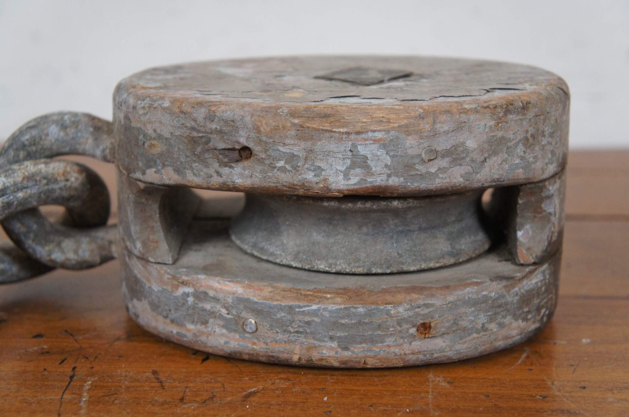 Pair of antique wood block and iron industrial pulley hooks. Larger has one pulley wheel, smaller contains two pulley wheels.