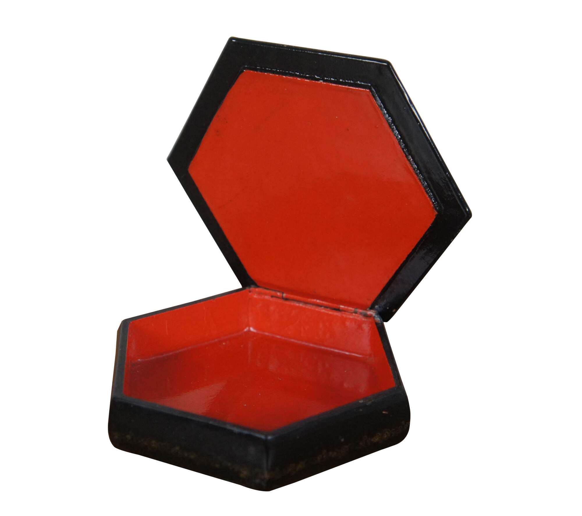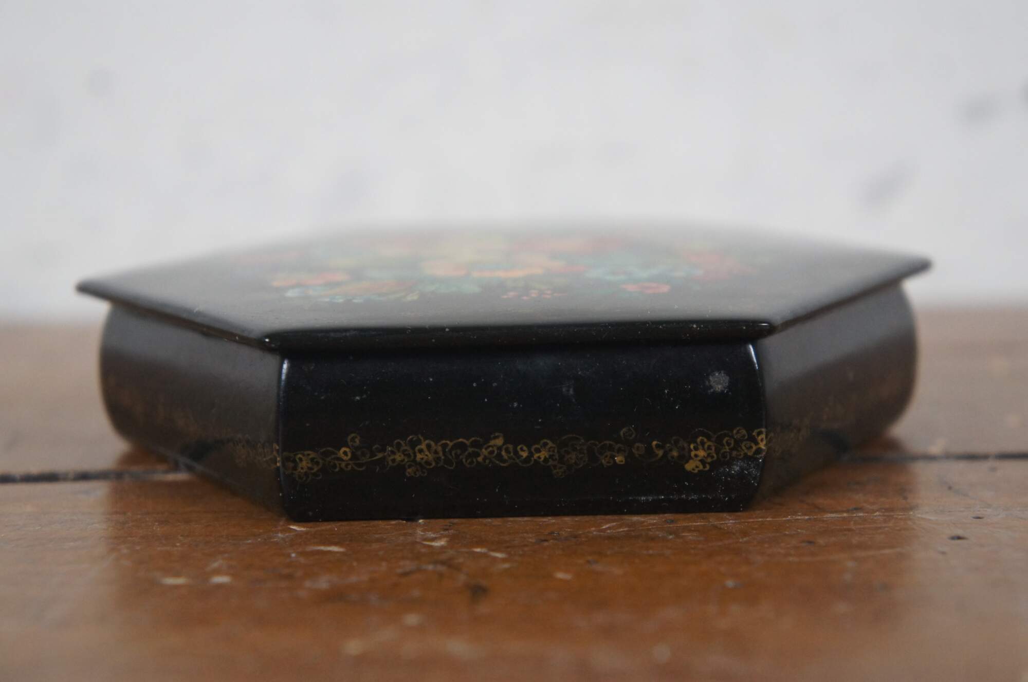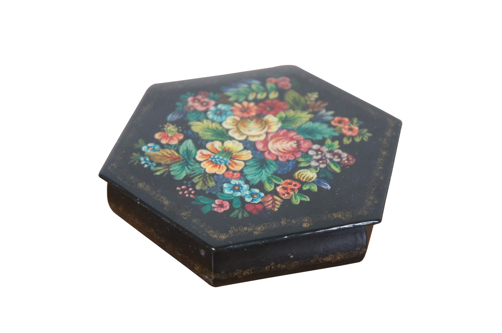 Vintage hexagonal black lacquer trinket box, hand painted with Eastern eurpoean / Russian folk art flowers. Red interior. No signature.