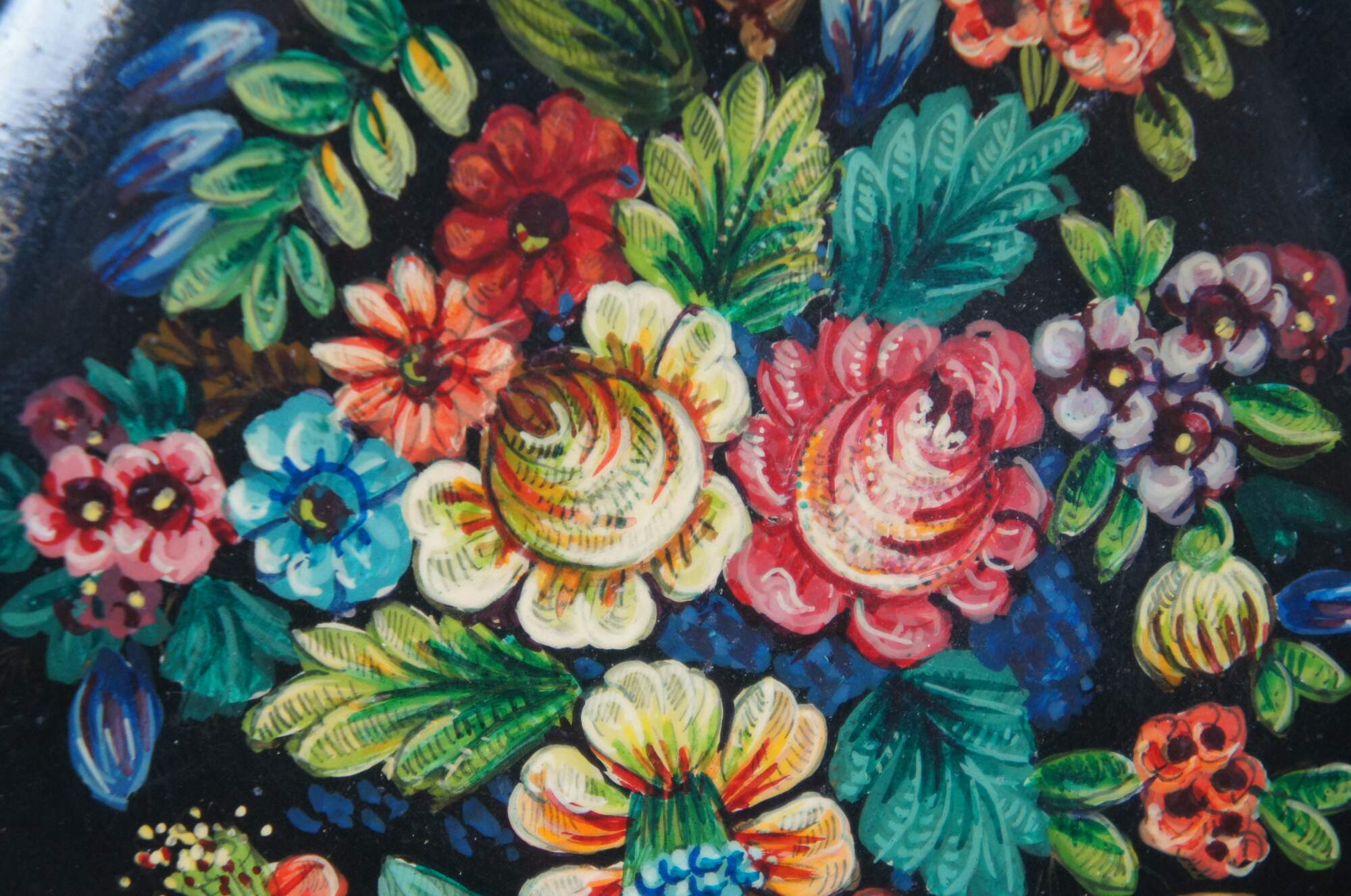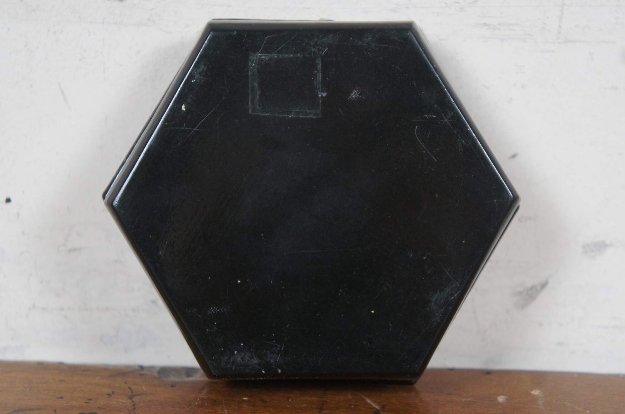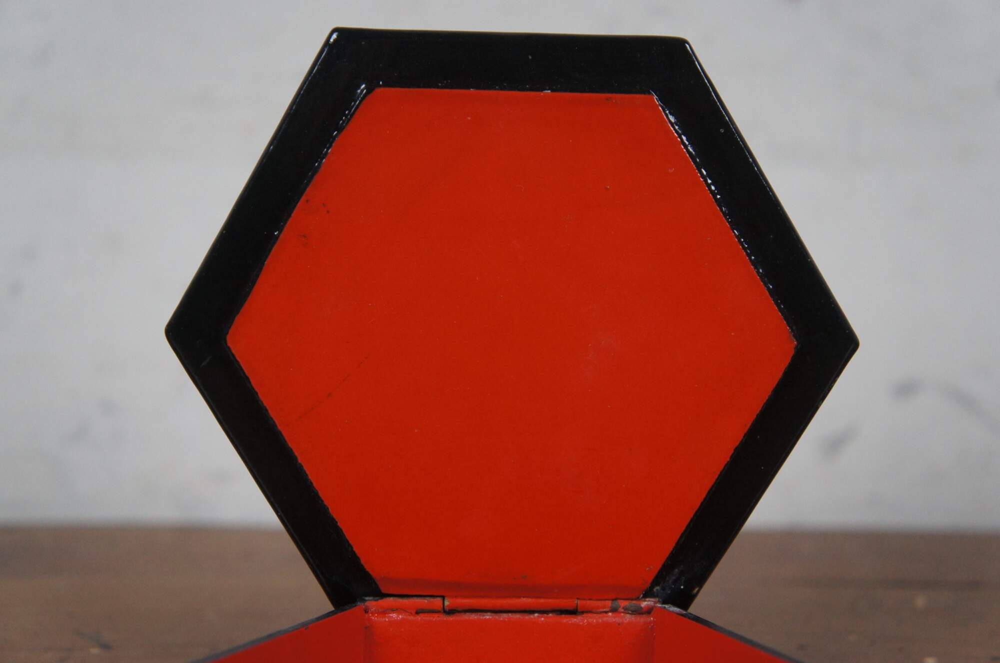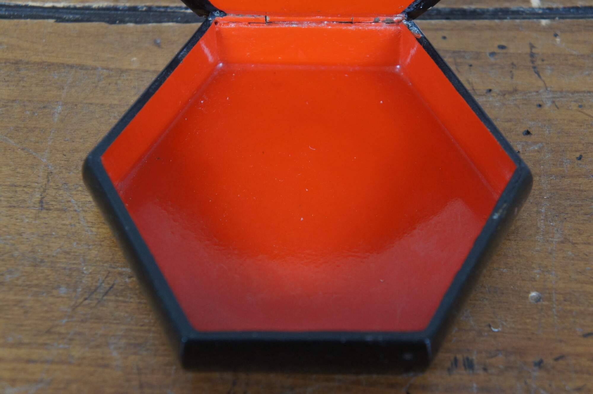 Vintage hexagonal black lacquer trinket box, hand painted with Eastern eurpoean / Russian folk art flowers. Red interior. No signature.
