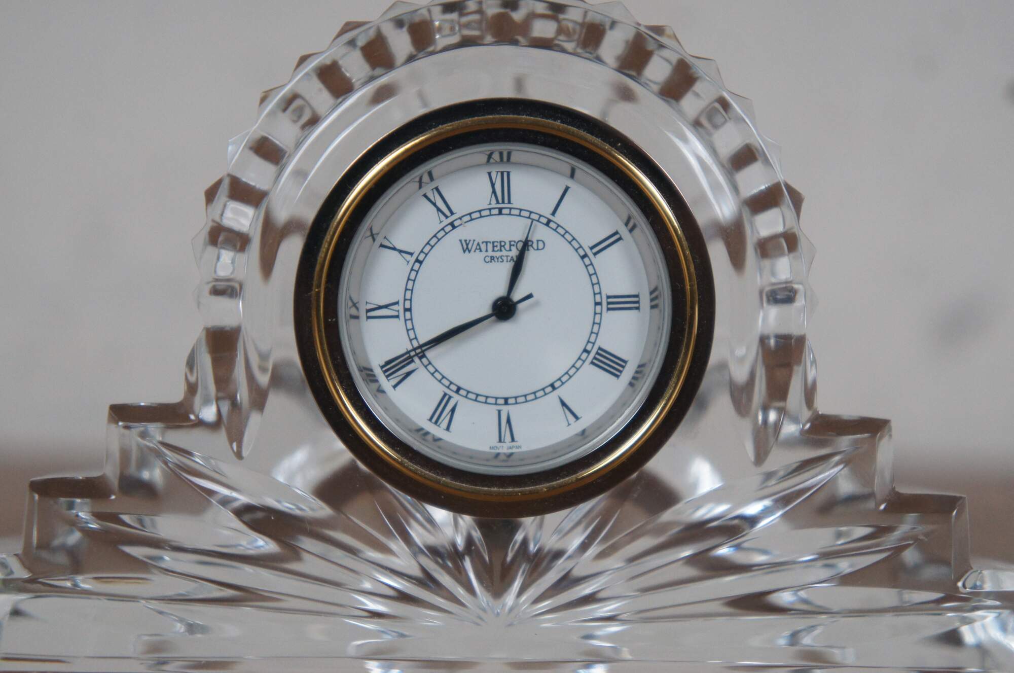 Vintage Waterford Crystal minaiture desk clock featuring an art deco inspired form decorated with a rising sunburst at the base. JBattery operated, Japan. Brass edge around white face with Roman numerals.