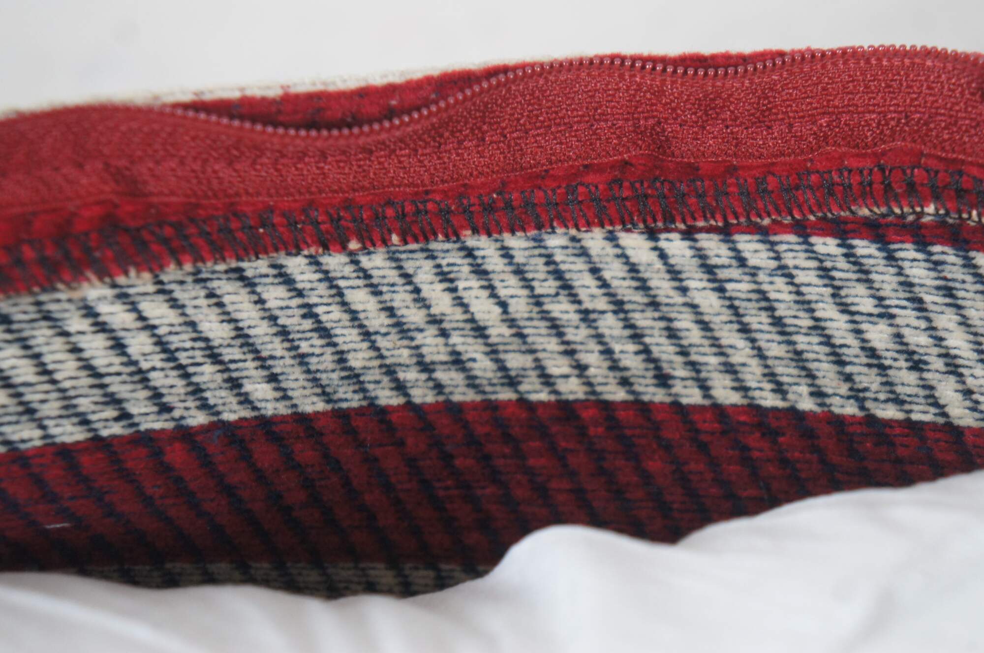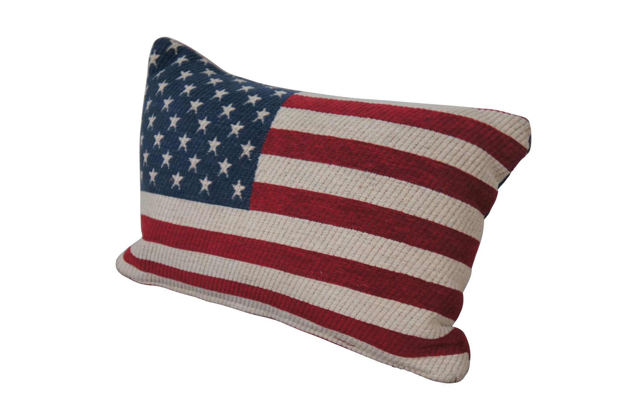 20th century rectangular lumbar / throw pillow in thick ribbed corduroy, printed with the pattern of the American flag. Zipper closure. Fiber filled.
