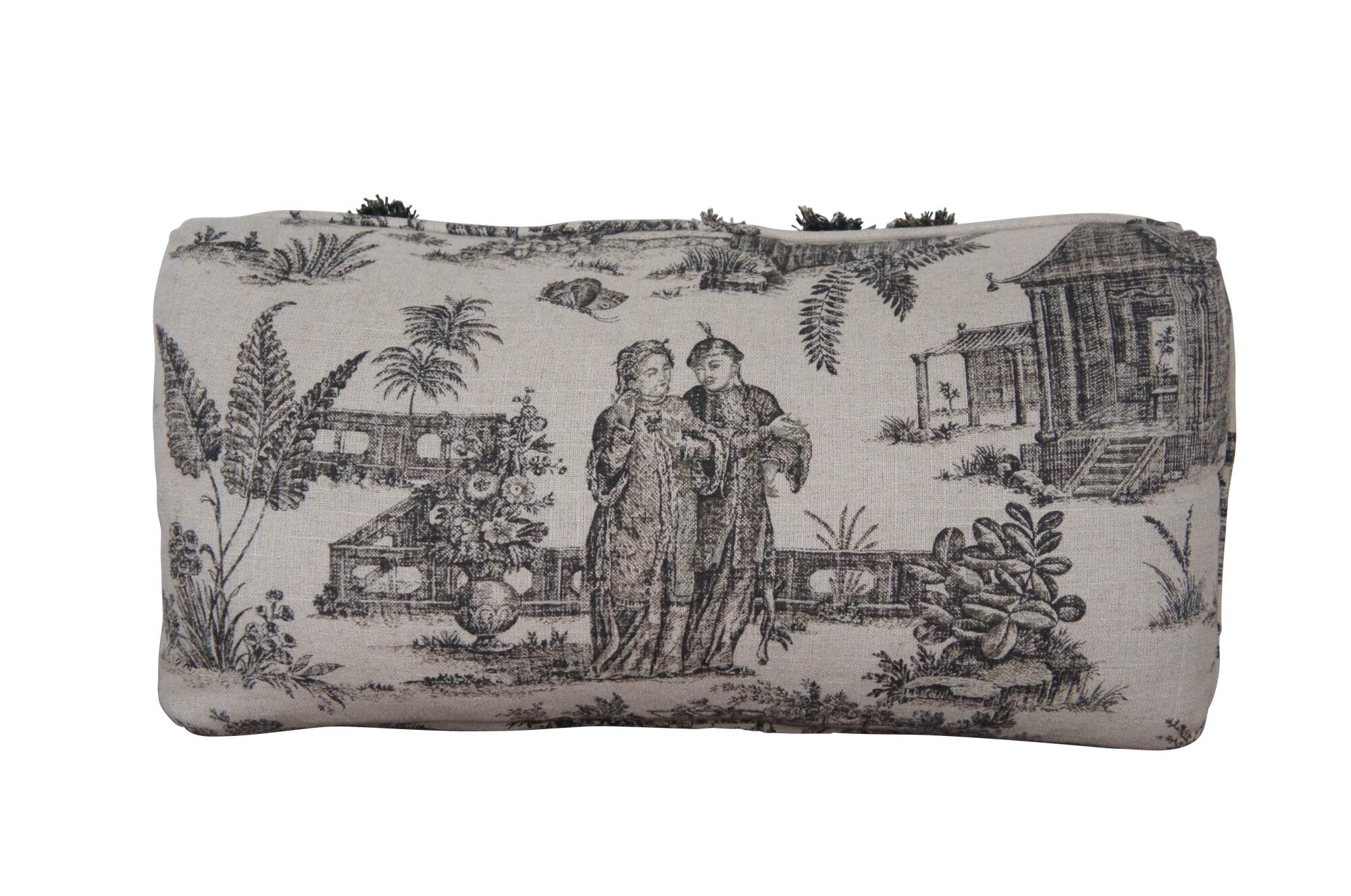Late 20th century rectangular lumbar / throw pillow, featuring a black and white Chinoiserie toile style print on linen of a garden landscape with pagoda and geisha figures, bordered with cream and black braided trim and tassels. Zipper closure. Down filled.
