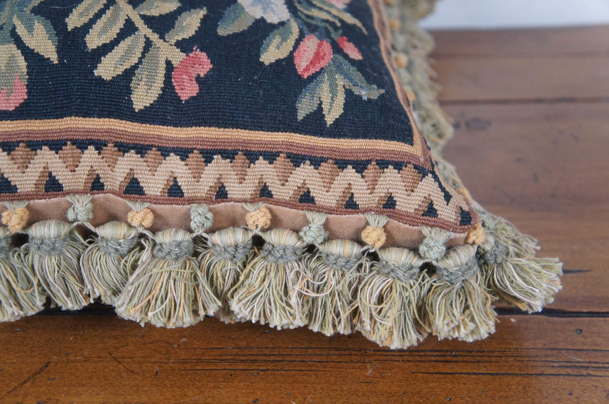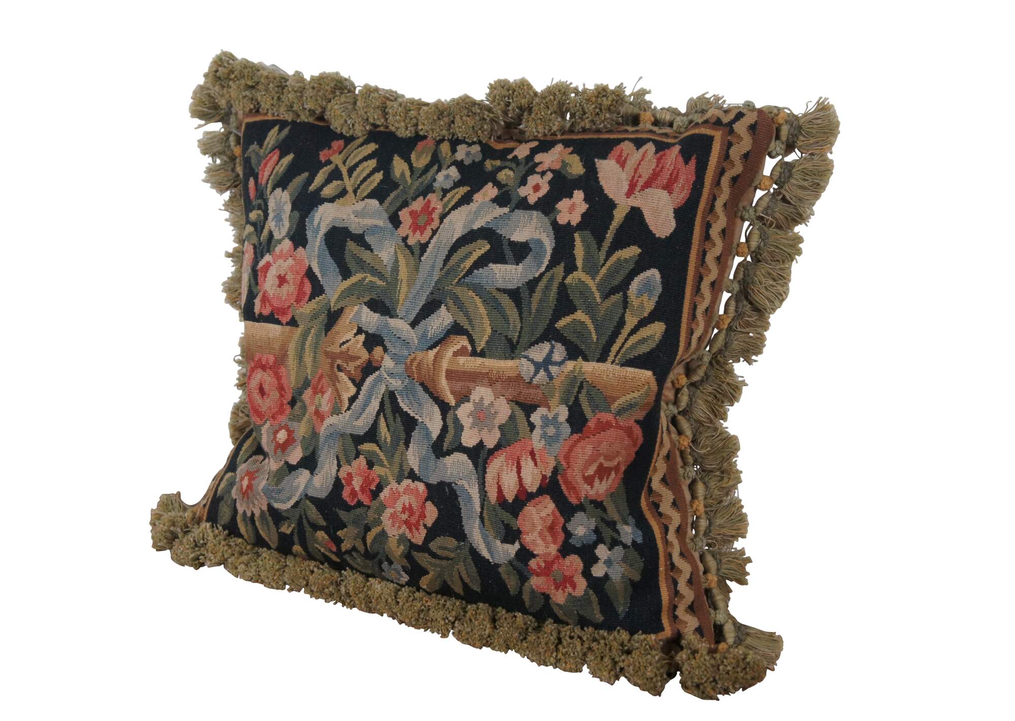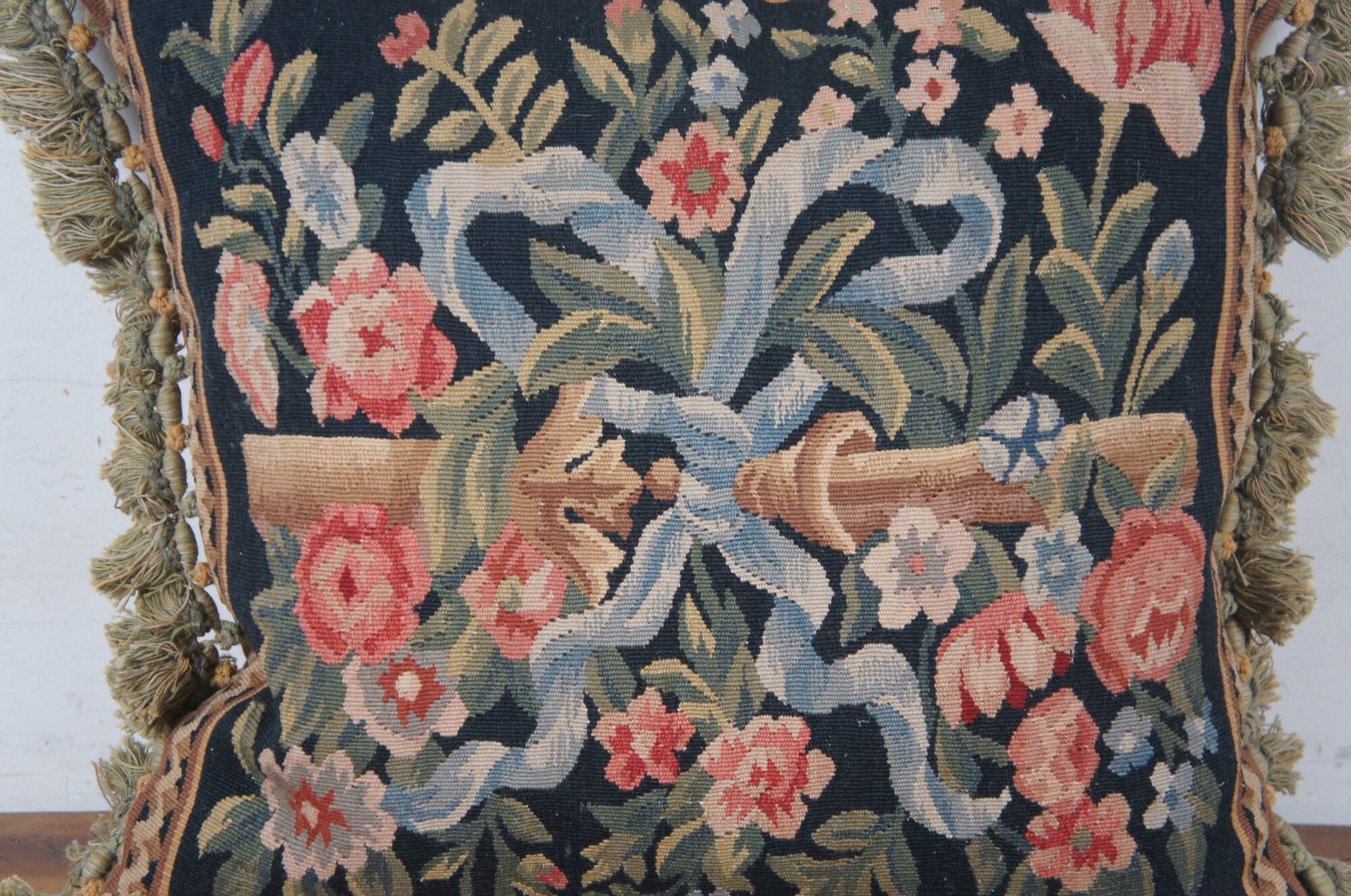 20th century square throw pillow, embroidered with blue flowers and pink roses on leafy stems, surrounding a golden bar tied with a blue ribbon / bow, all on a deep navy blue background. Olive green and gold tassel trim. Brown velour back with zipper closure. Down filled.