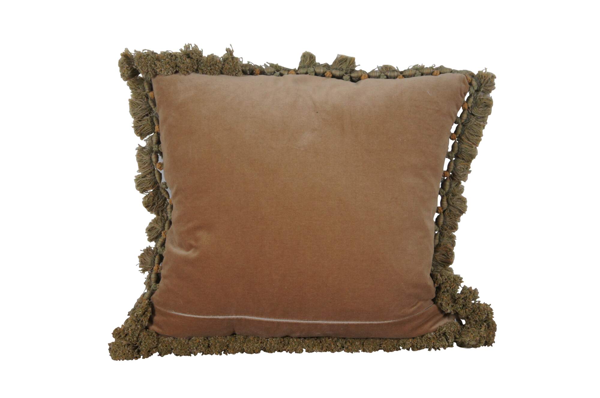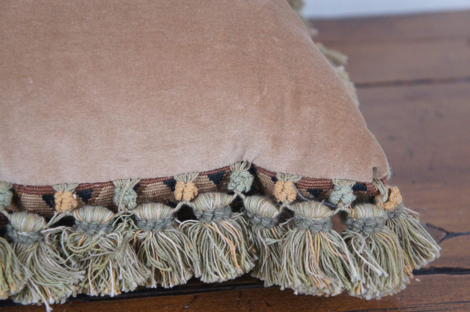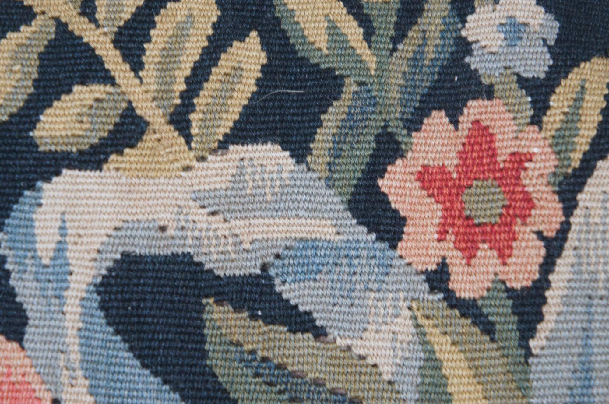 20th century square throw pillow, embroidered with blue flowers and pink roses on leafy stems, surrounding a golden bar tied with a blue ribbon / bow, all on a deep navy blue background. Olive green and gold tassel trim. Brown velour back with zipper closure. Down filled.