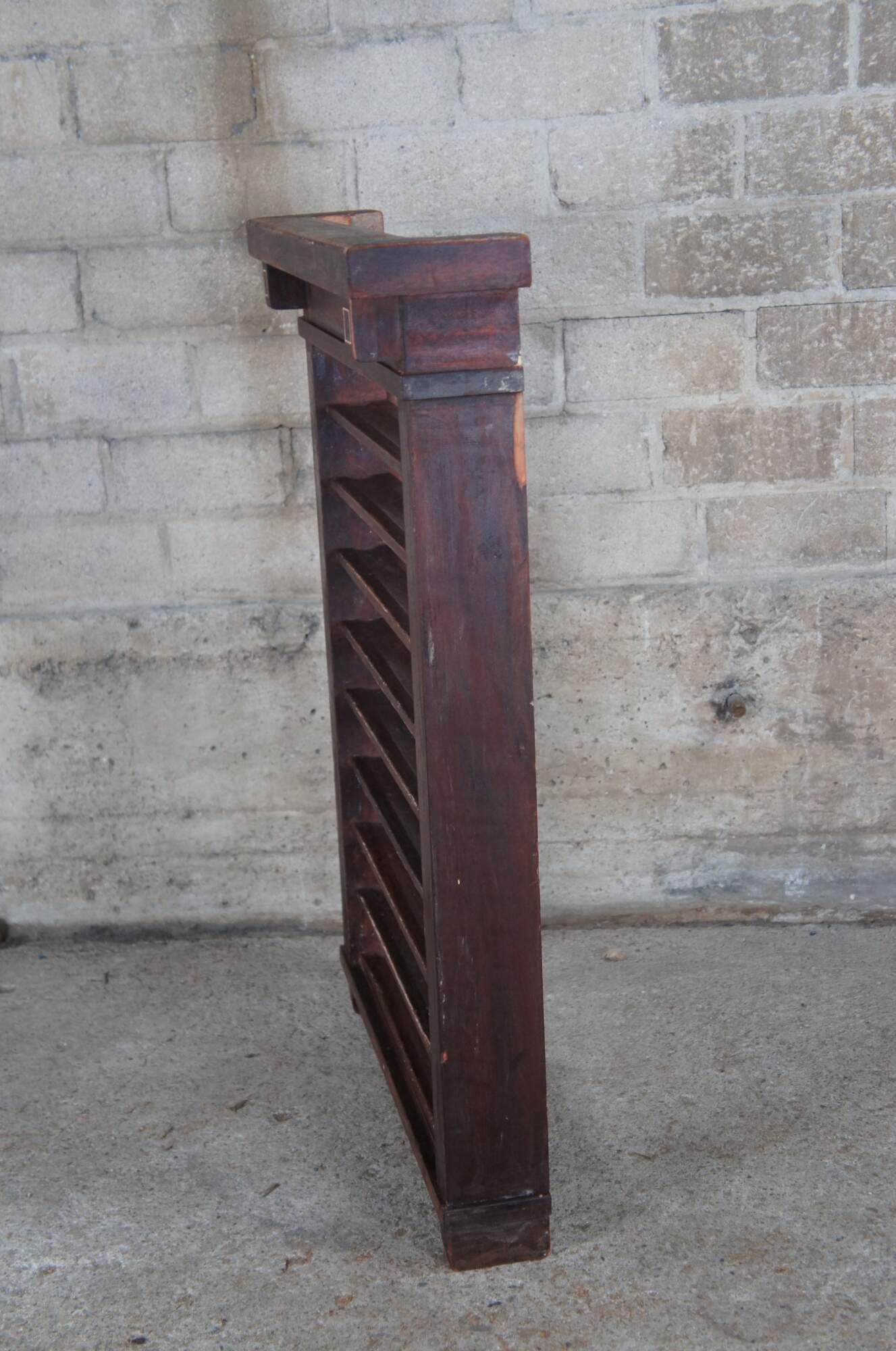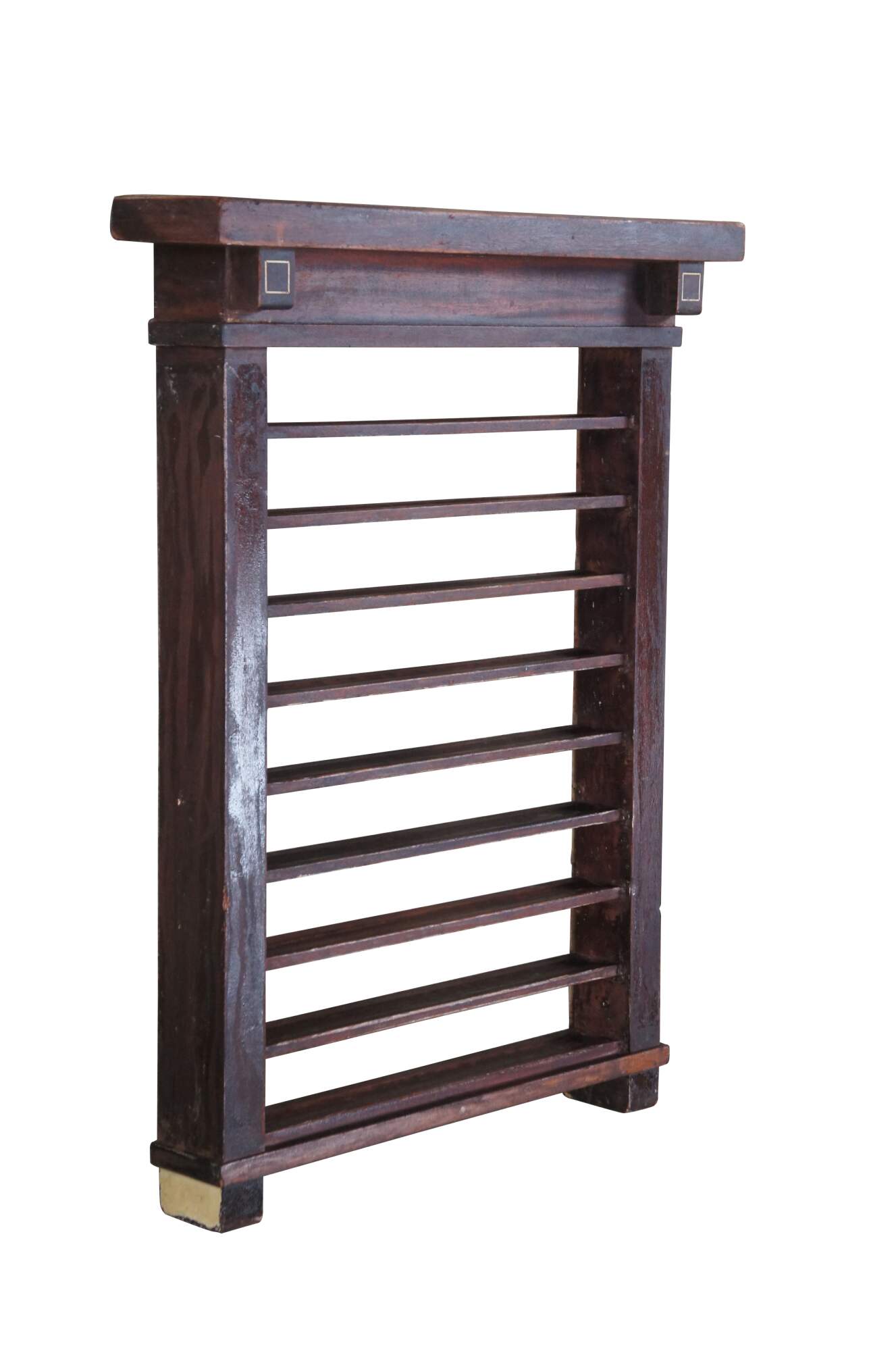 An antique wall mount pool ball rack. Made from mahogany with 9 shelves and a unique square inlay towards the top.