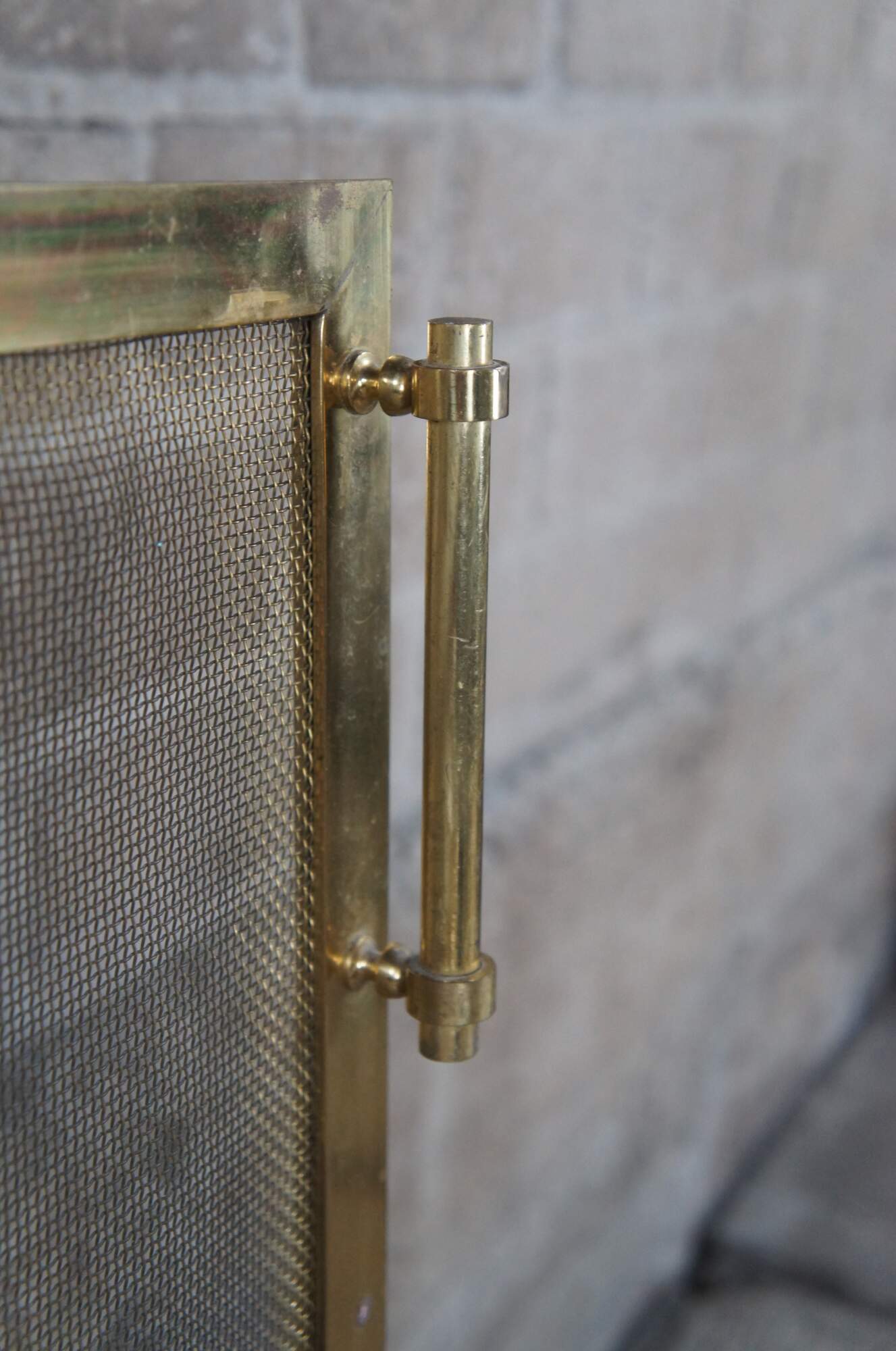 Vintage brass and mesh fire screen featuring Hollywood Regency styling with scrolled brass accents and slots for firedog andirons.