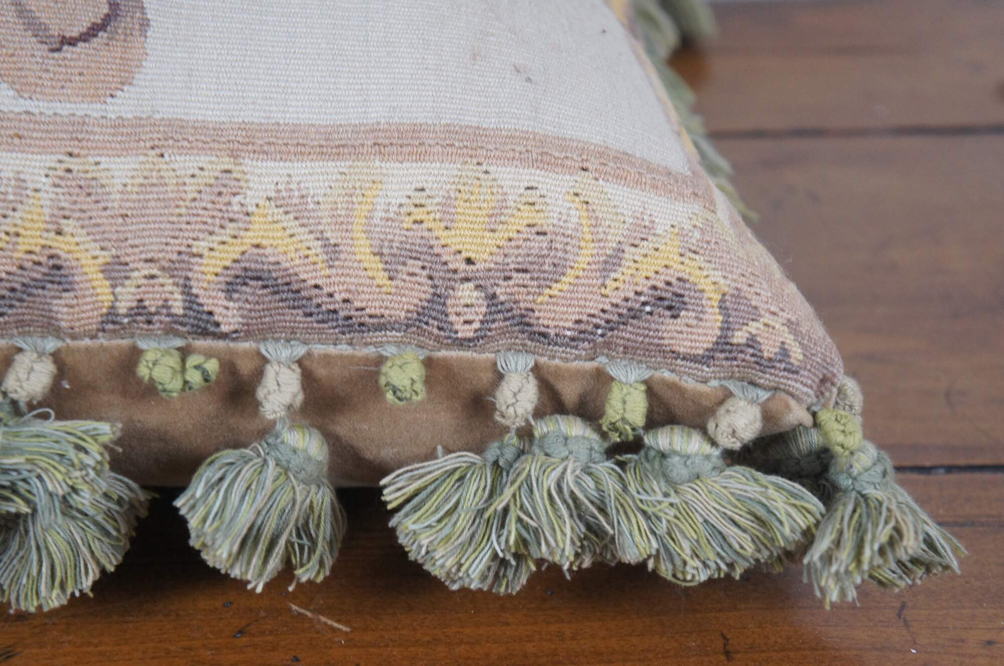 20th century square throw pillow, embroidered with a Renaissance style cherub perched in a scrolled edge frame, surrounded by a brown and gold foliate border. Blue and green tassel trim. Light brown velour back with zipper closure.