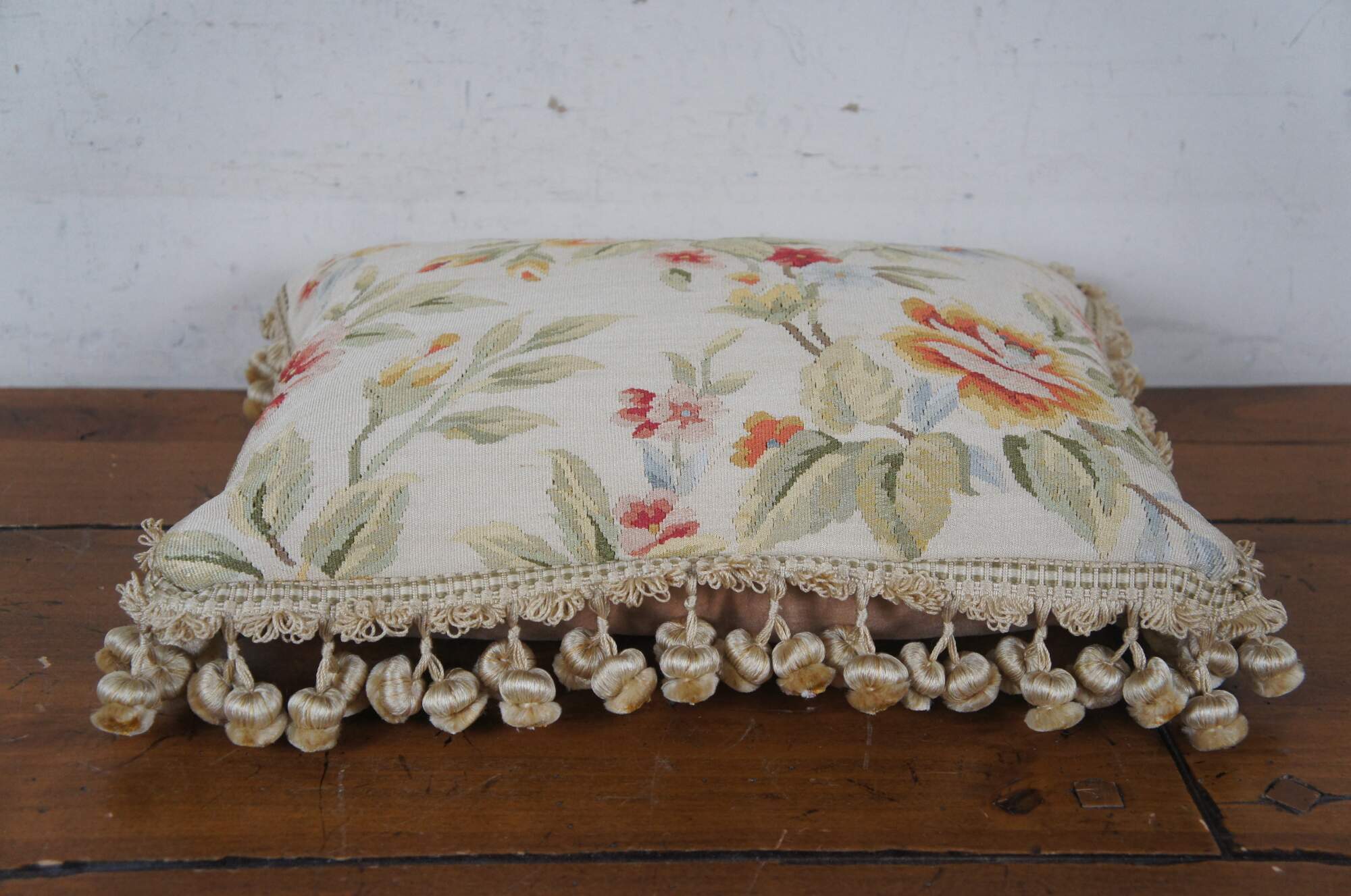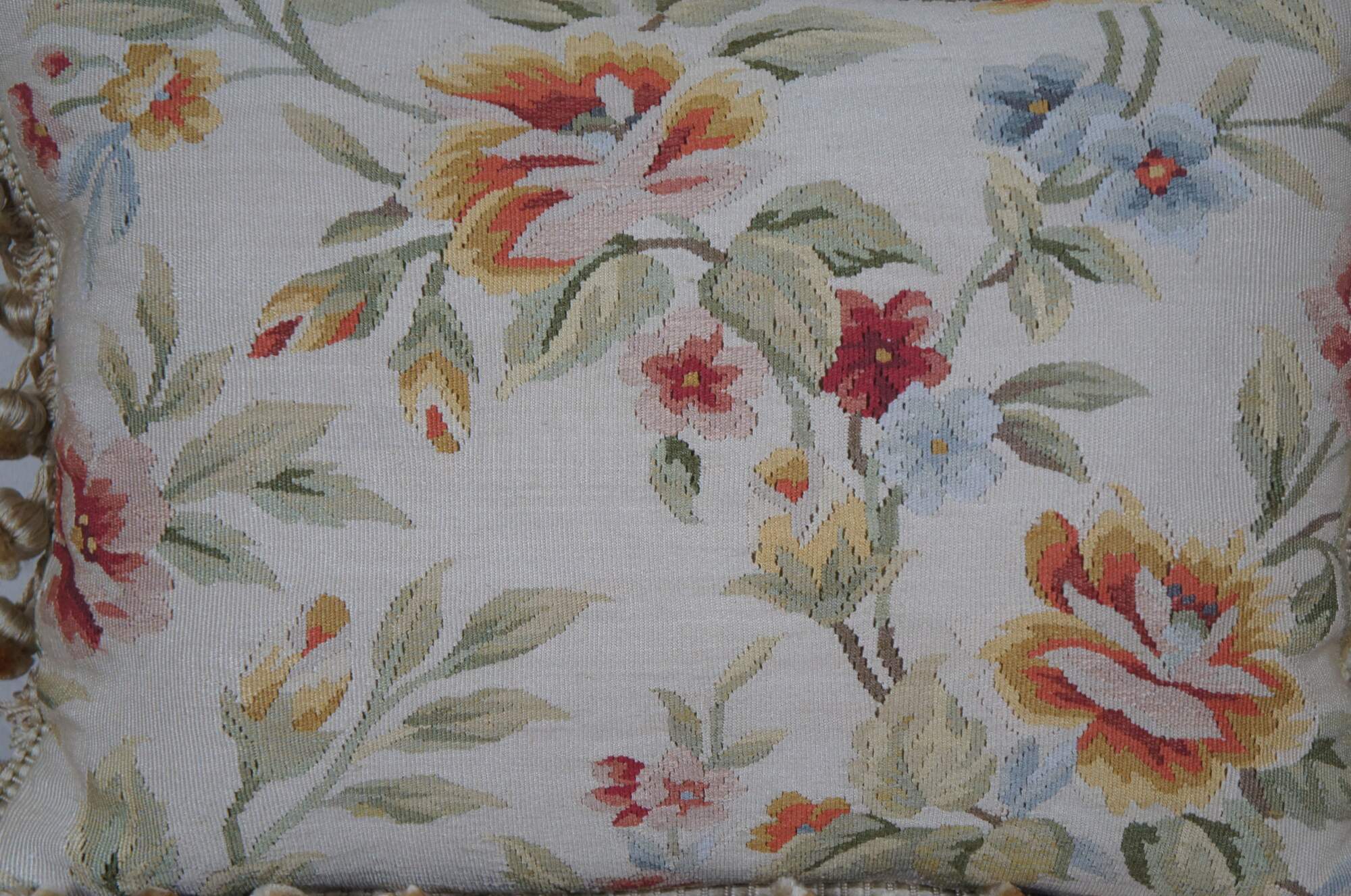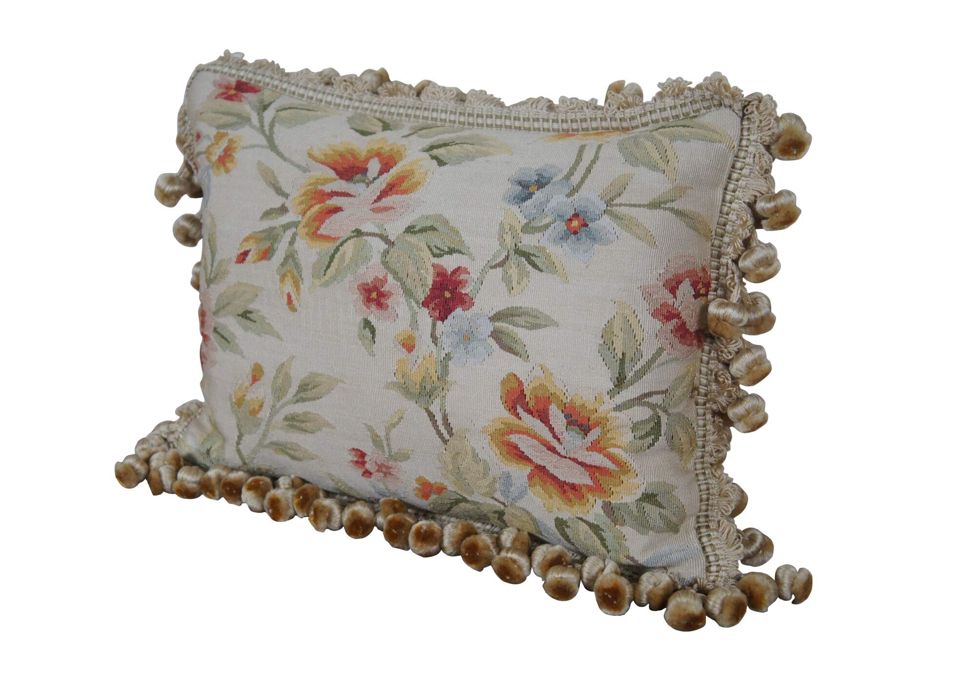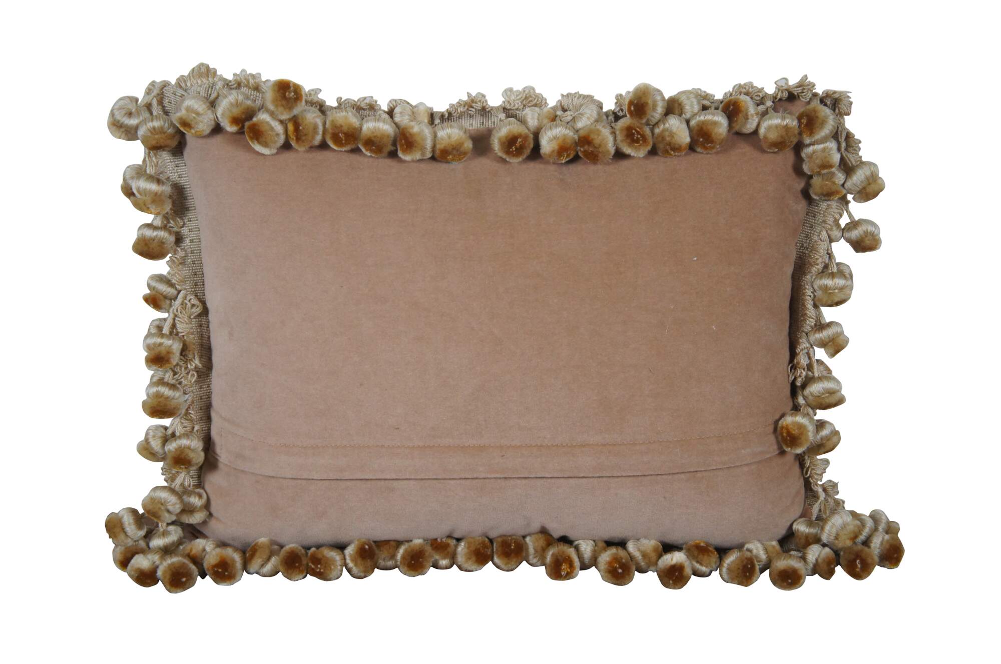 20th century rectangular lumbar / throw pillow, embroidered in silk with leafy branches of orange, red, and blue flowers. Cream ball tassel trim. Beige velour back with zipper closure.