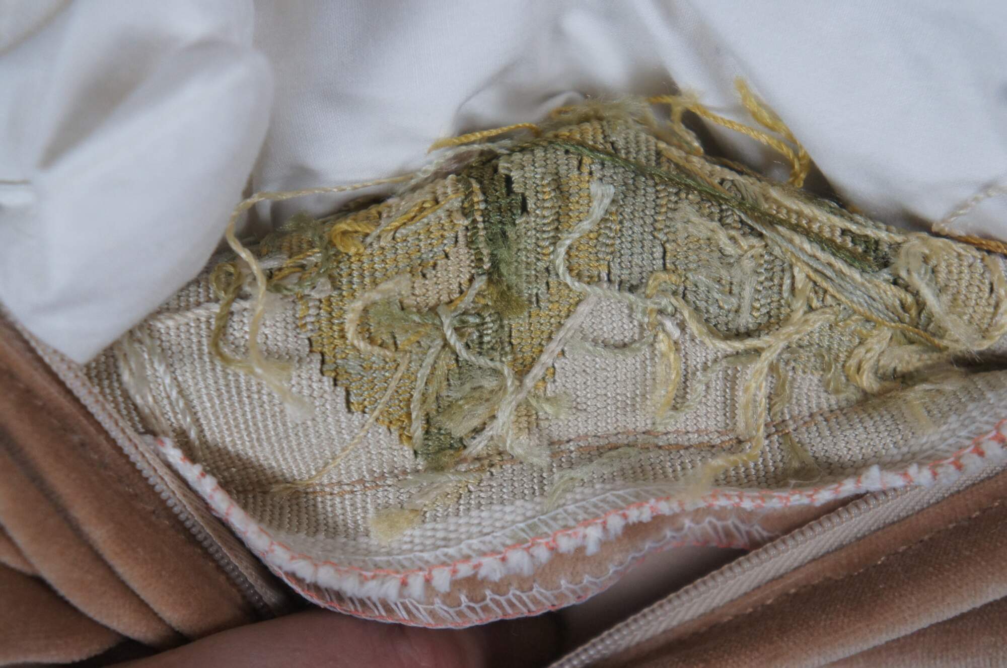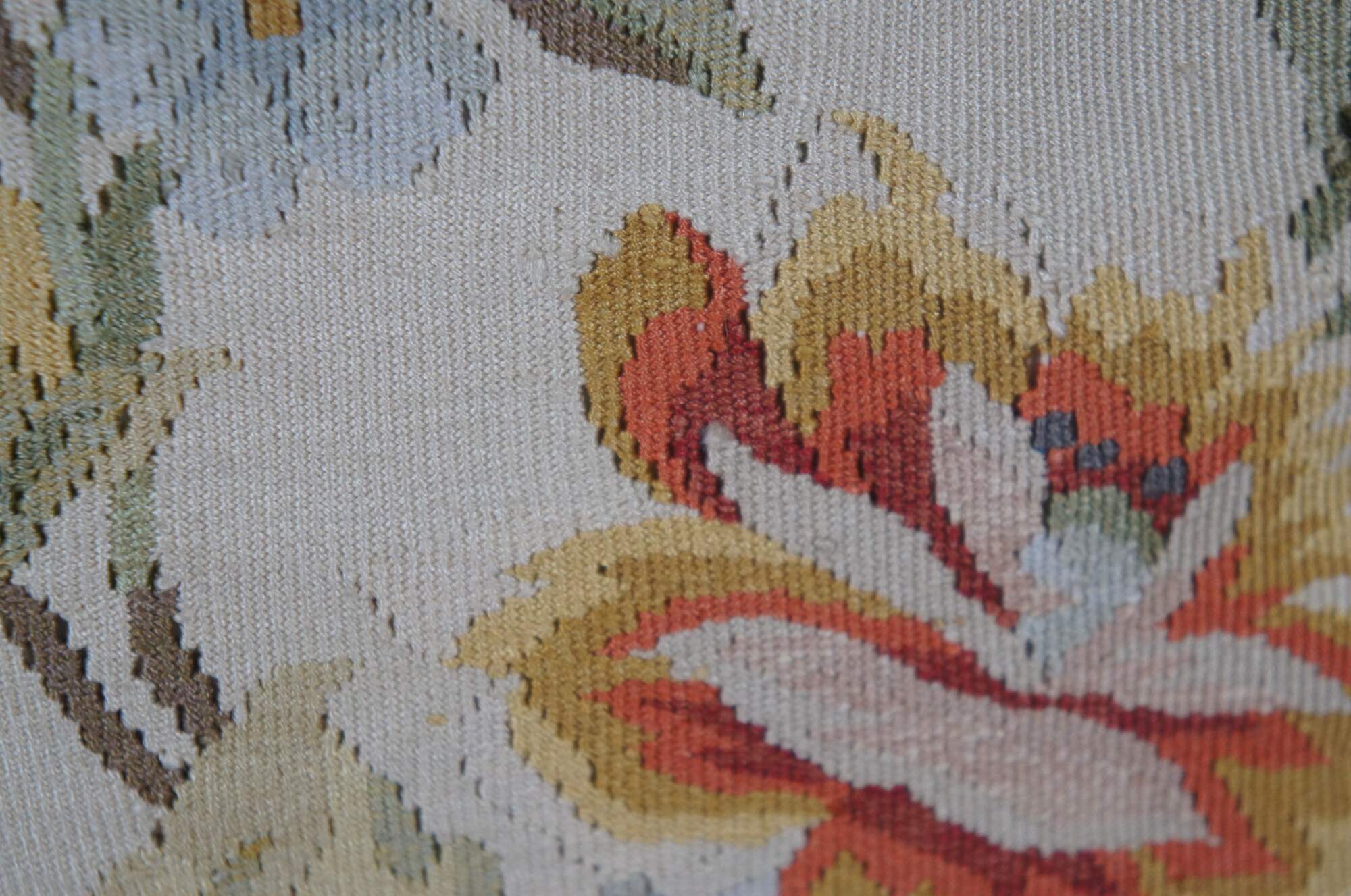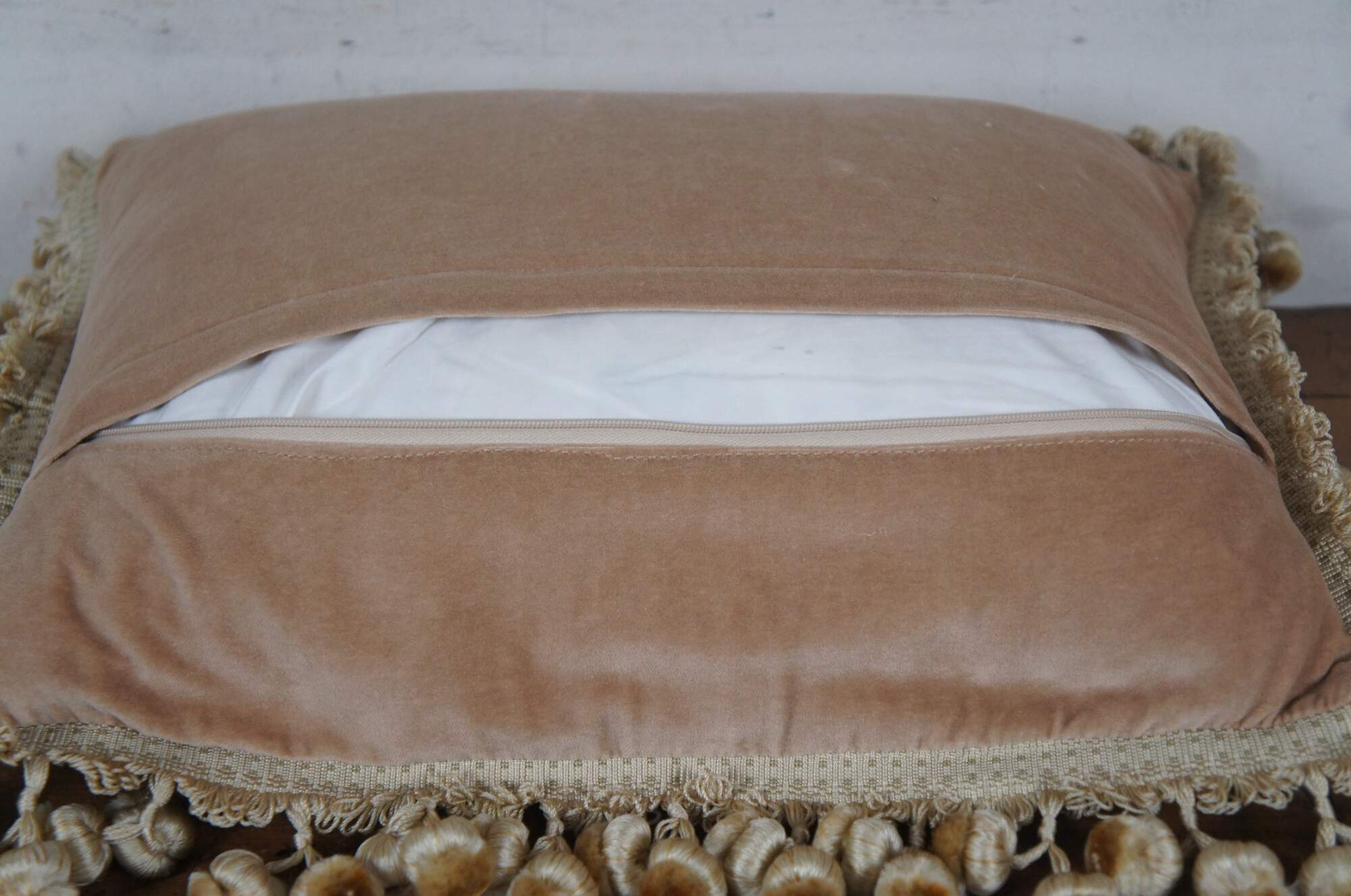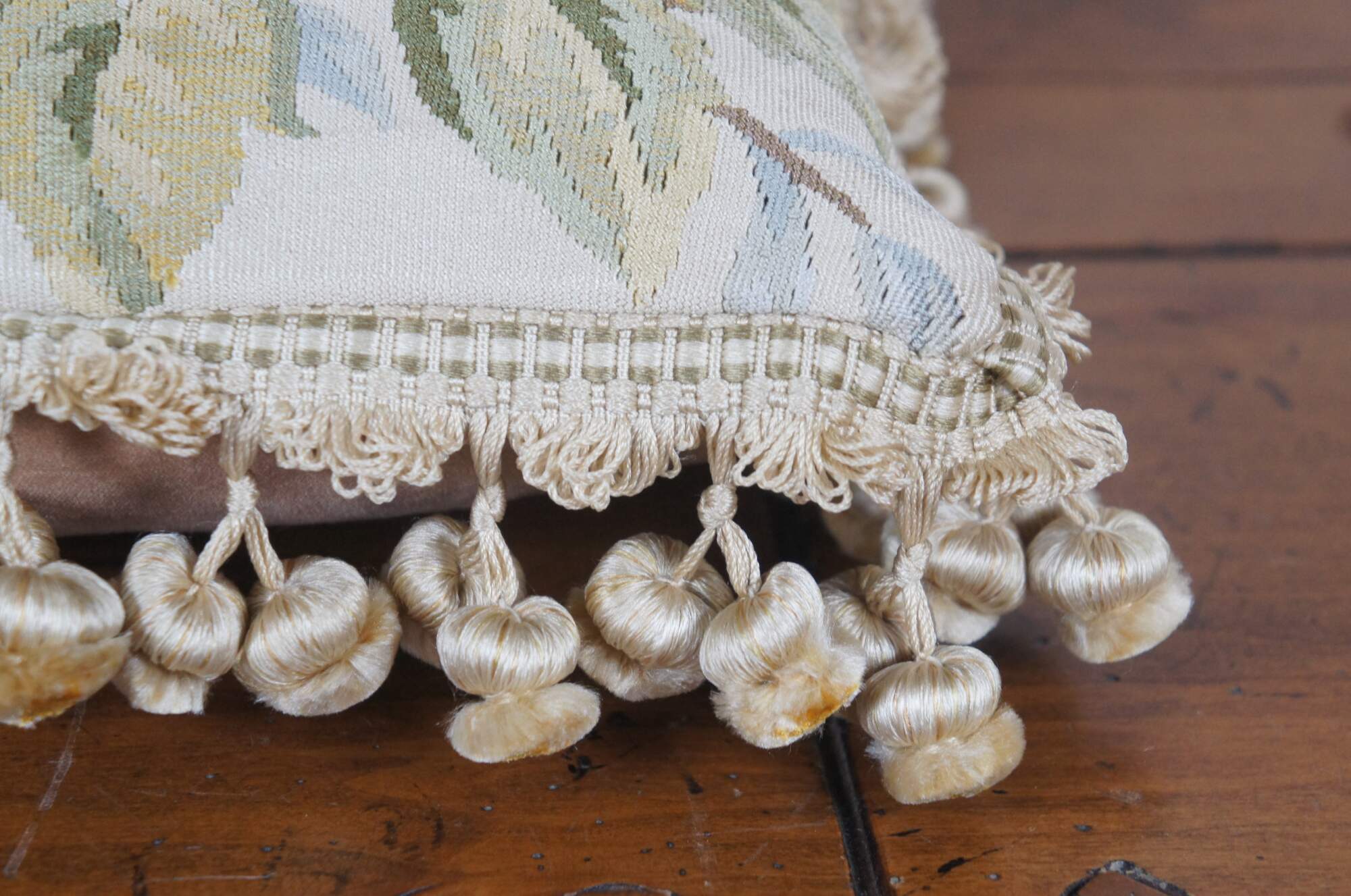 20th century rectangular lumbar / throw pillow, embroidered in silk with leafy branches of orange, red, and blue flowers. Cream ball tassel trim. Beige velour back with zipper closure.