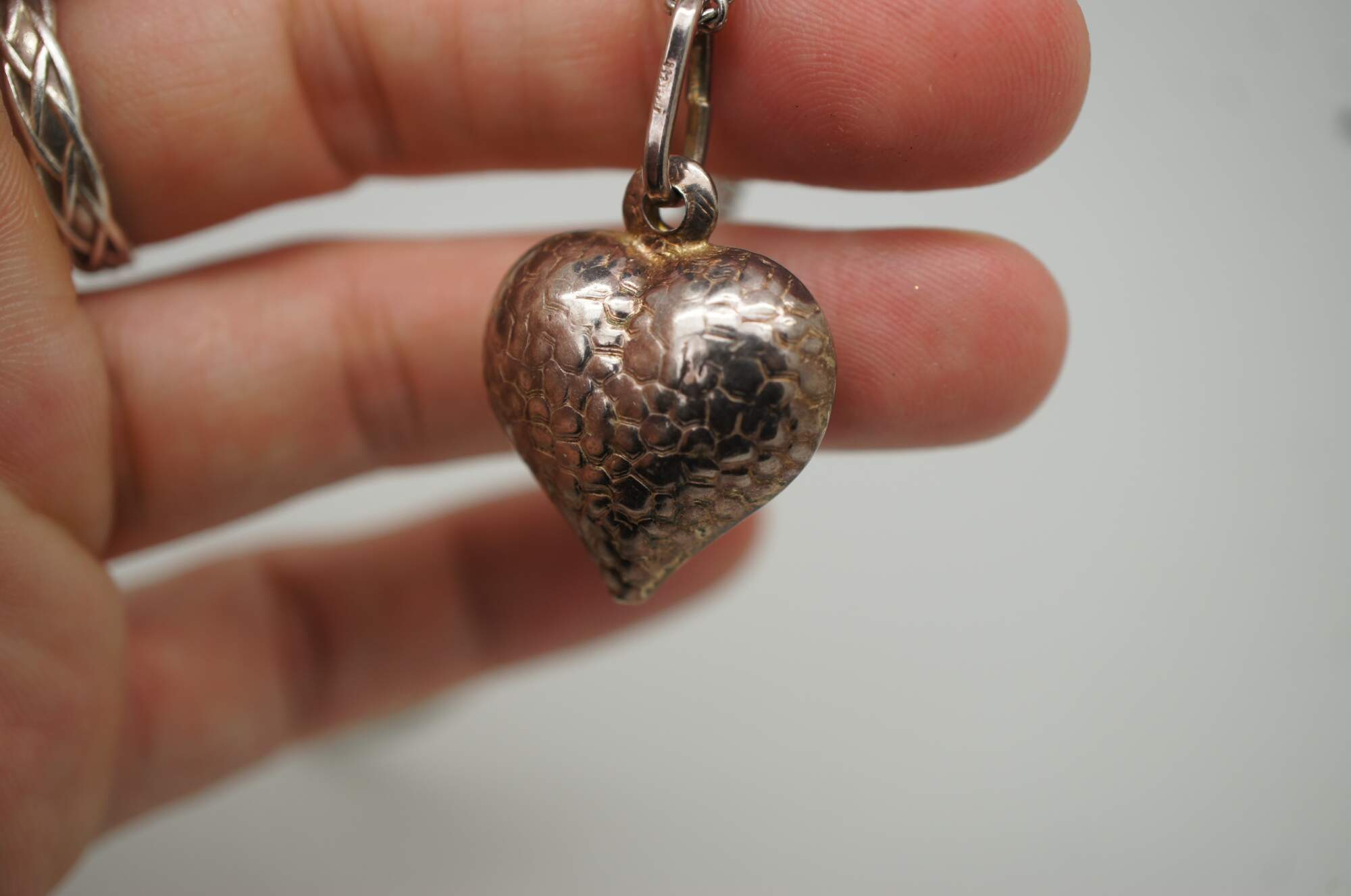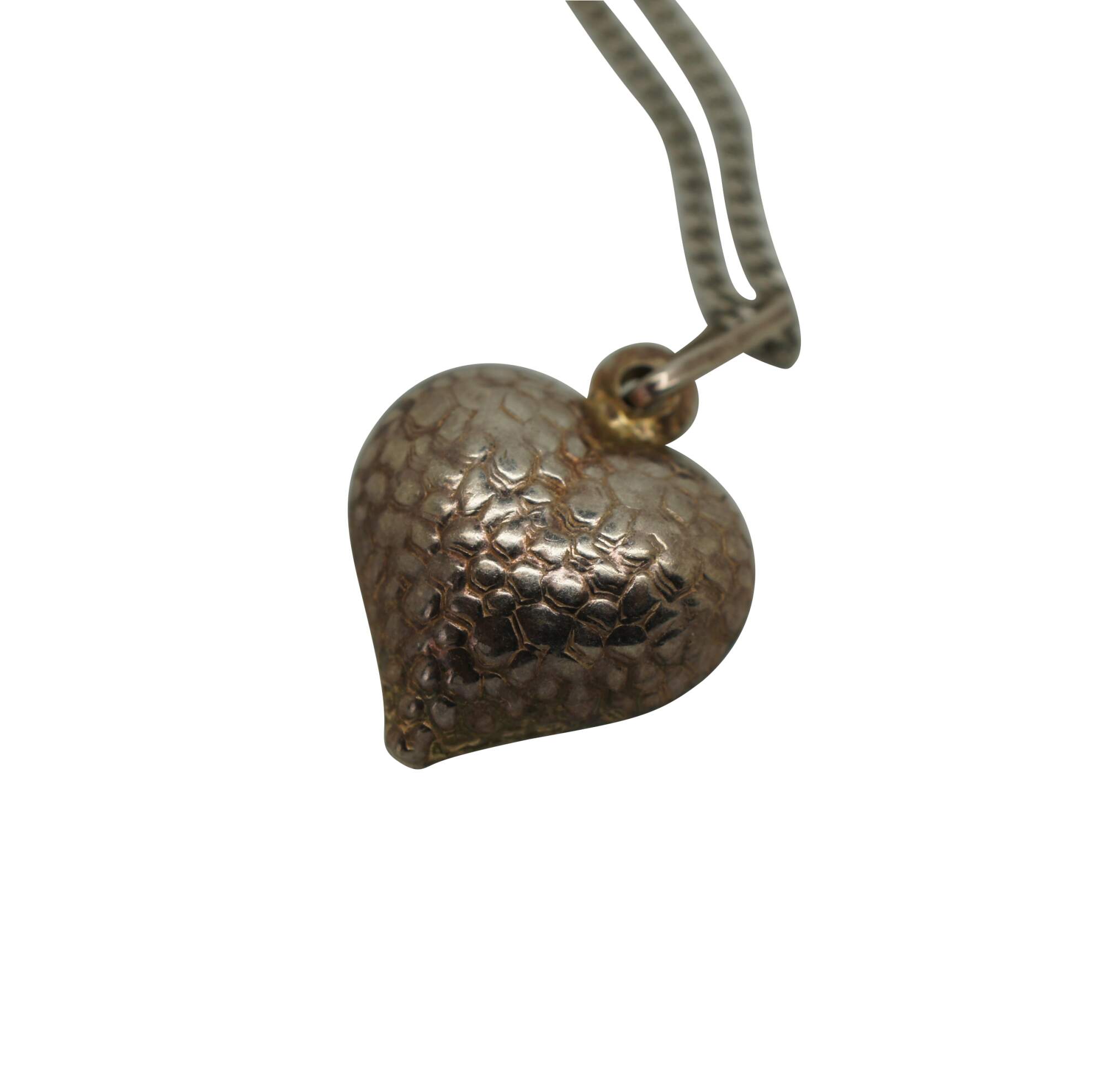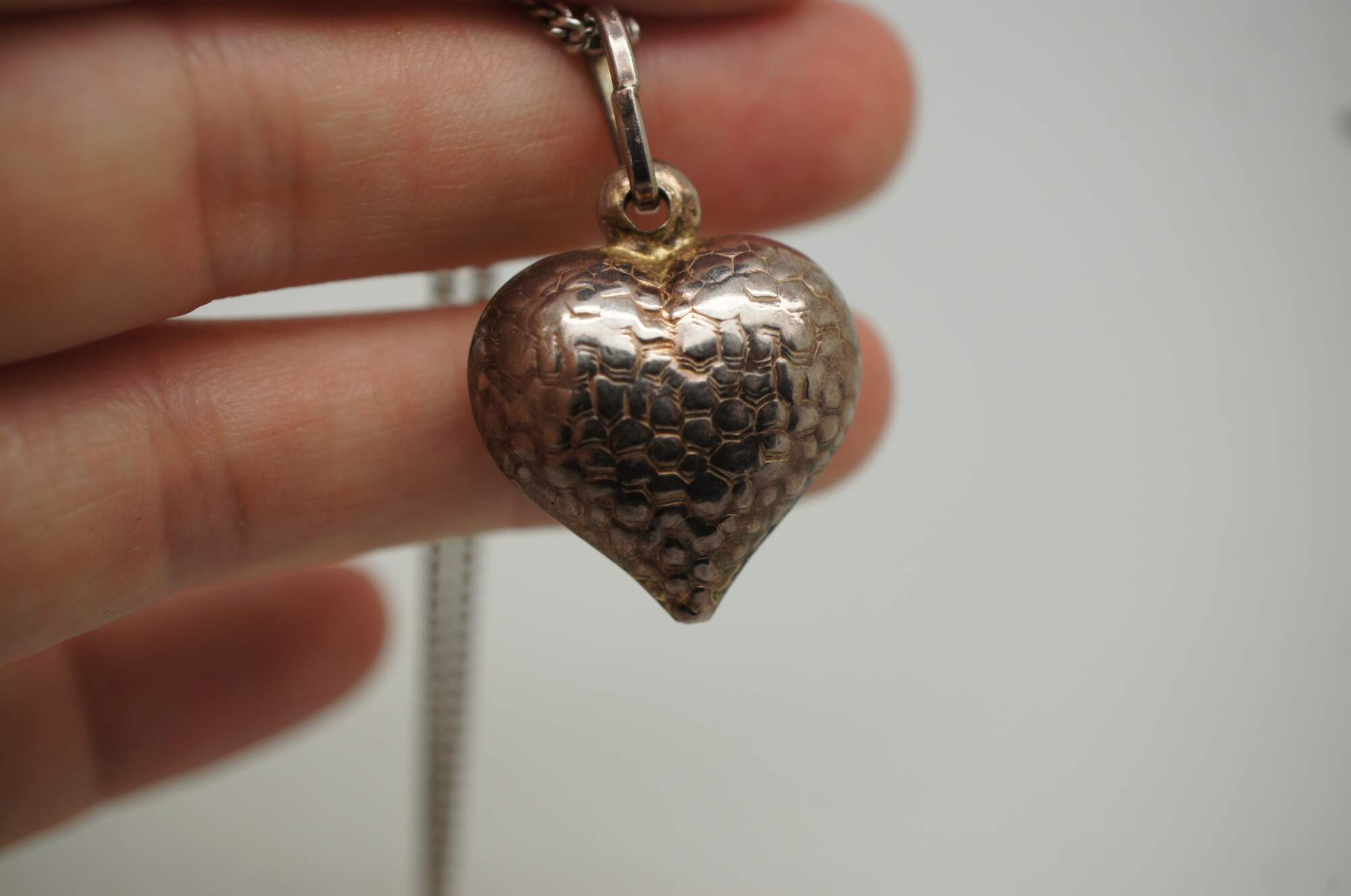 Vintage 925 sterling silver pillow / puffy heart peandant with a pebbled stone texture surface. Curb chain with spring ring clasp.