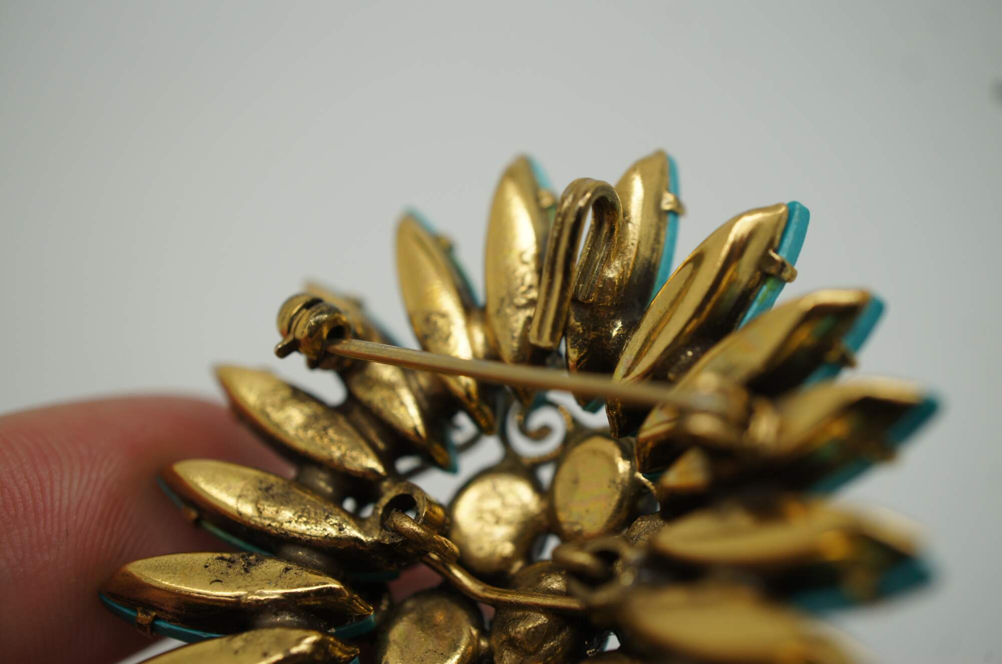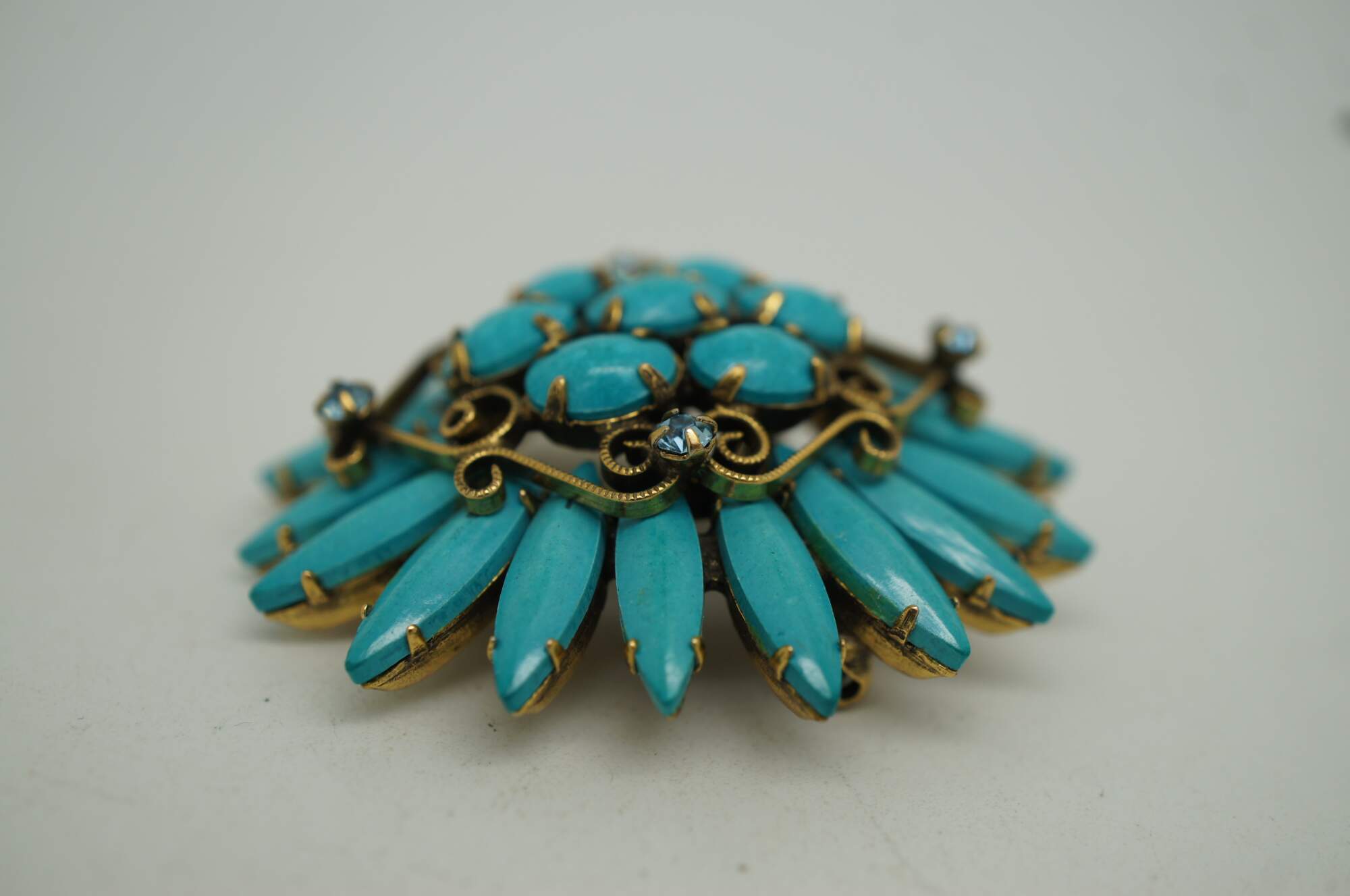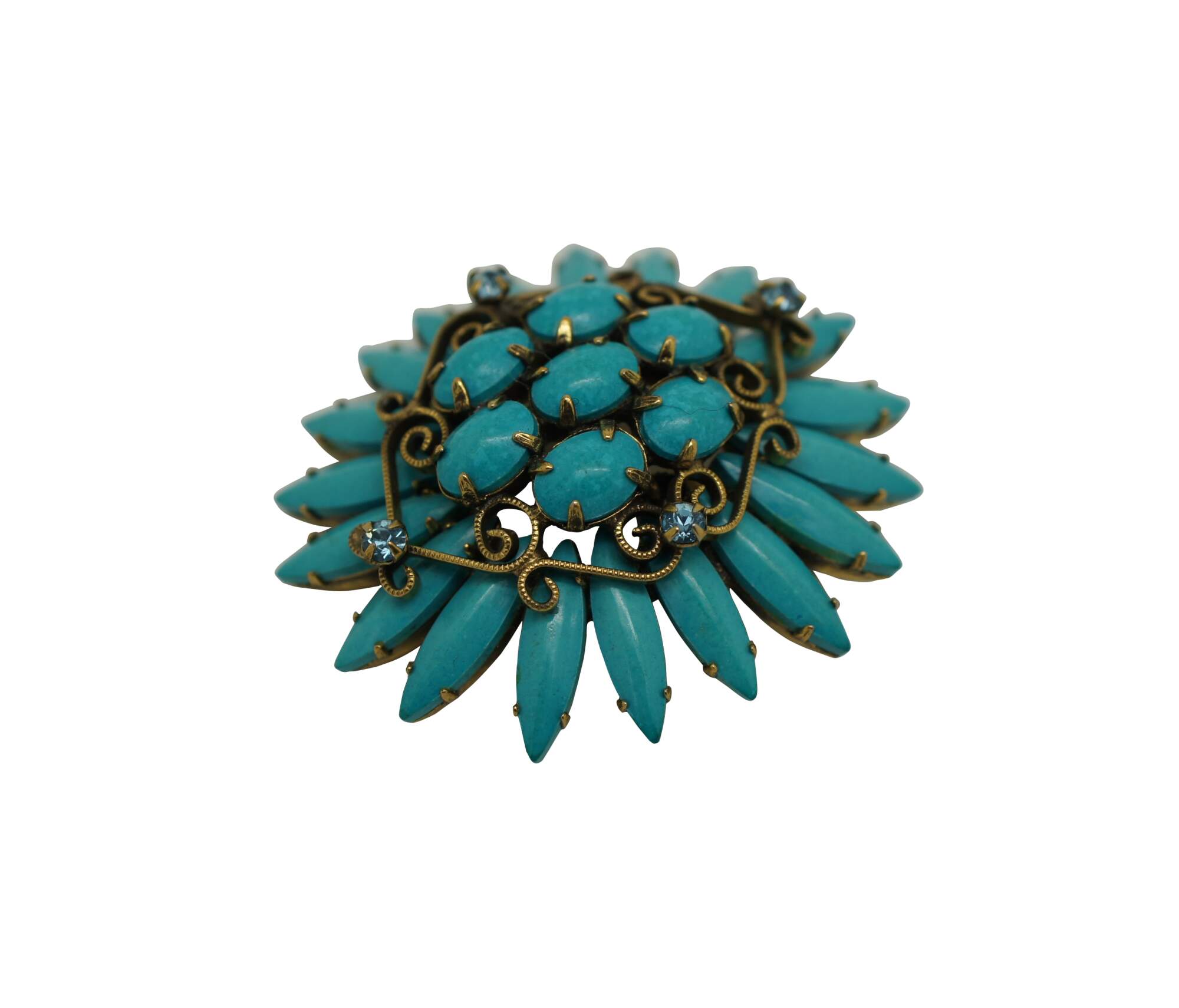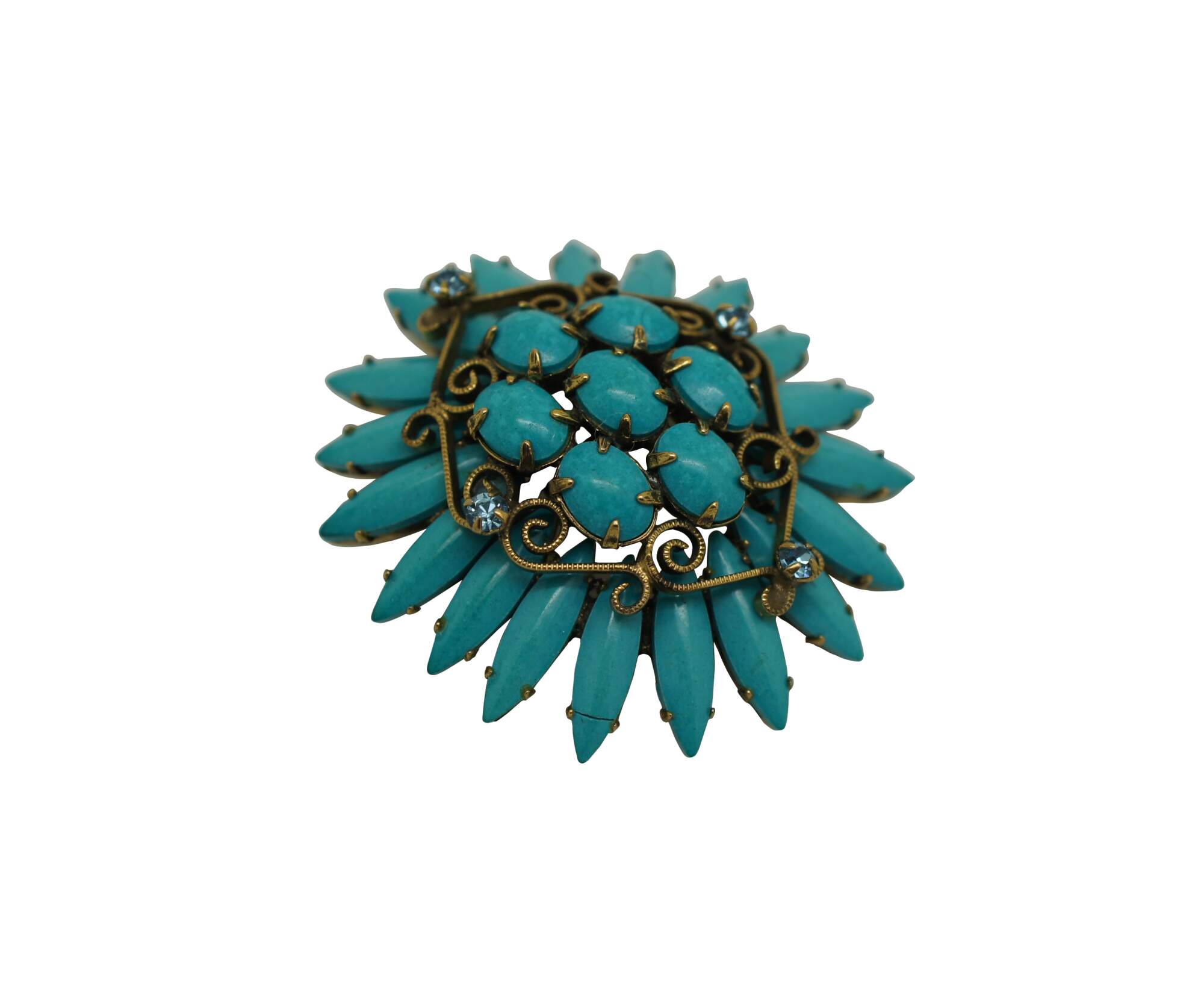 Mid 20th century Original by Robert pin / brooch featuring a Southwest inspired design of turquoise stones arranged in the shape of a flower, accented with scrolling brass and aqua rhinestones.