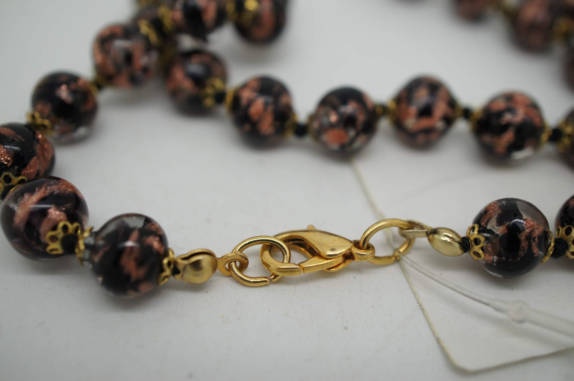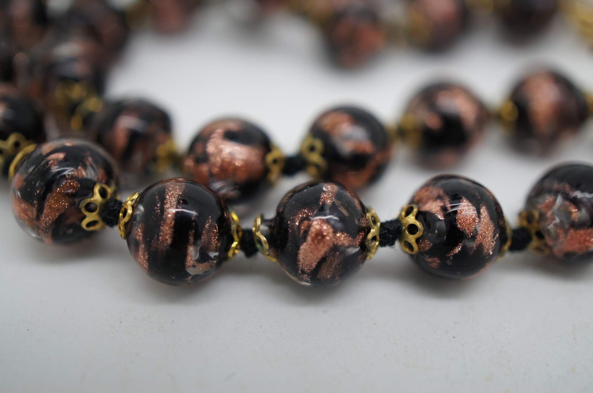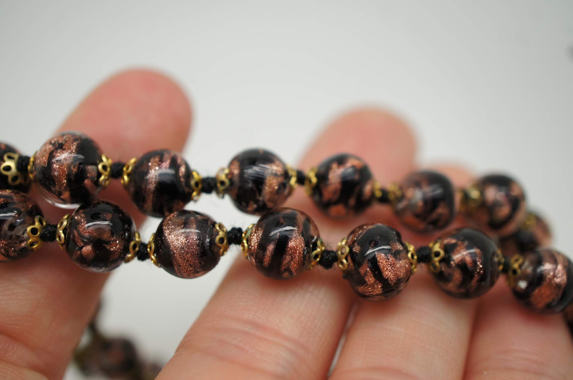 Late 20th century Antica Murrina Ventian art glass beaded neckalce featuring swirling black and bonzy gold dust beads, hand knotted with gold tone caps. Lobster clasp. Includes original sales tag and box.