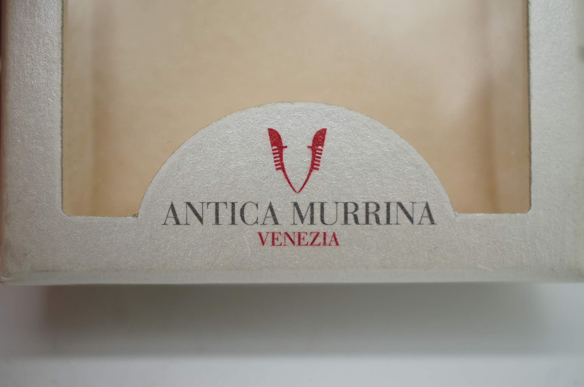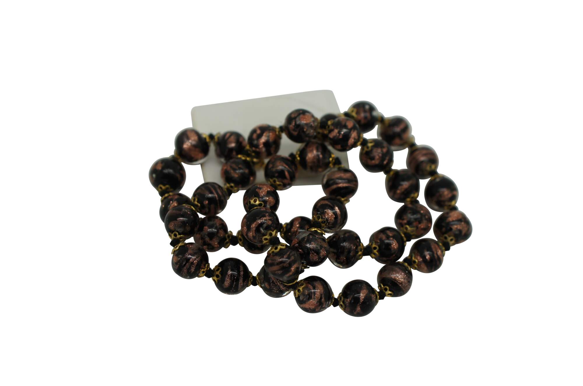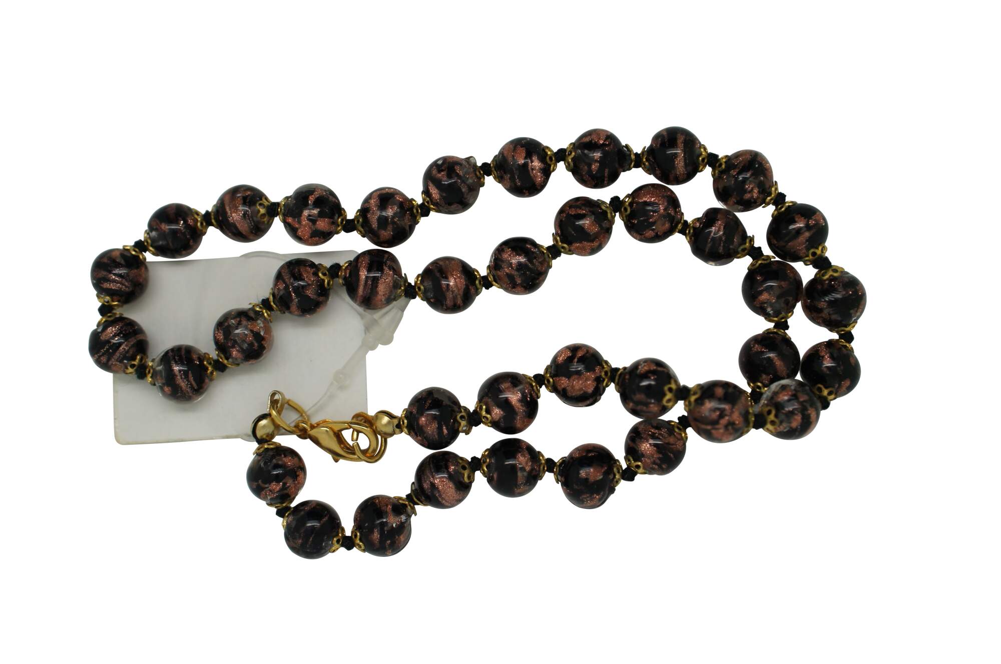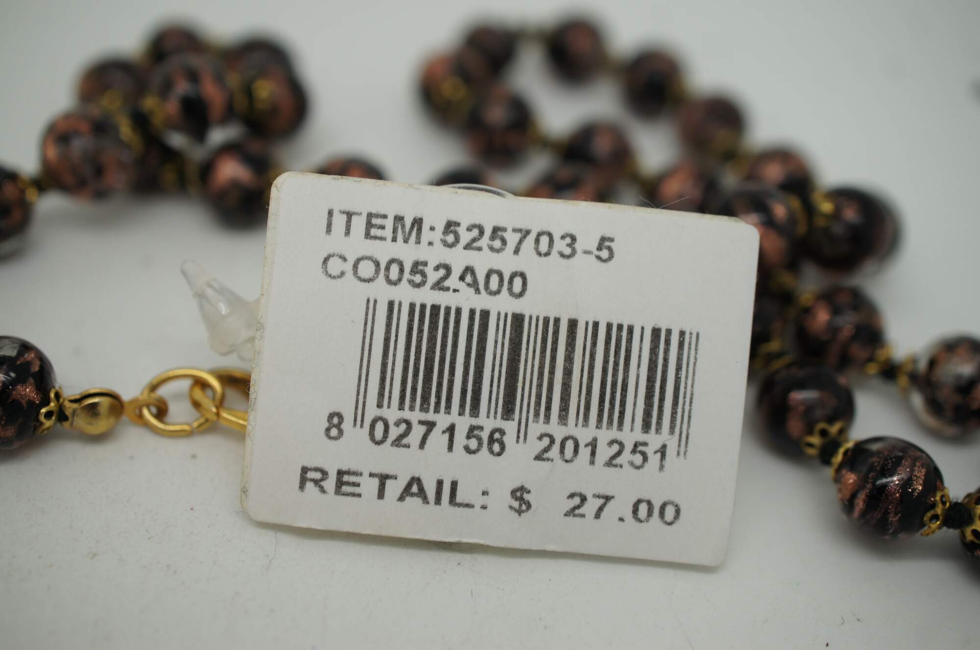 Late 20th century Antica Murrina Ventian art glass beaded neckalce featuring swirling black and bonzy gold dust beads, hand knotted with gold tone caps. Lobster clasp. Includes original sales tag and box.
