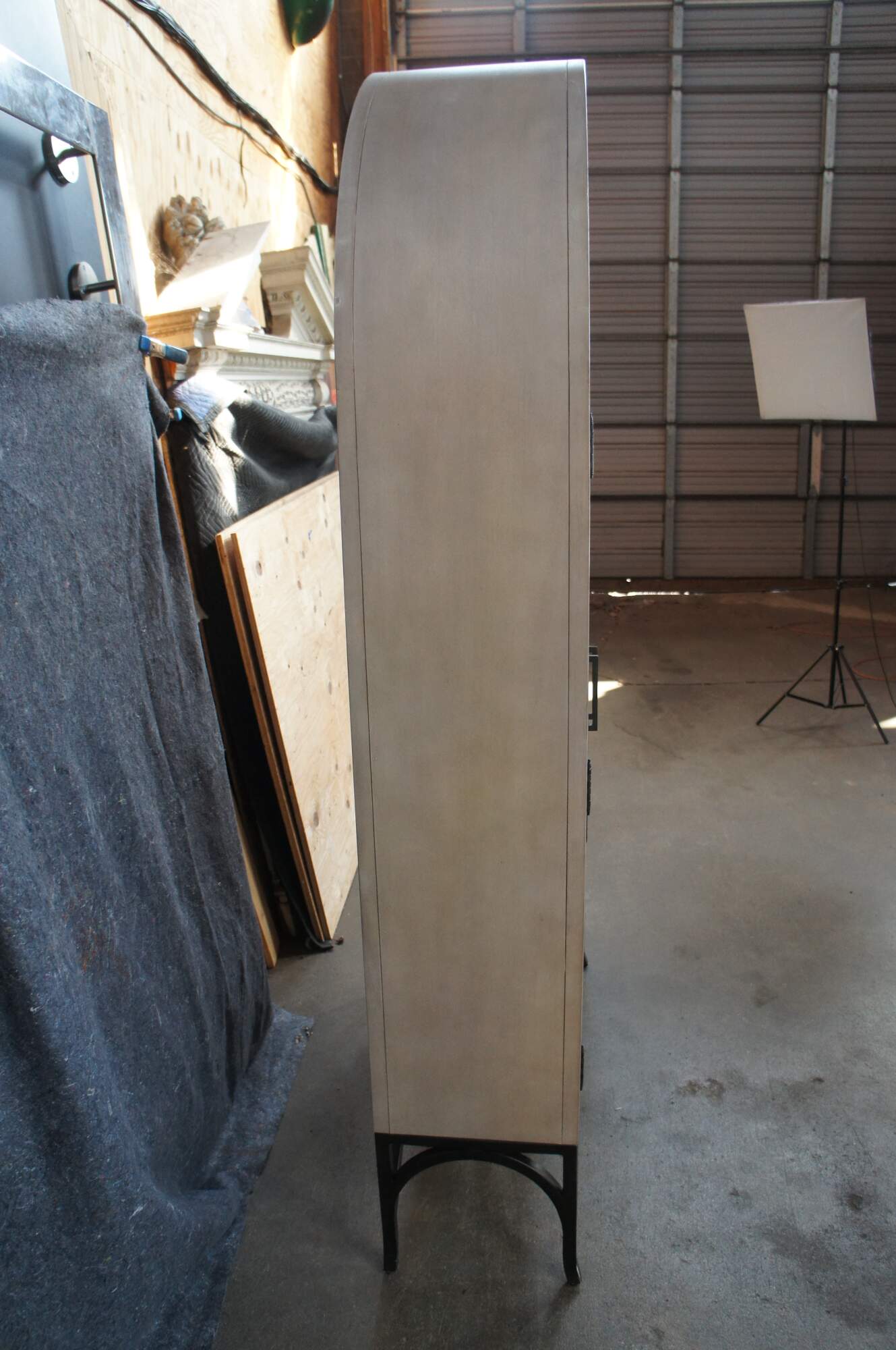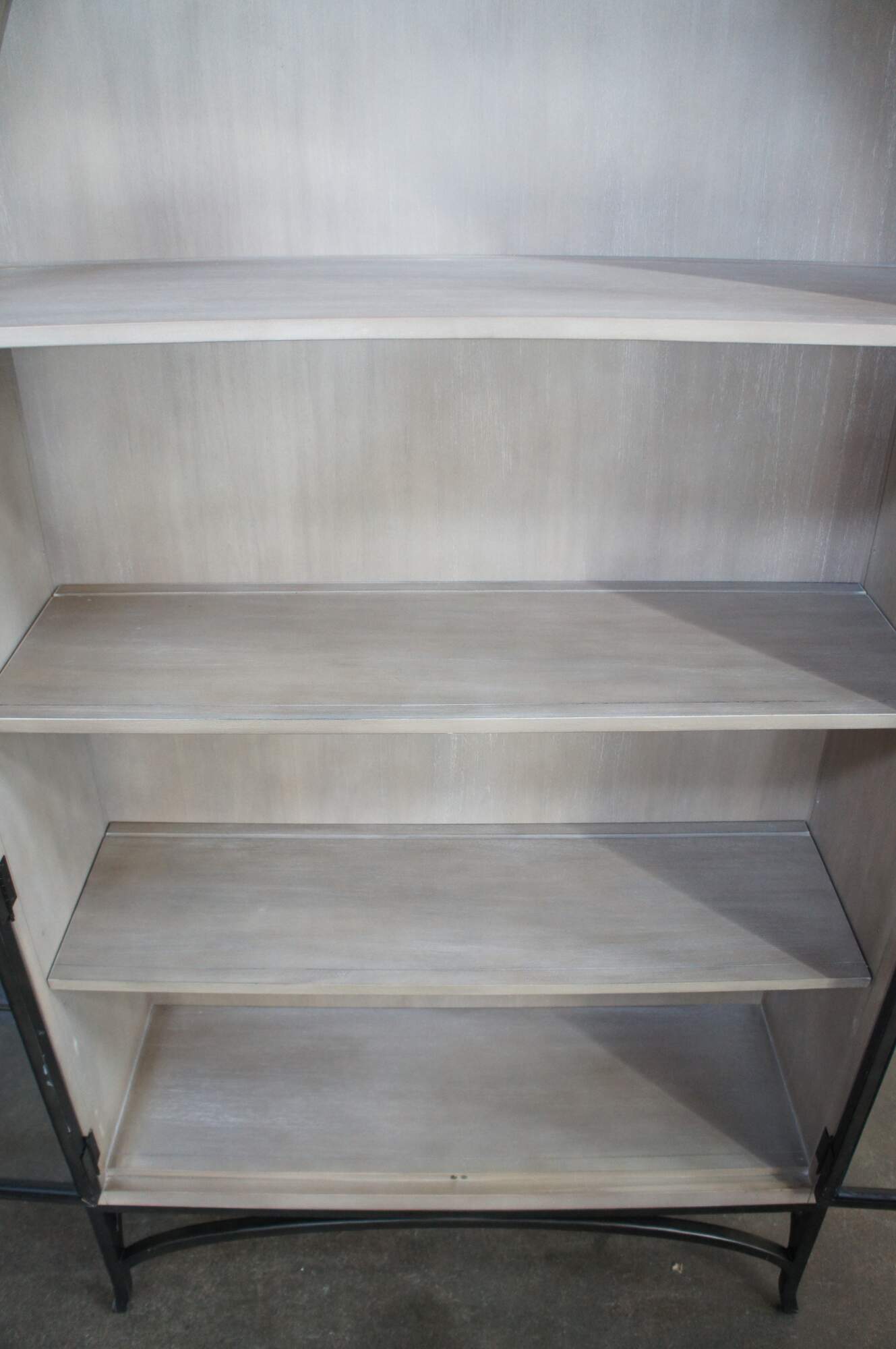The Aris Glass Door Cabinet was inspired by a graceful European Gothic window. The cabinet features a white washed finish with custom-welded, bronze metal frame doors and matching splayed feet. Slender silhouette and shallow 14" depth are perfect for narrow spaces or dining rooms where you need to maximize space. One fixed and two adjustable shelves with plate grooves offer lots of display space.
