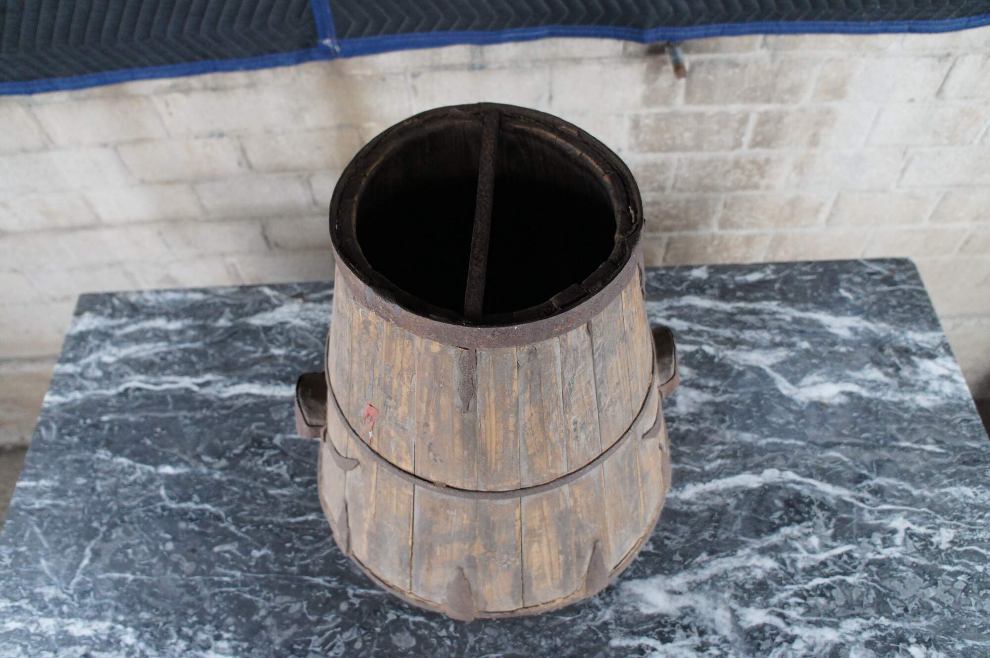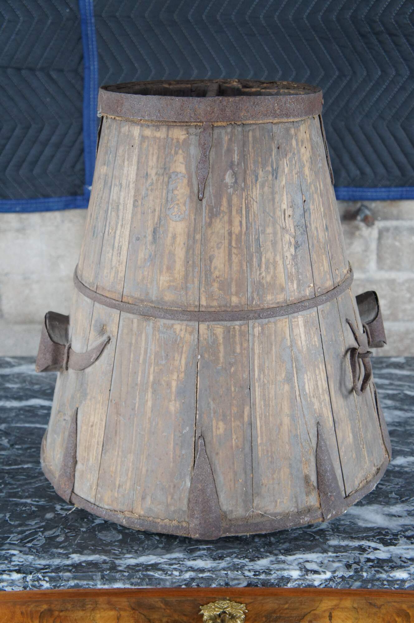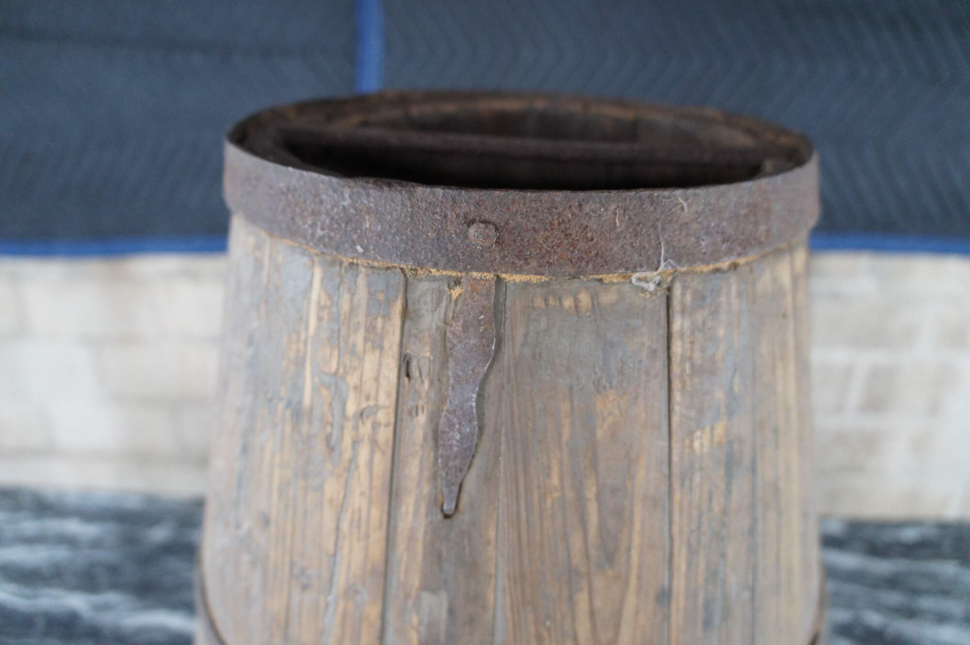 Chinese Shanxi barrel form banded iron wooden rice measure, bucket or basket. Aged with rustic patina and wax import stamp. Circa second half 20th century.