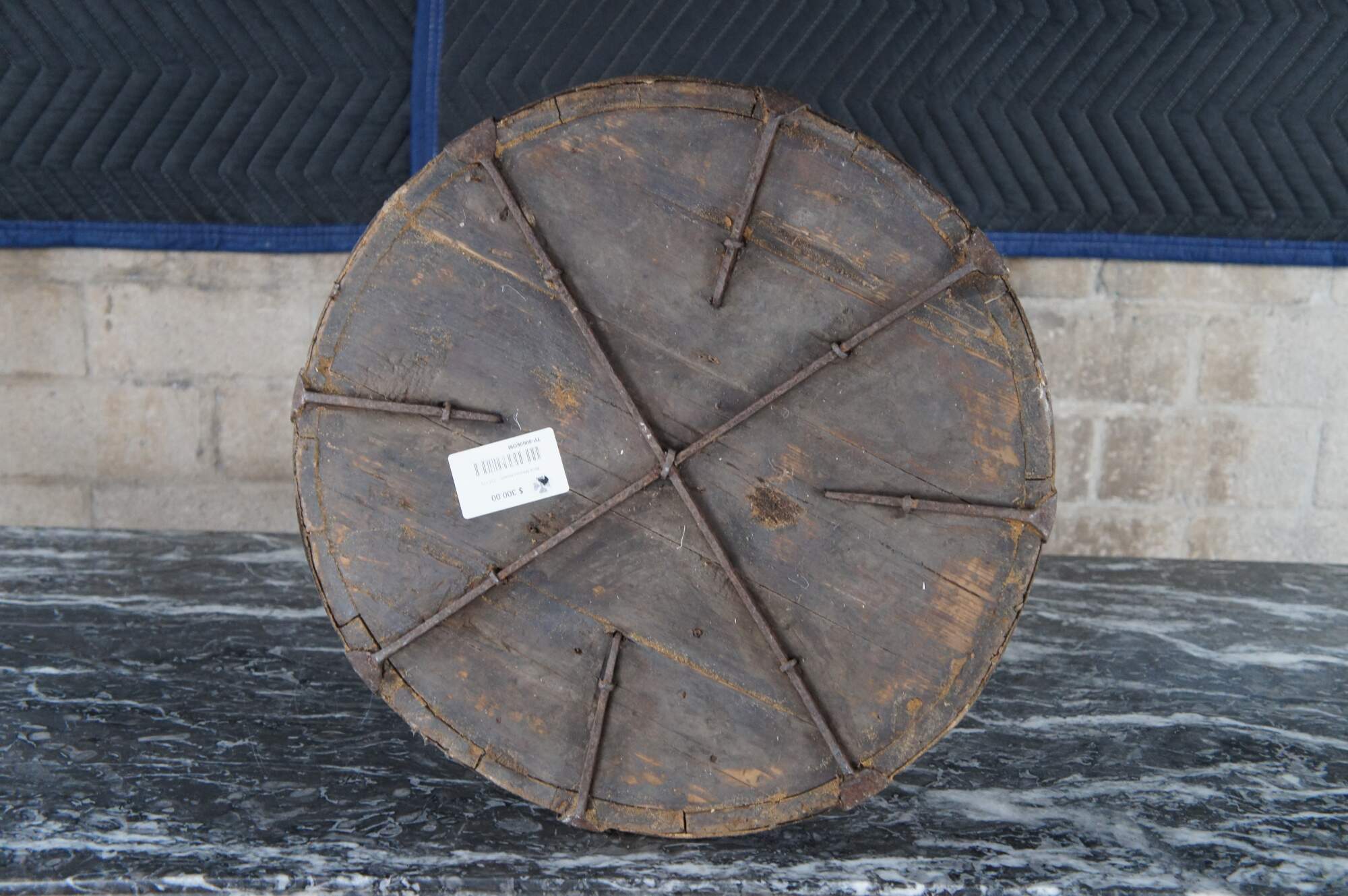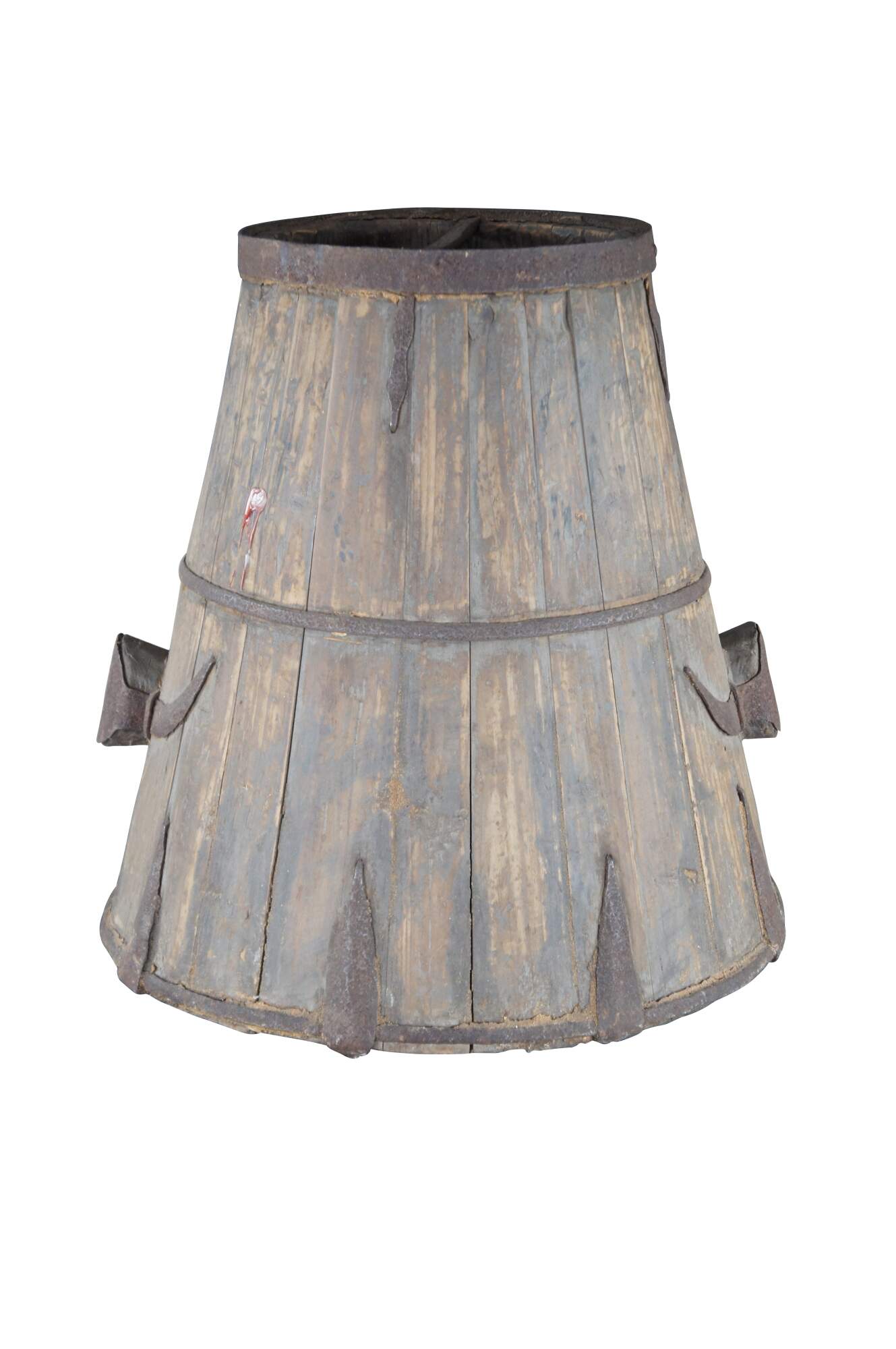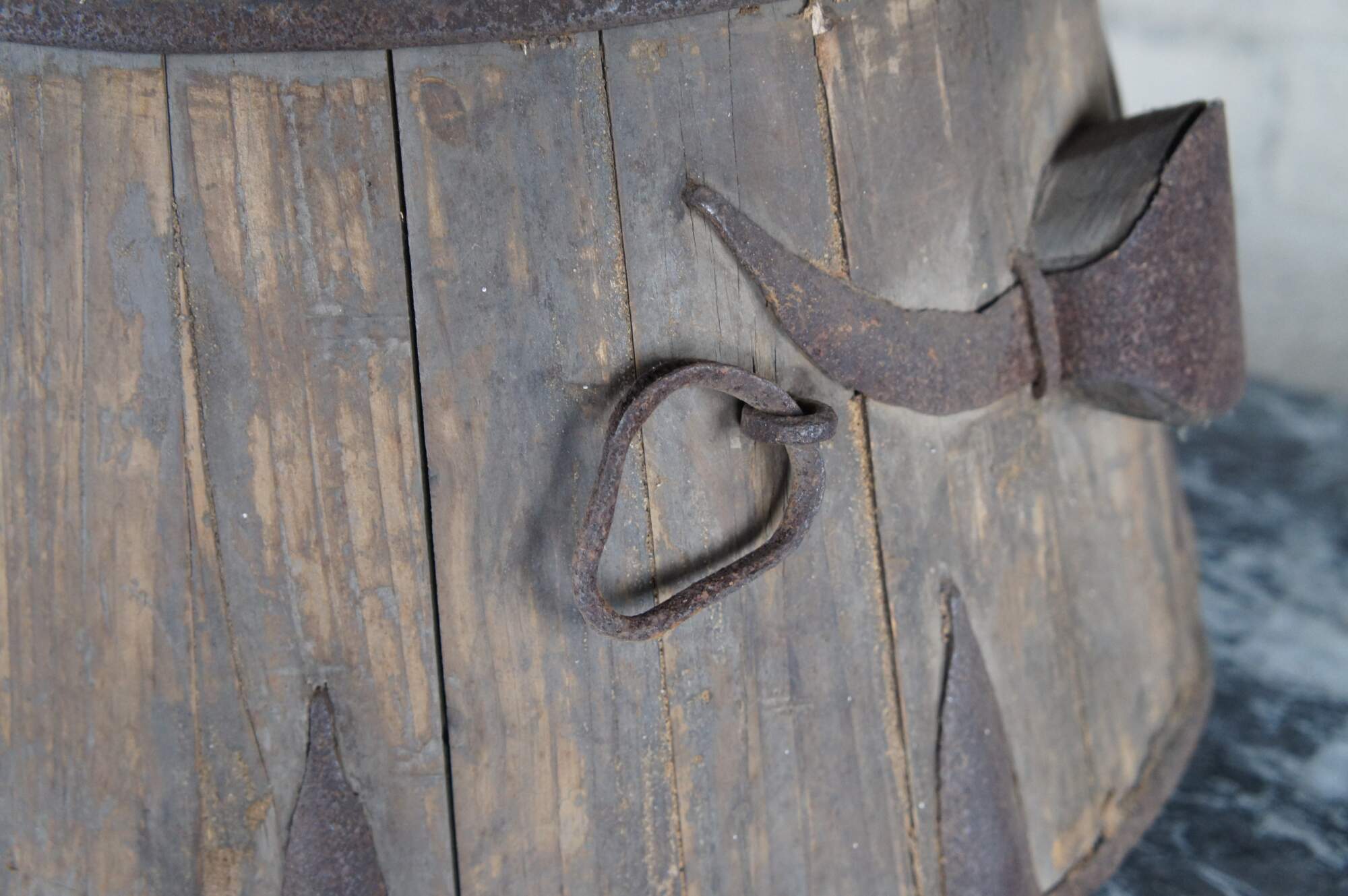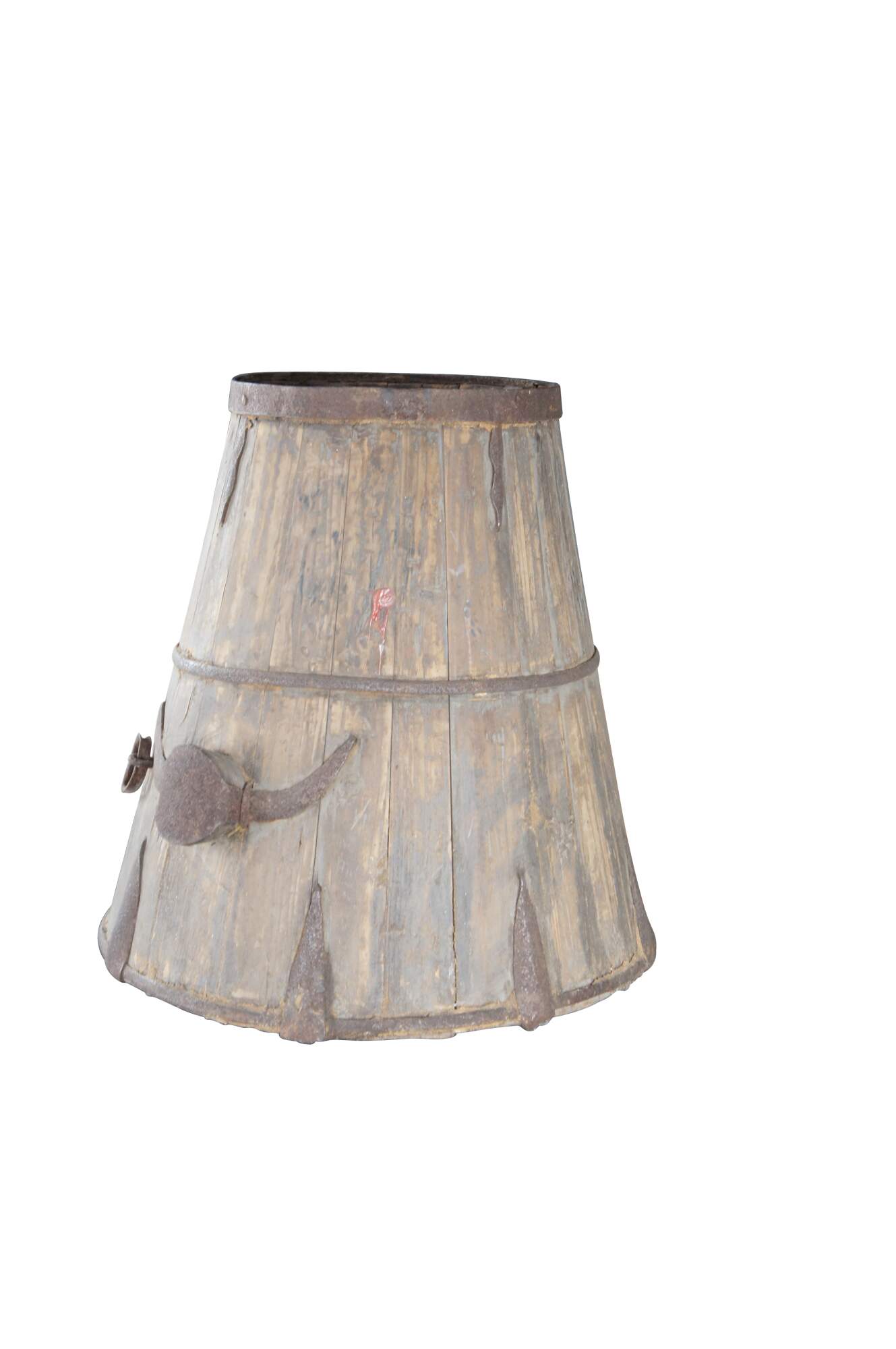 Chinese Shanxi barrel form banded iron wooden rice measure, bucket or basket. Aged with rustic patina and wax import stamp. Circa second half 20th century.