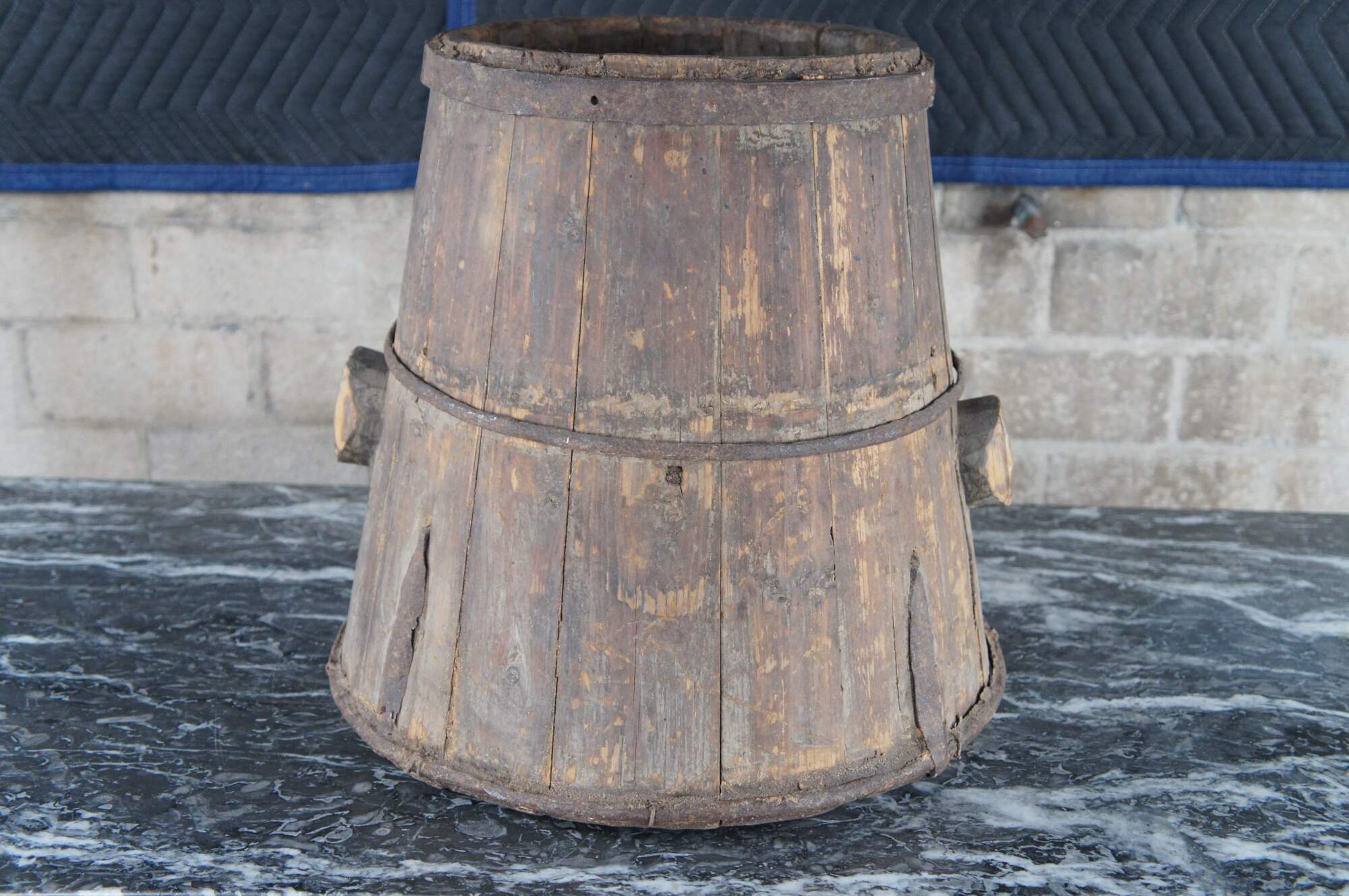 Chinese Shanxi barrel form banded iron wooden rice measure, bucket or basket. Aged with rustic patina and wax import stamp. Circa second half 20th century.