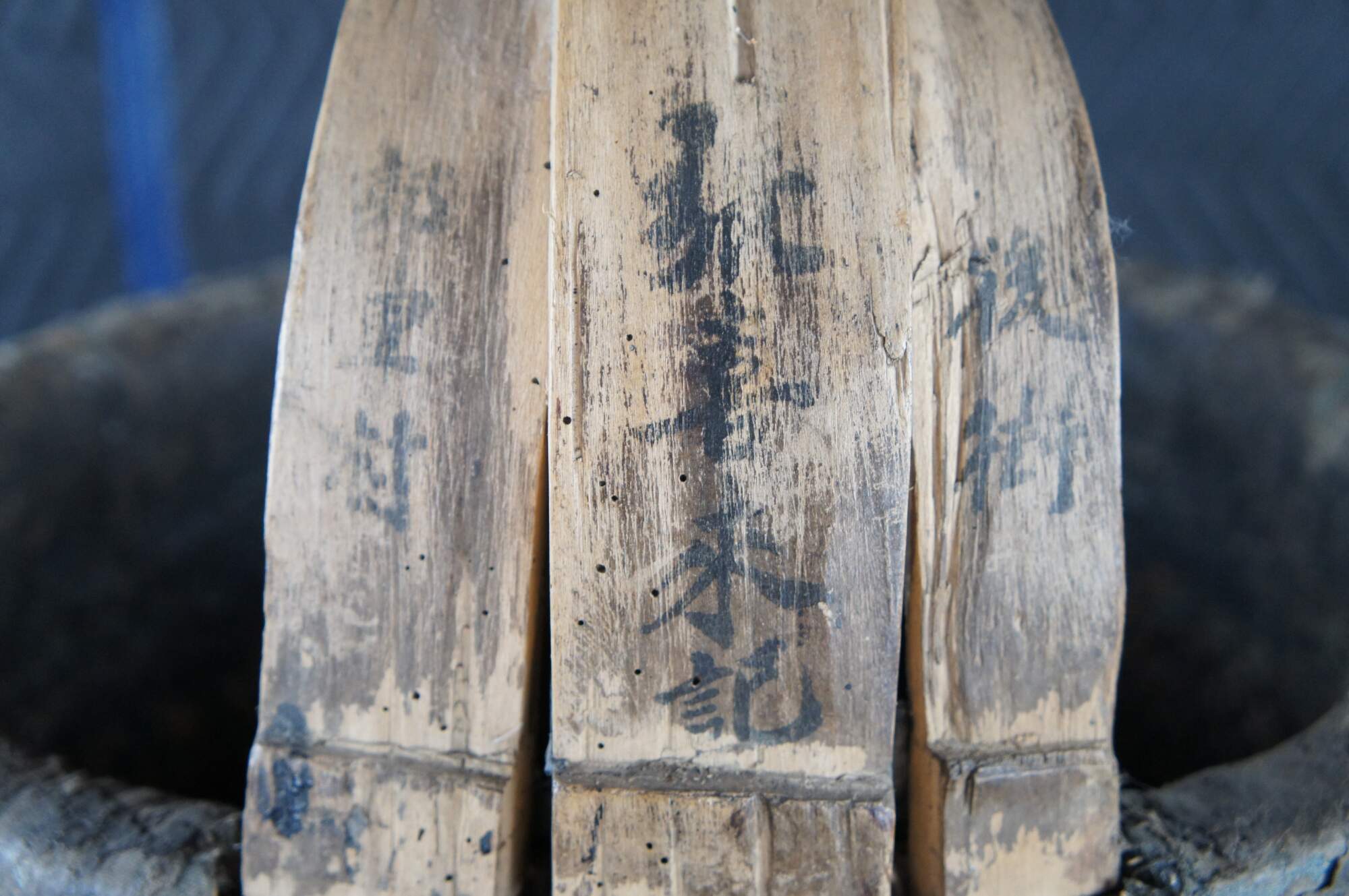 Early 20th Century Chinese Rice Basket. Made from woven reed with a bentwood handle and caligraphy.
