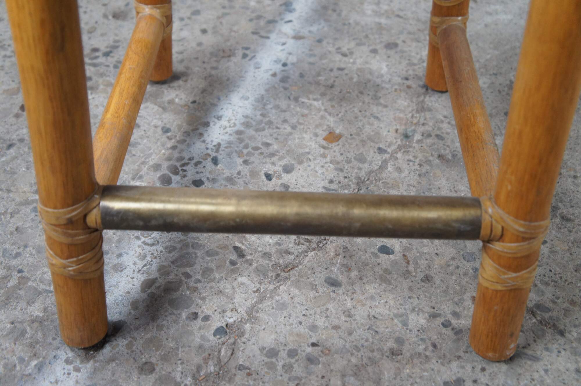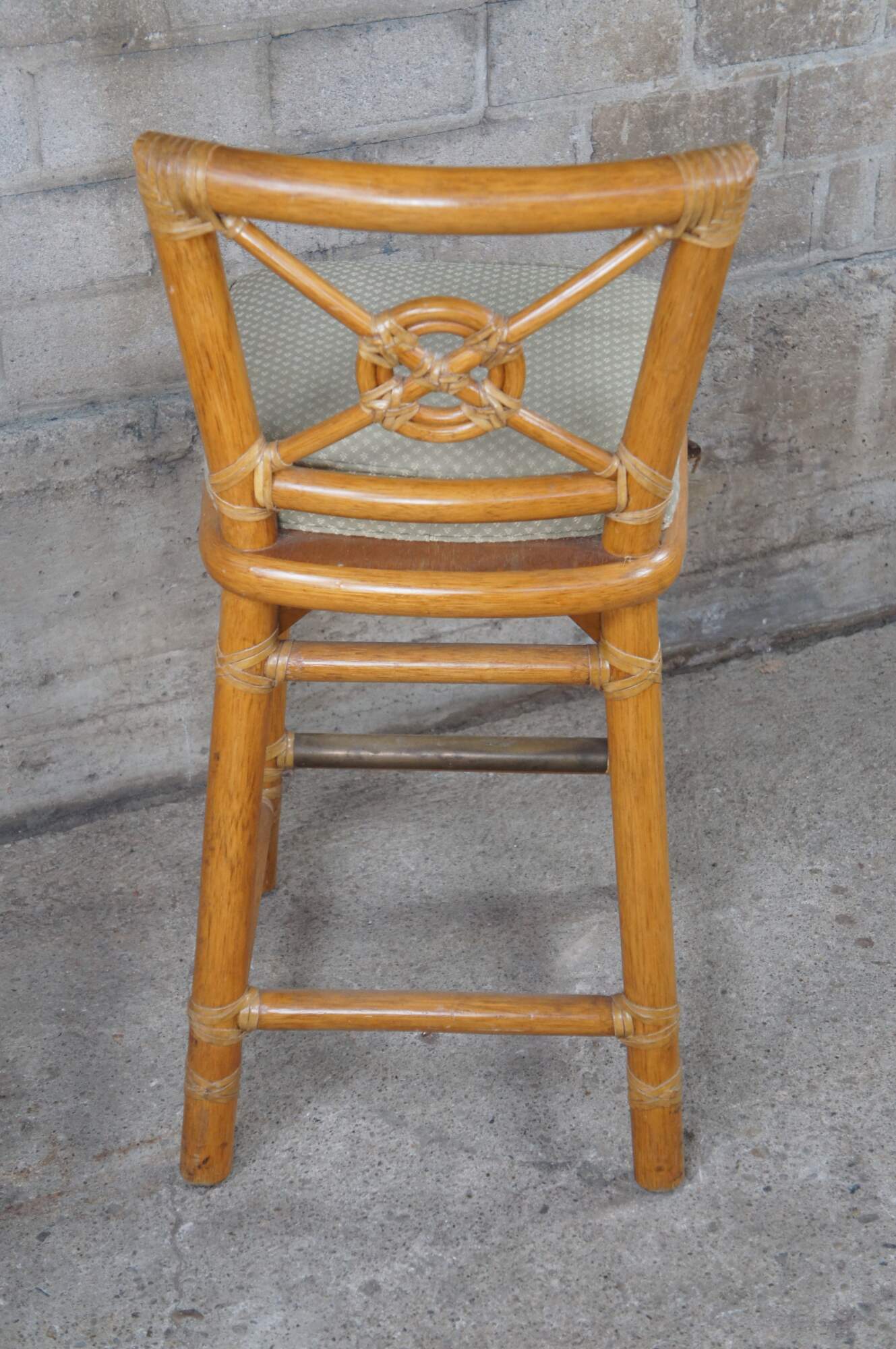 Set of Iconic target back bar stools by The McGuire Furniture Company. Organic Modern with Bohemian design. Features a faux bamboo and rattan construction with fabric seats. the stools have strong legs with solid joinery and brass foot rests. Seats are green with foliate design. Marked along underside with McGuire brass tag.