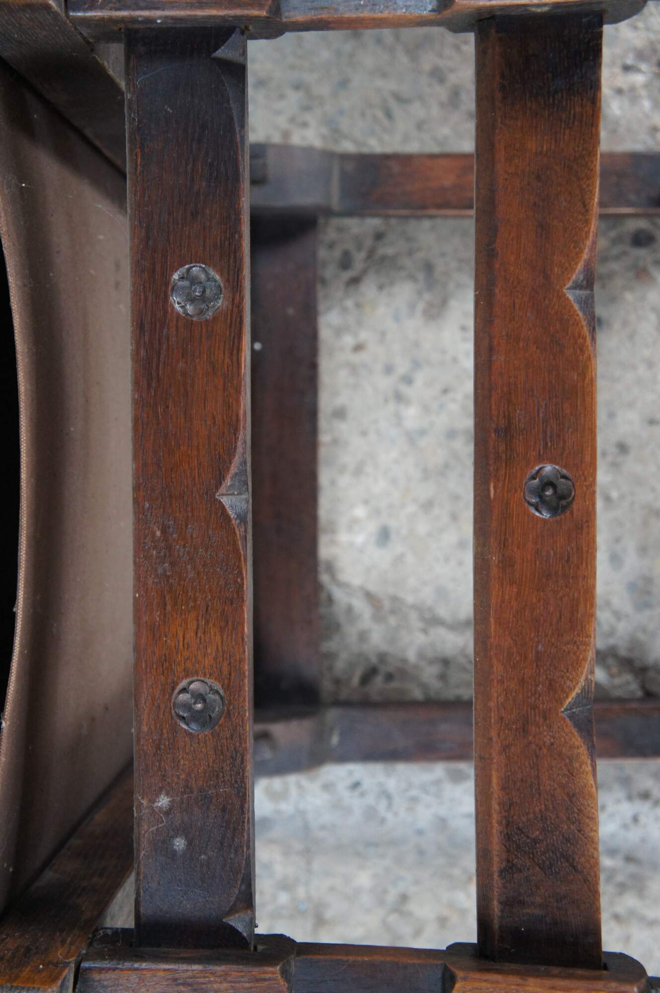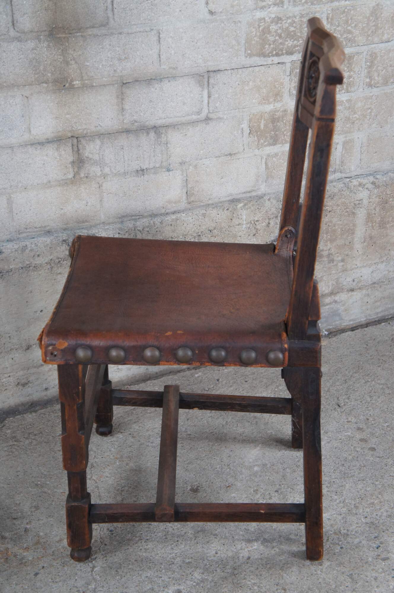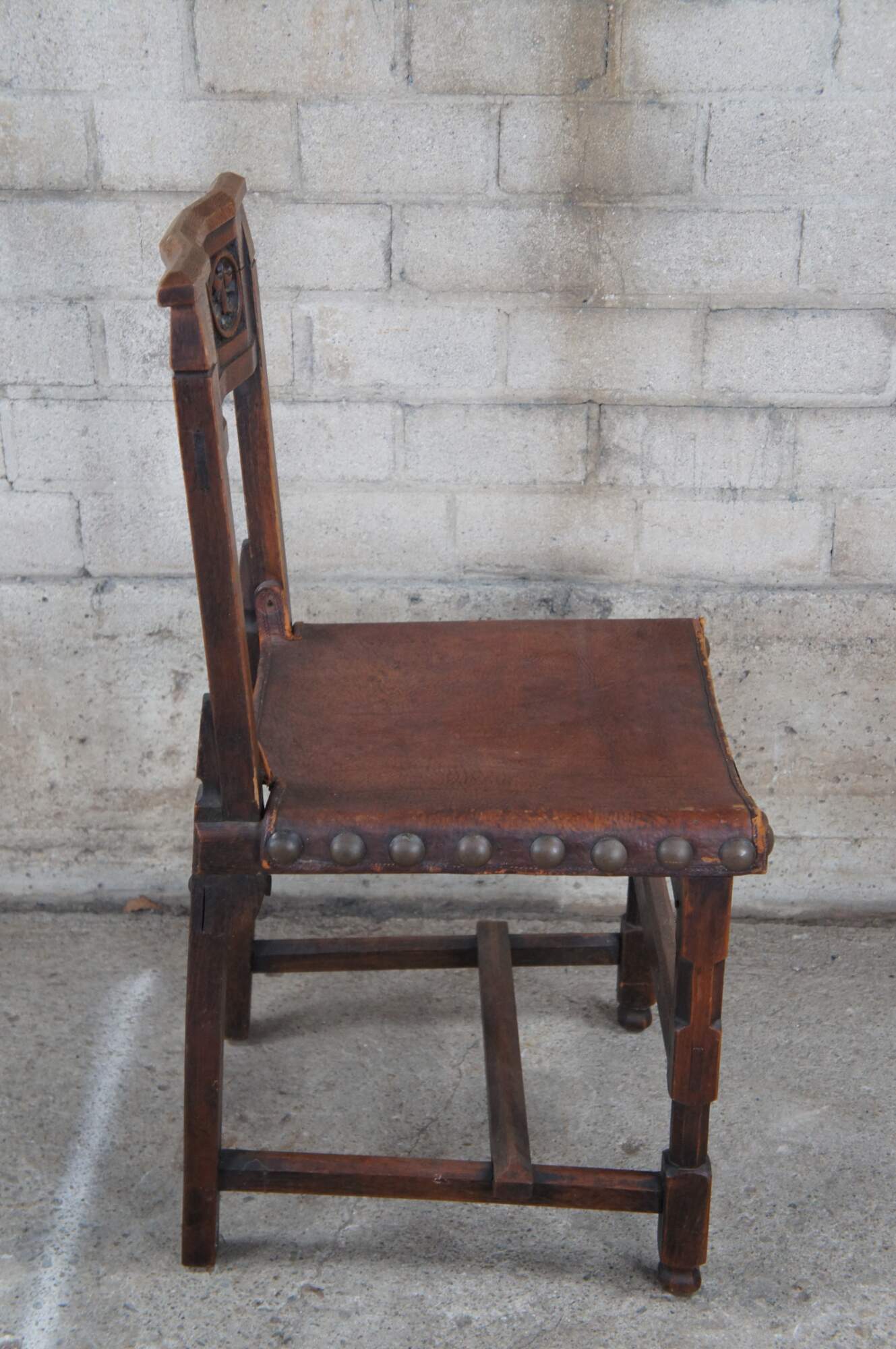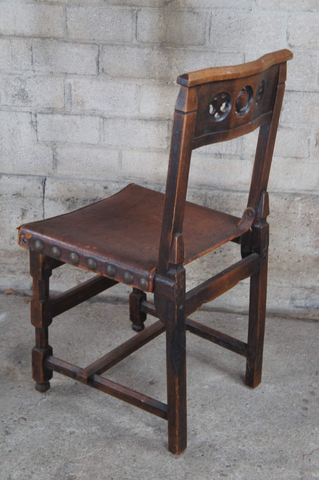 Antique spanish revival side chair. Made of quartersawn oak featuring mortise and tenon joinery with Celtic inspired design of reticulated / pierced florals / flowers and leaves over a thick leather seat with large nailhead trim.