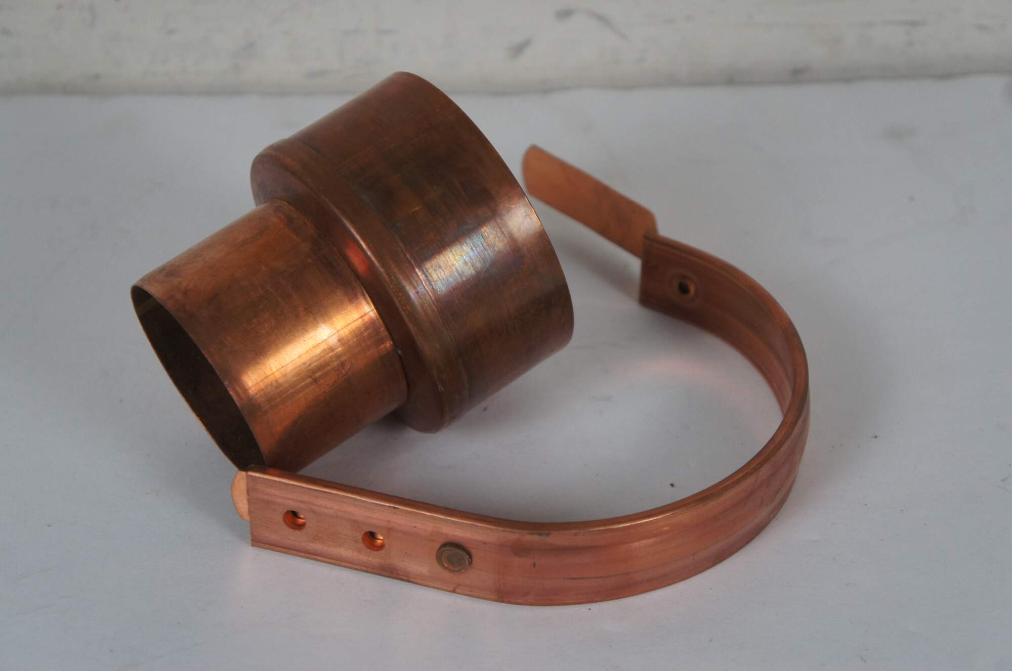 Late 20th century Minoletti copper downspout gutter segment, outlet embossed with a sun, and half-spherical end caps. Includes base connector and one support bracket. Numbered 330/100.