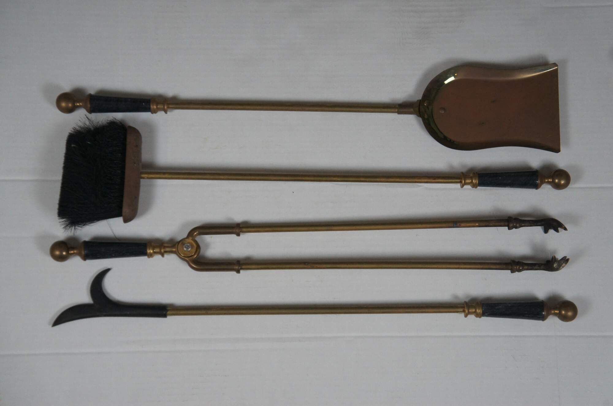 Mid to late 20th century five piece set of fireplace / hearth tools and stand by Decorative Crafts Inc, item number 2921. Made of brass with black marble base and tool grips with round finials. Set includes stand, shovel, poker, tongs, and brush.
