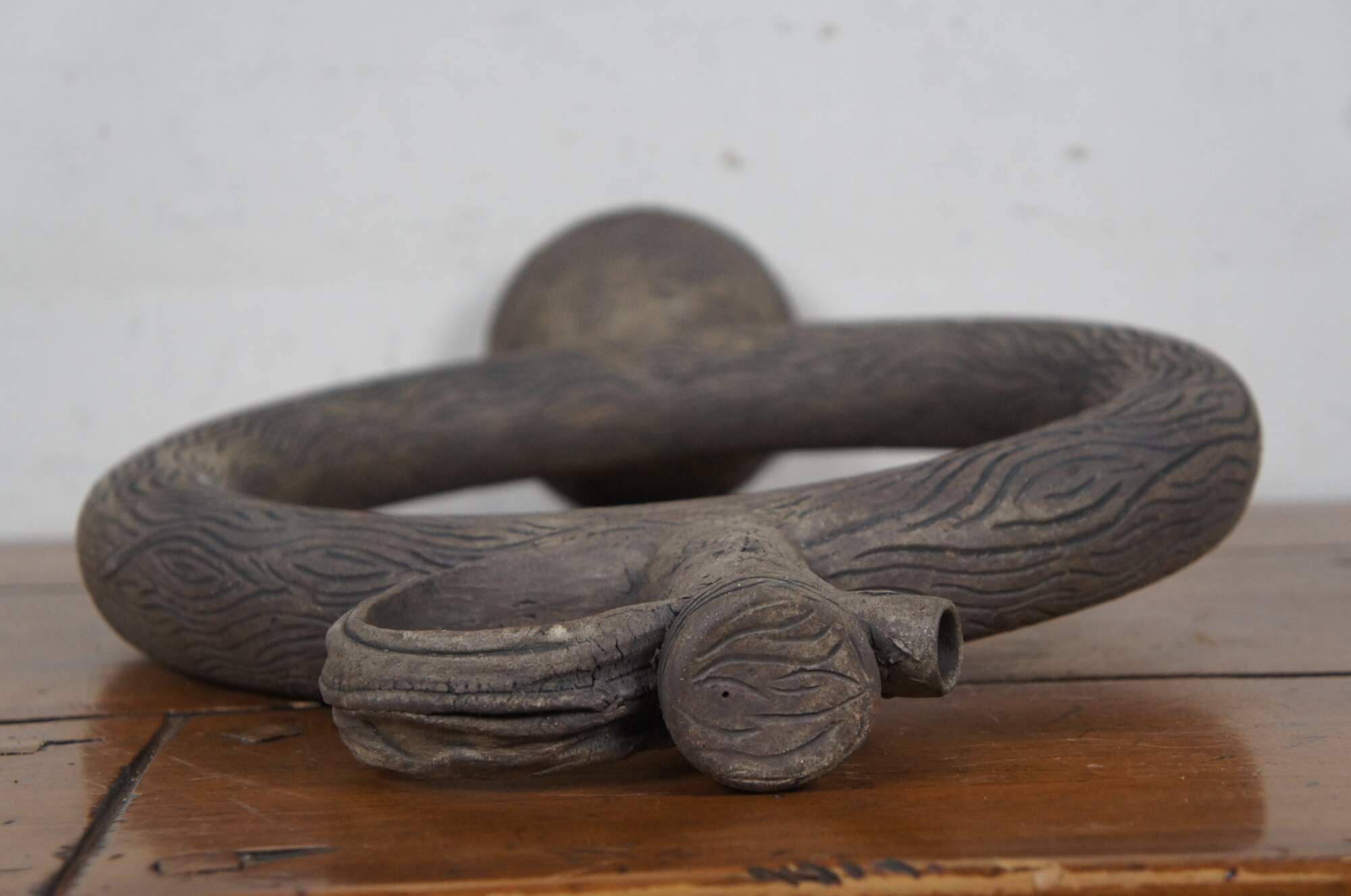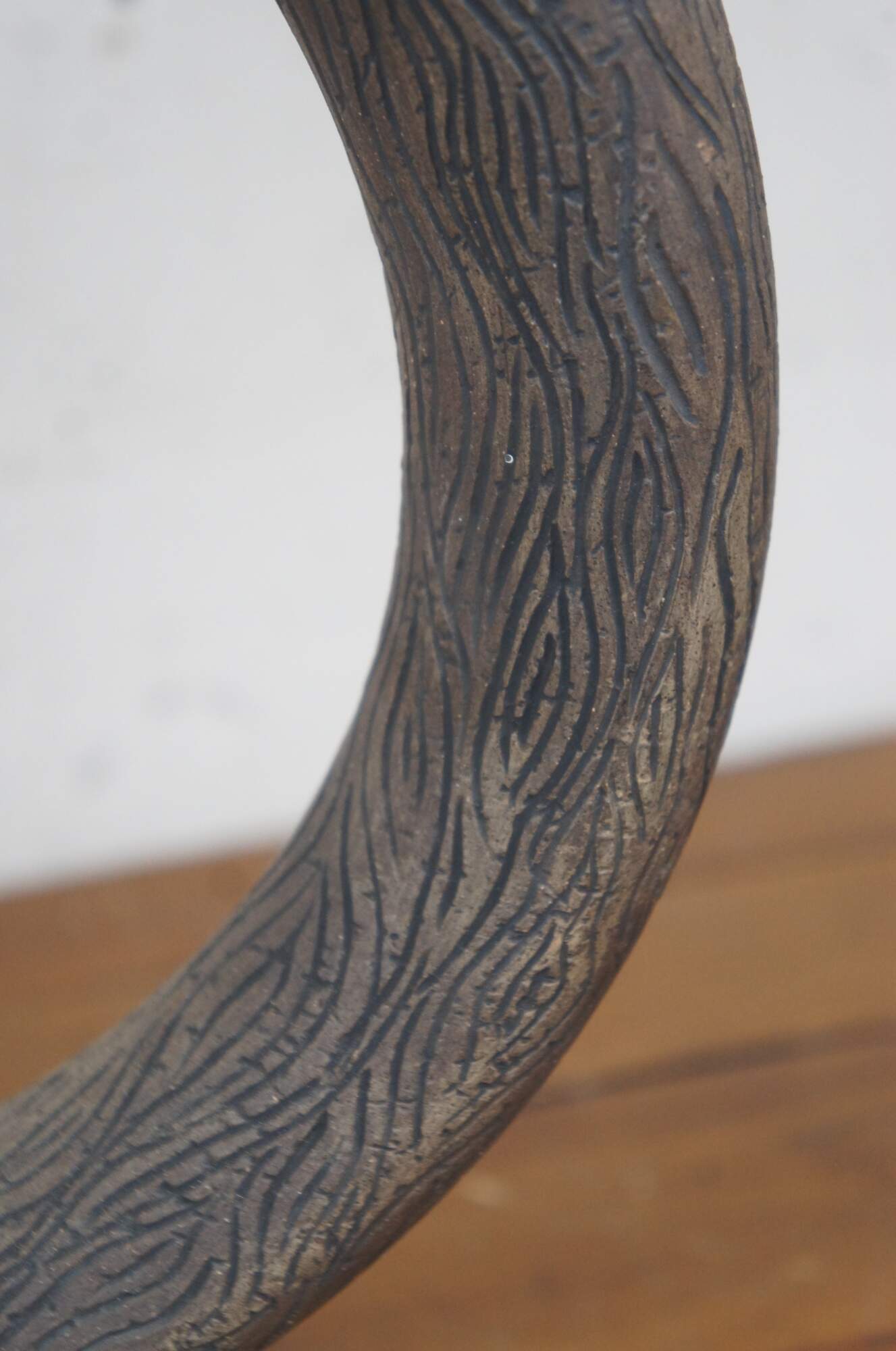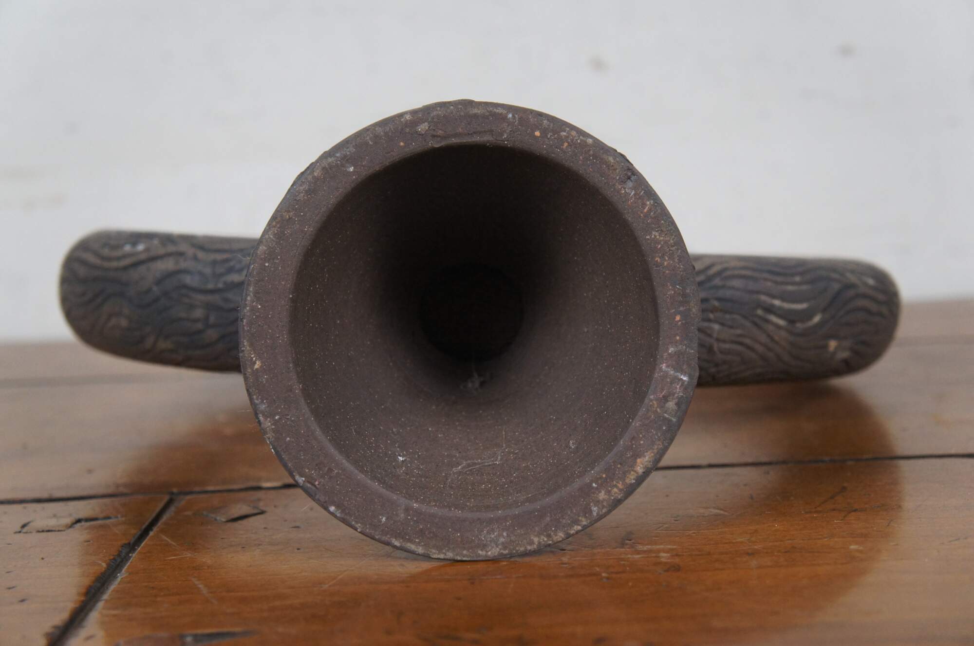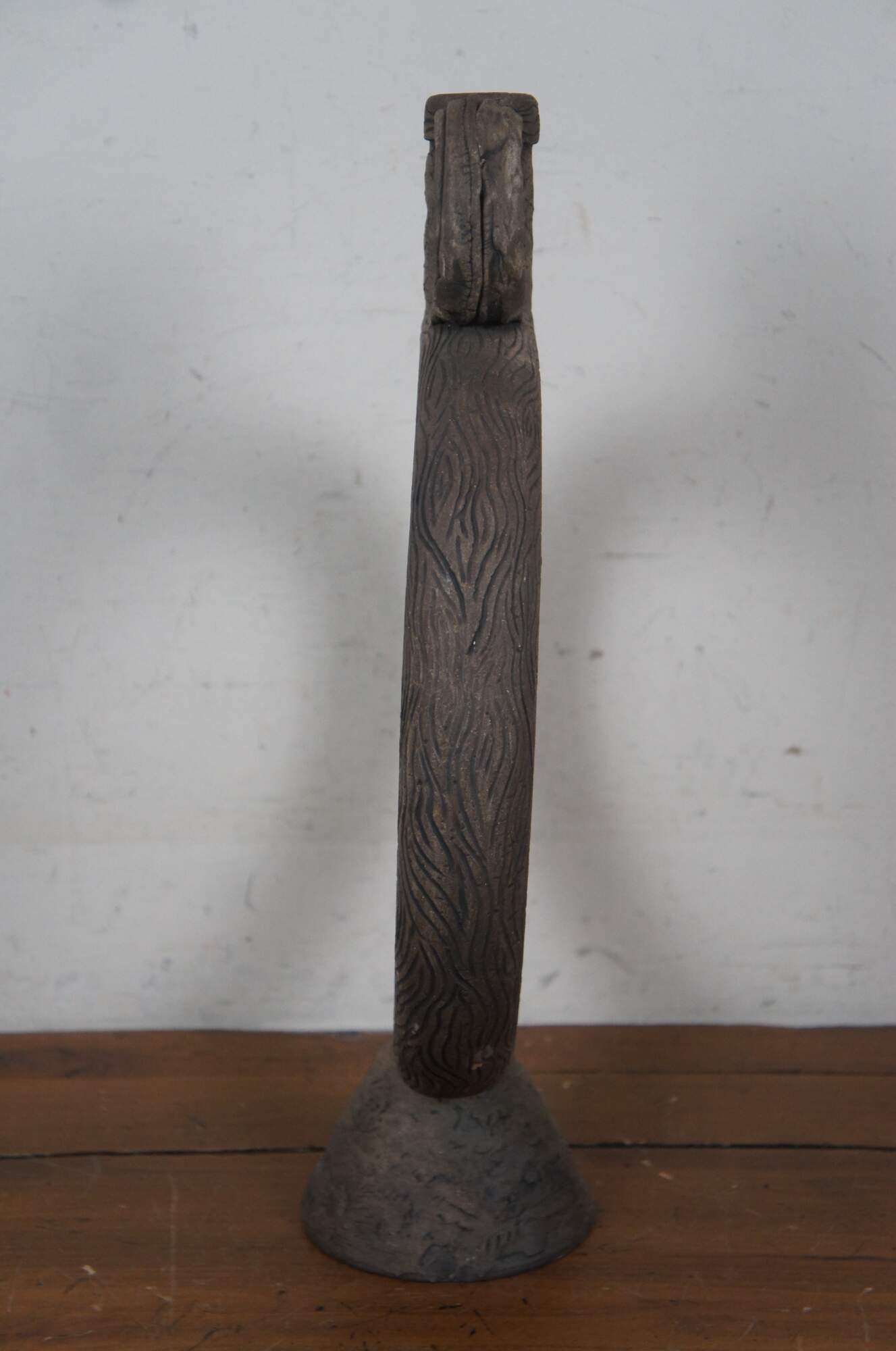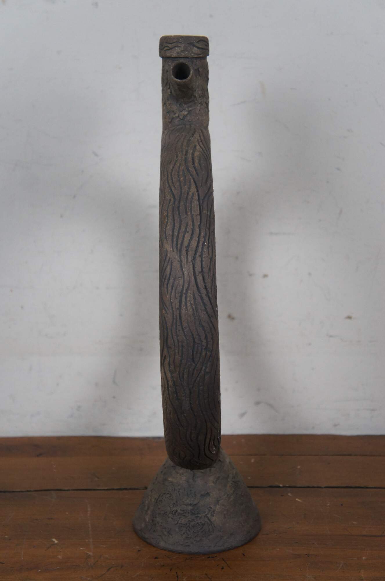 20th century unglazed brown art pottery decanter jug / bottle / pitcher with conical base, faux stopper, and handcrafted wood grain / tree bark texture.