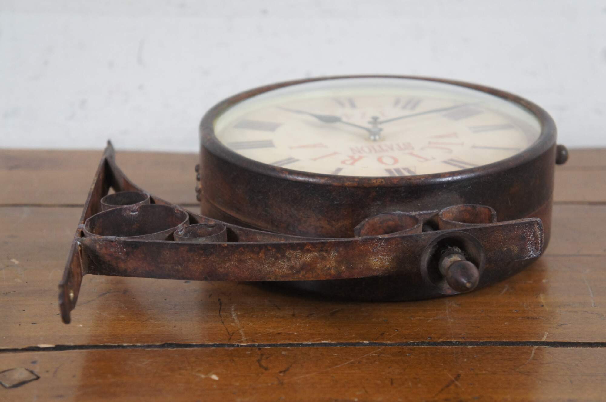 Late 20th century double sided railway clock styled after the famous clock at Victoria Station, London. Wrought metal wall mounted support and case in a dark bronze finish. 8 inch diameter printed face with faux distressing, Roman numerals, and the words Victoria Station 1747 in orange. Black metal hands. Young Town Quartz, battery operated movement.
