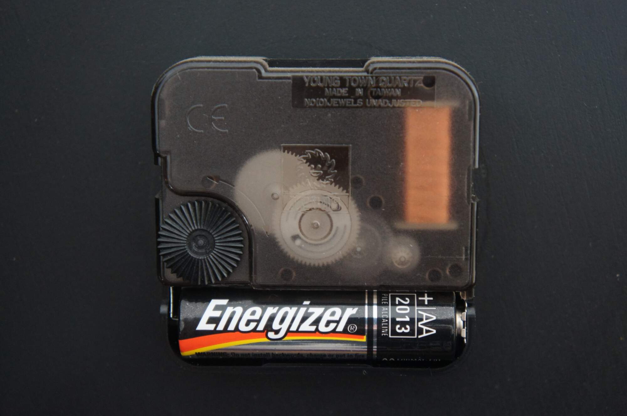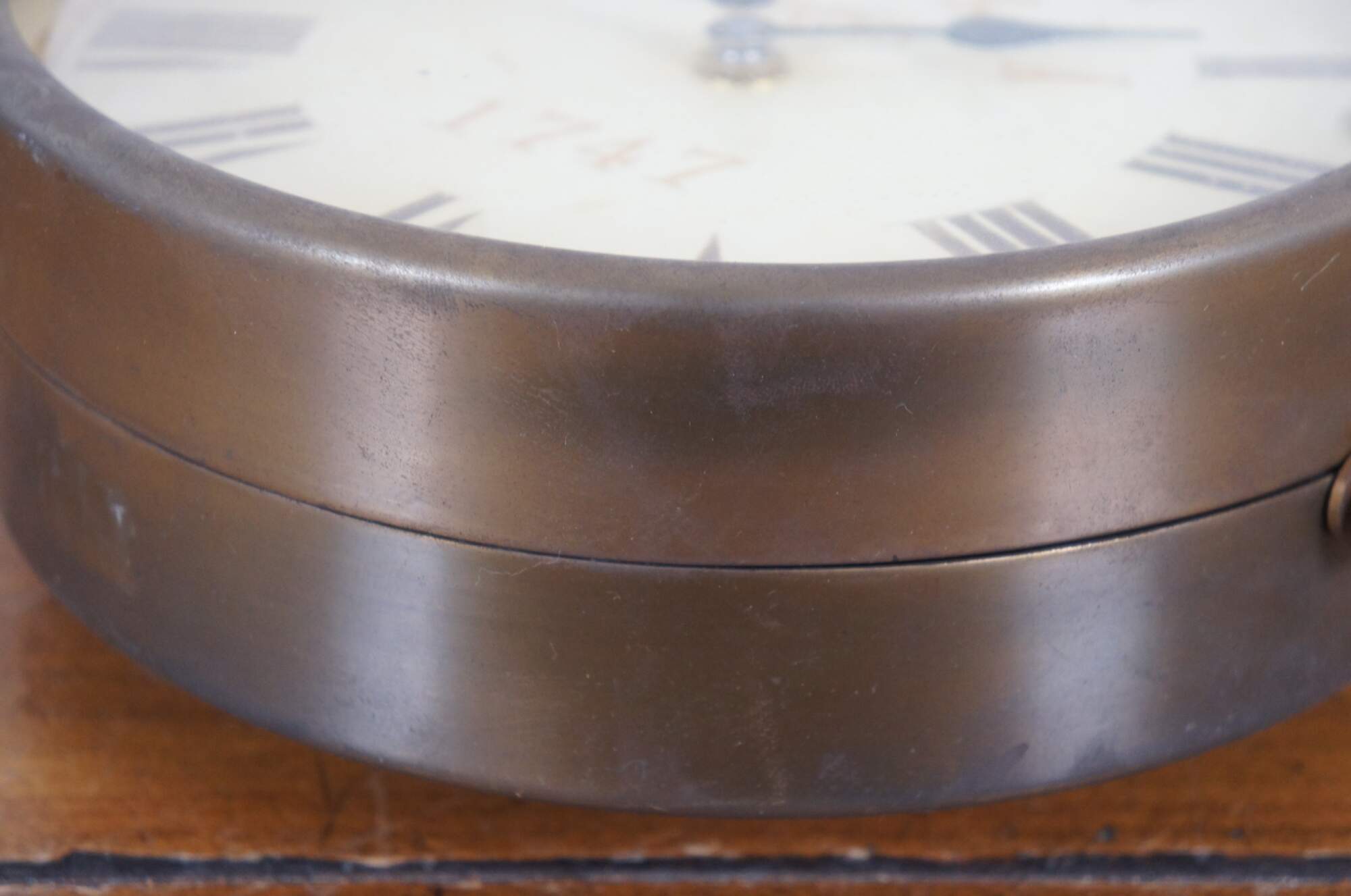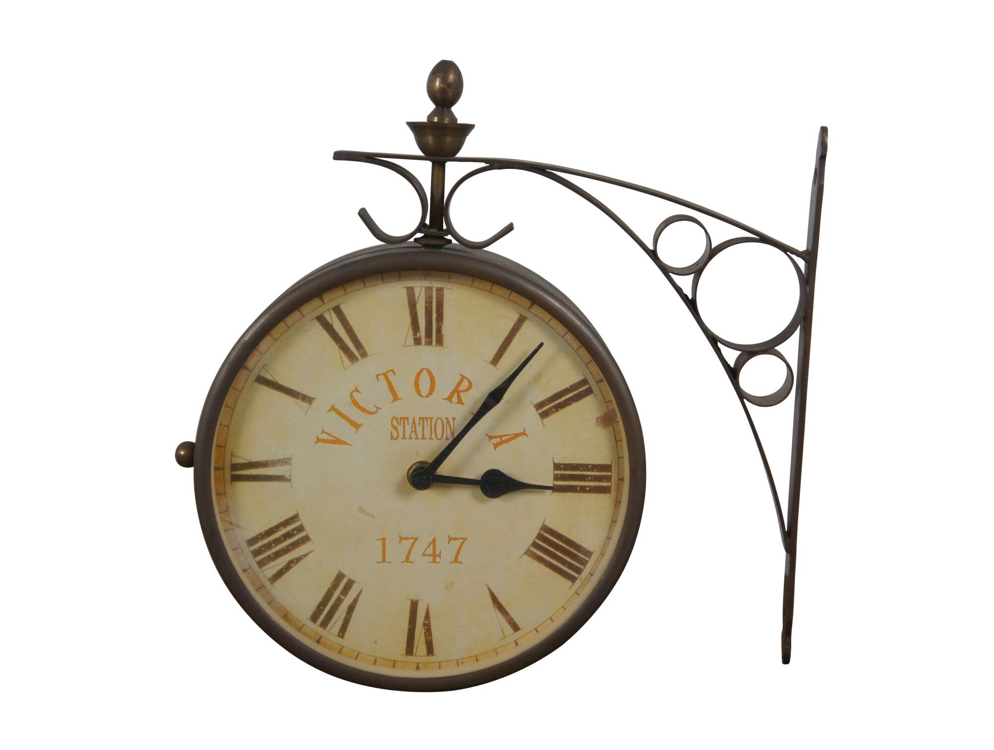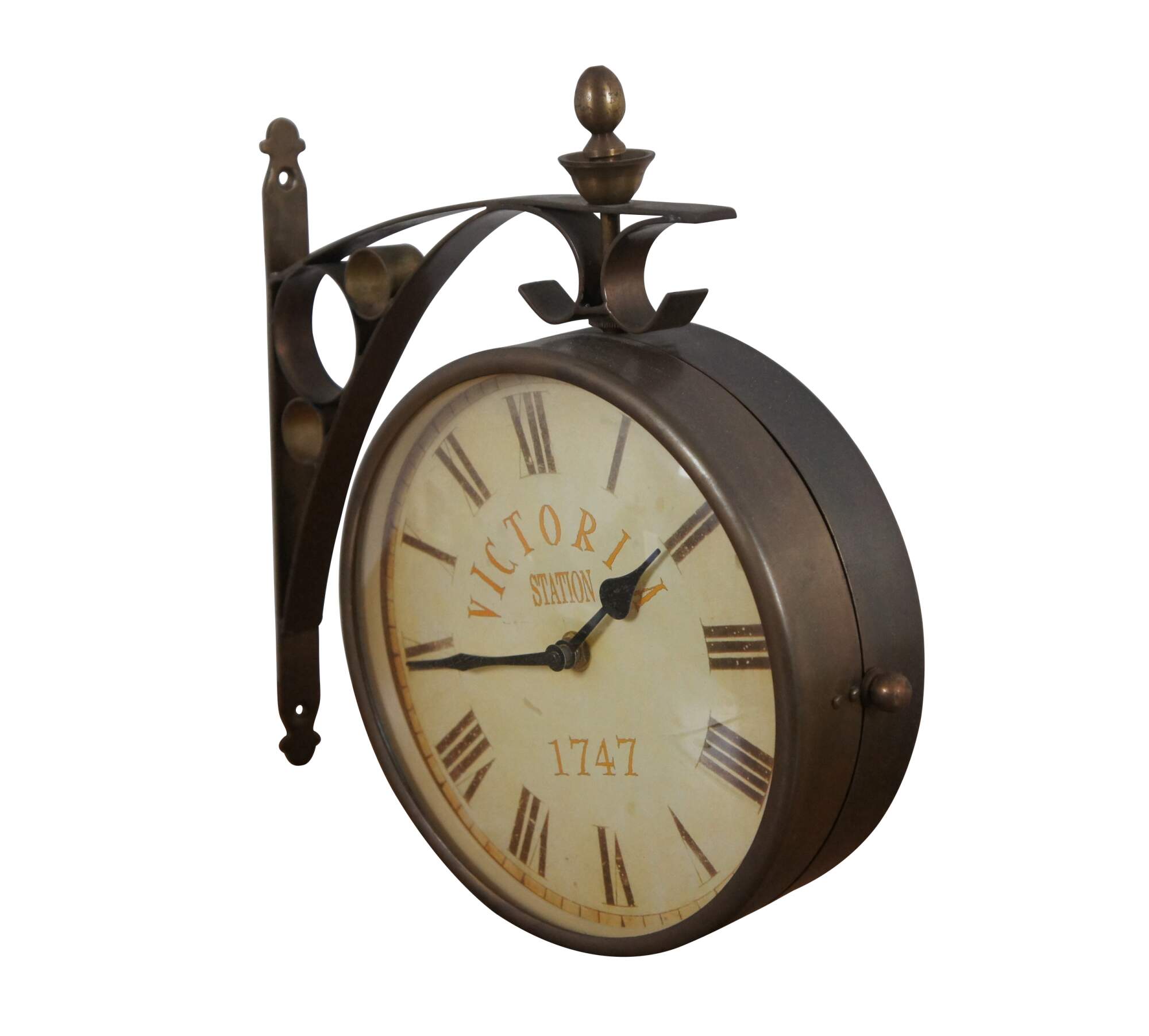 3 Available - Late 20th century double sided railway clock styled after the famous clock at Victoria Station, London. Wrought metal wall mounted support and case in a dark brass finish. 8 inch diameter printed face with faux distressing, Roman numerals, and the words Victoria Station 1747 in orange. Black metal hands. Young Town Quartz, battery operated movement.