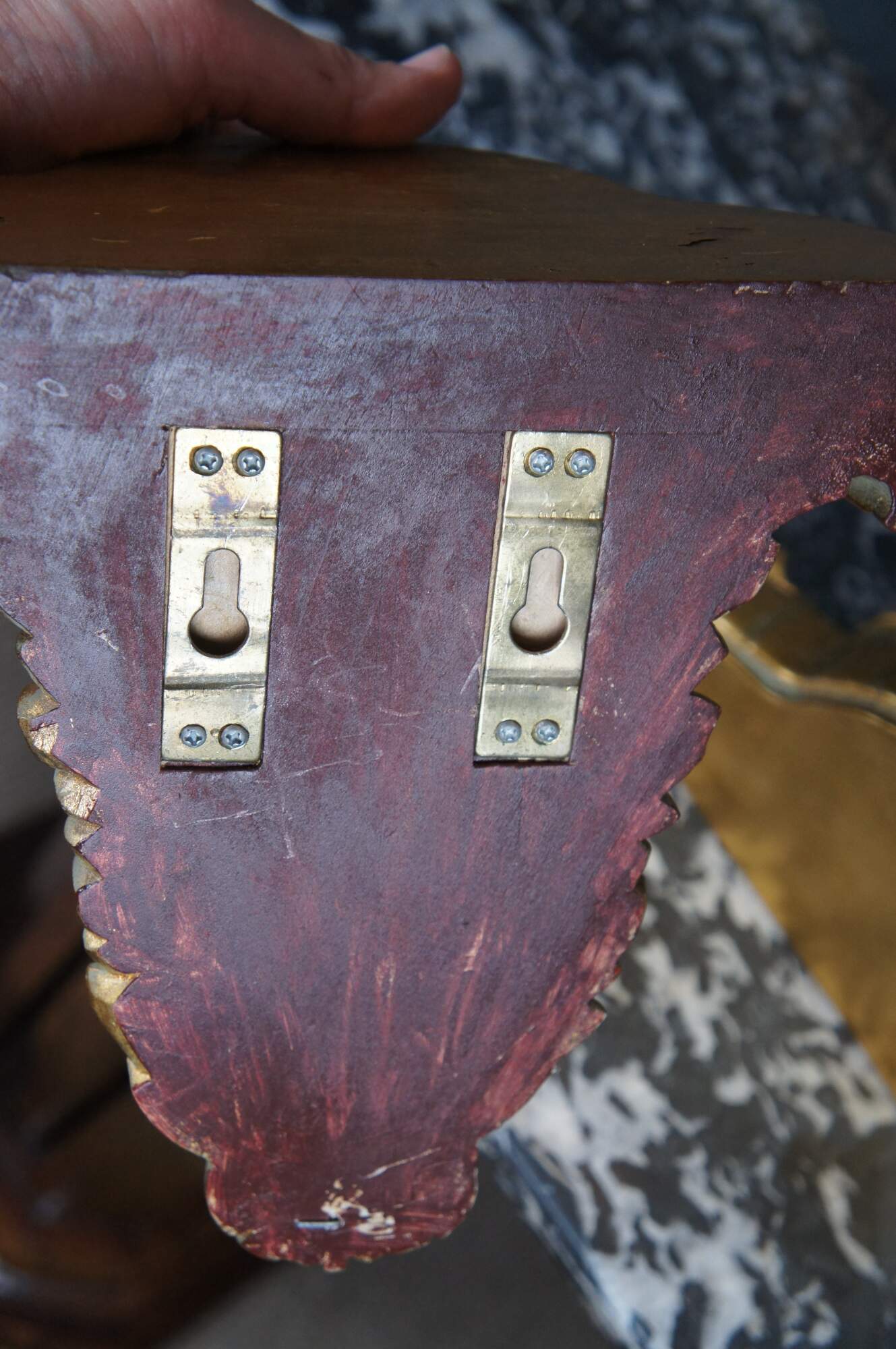 2 Gold sconces in the manner of Baroque / Rococo. Features am ornate acanthus relief with 3 lobe shelf. Hangs along the back via brackets.