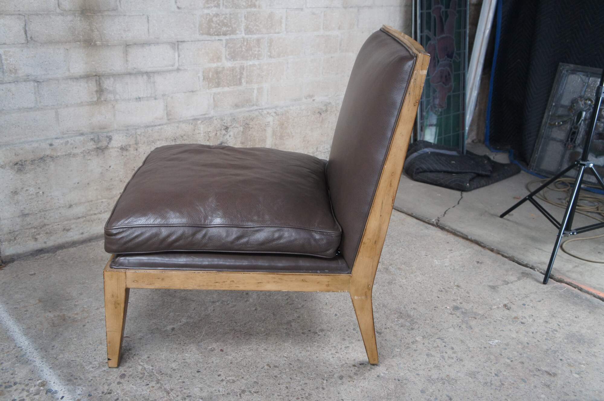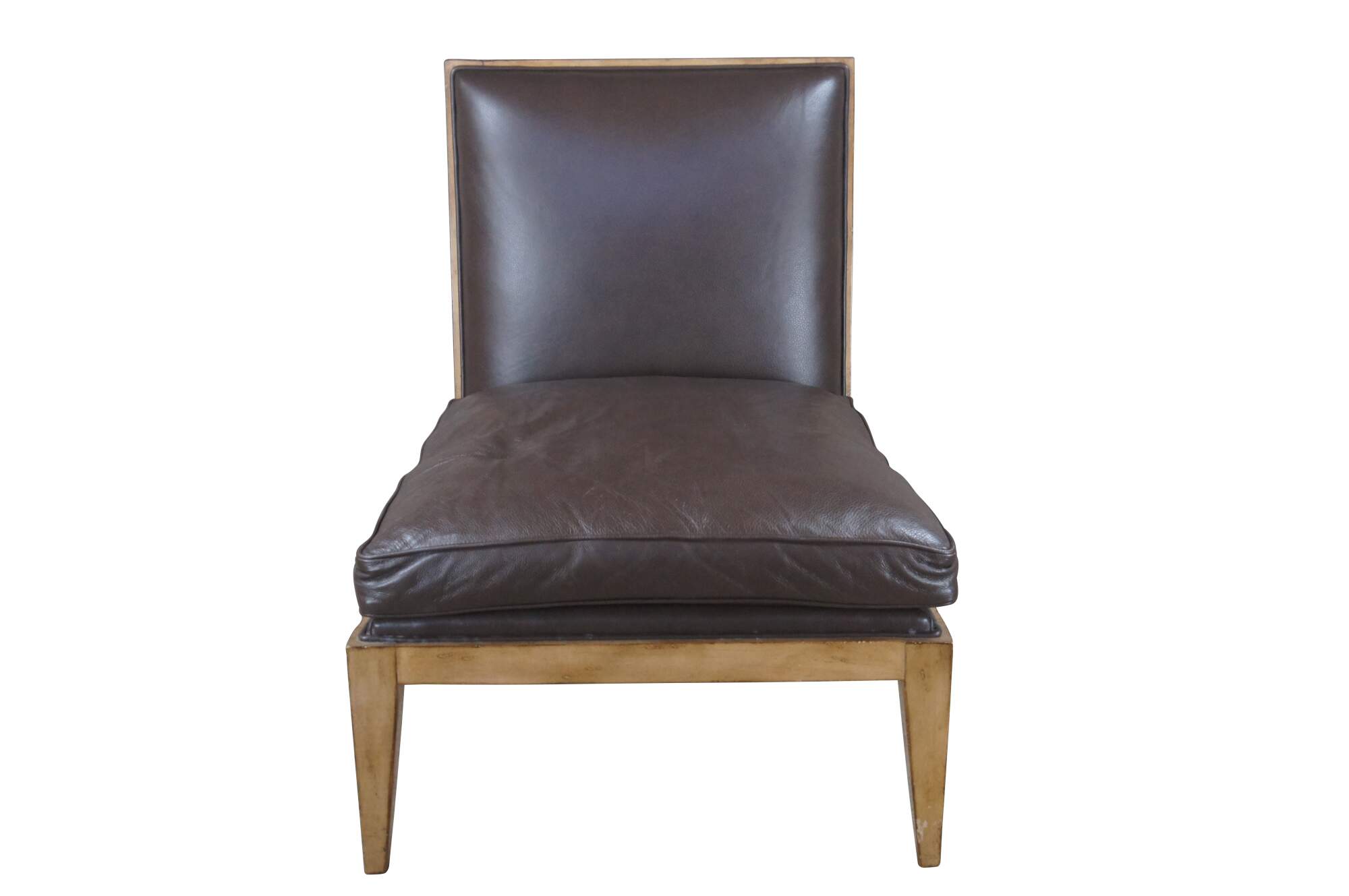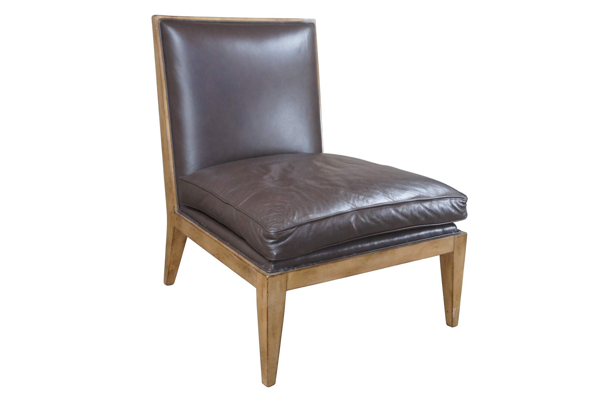 A beautiful armless slipper chair by Swaim Upholstery. Originally made for Marc-Miachaels Interior Design. Features brown leather upholsterly and an oak frame. The chair is supported by square tapered legs. A seemless modern design that will make a splash in any setting.