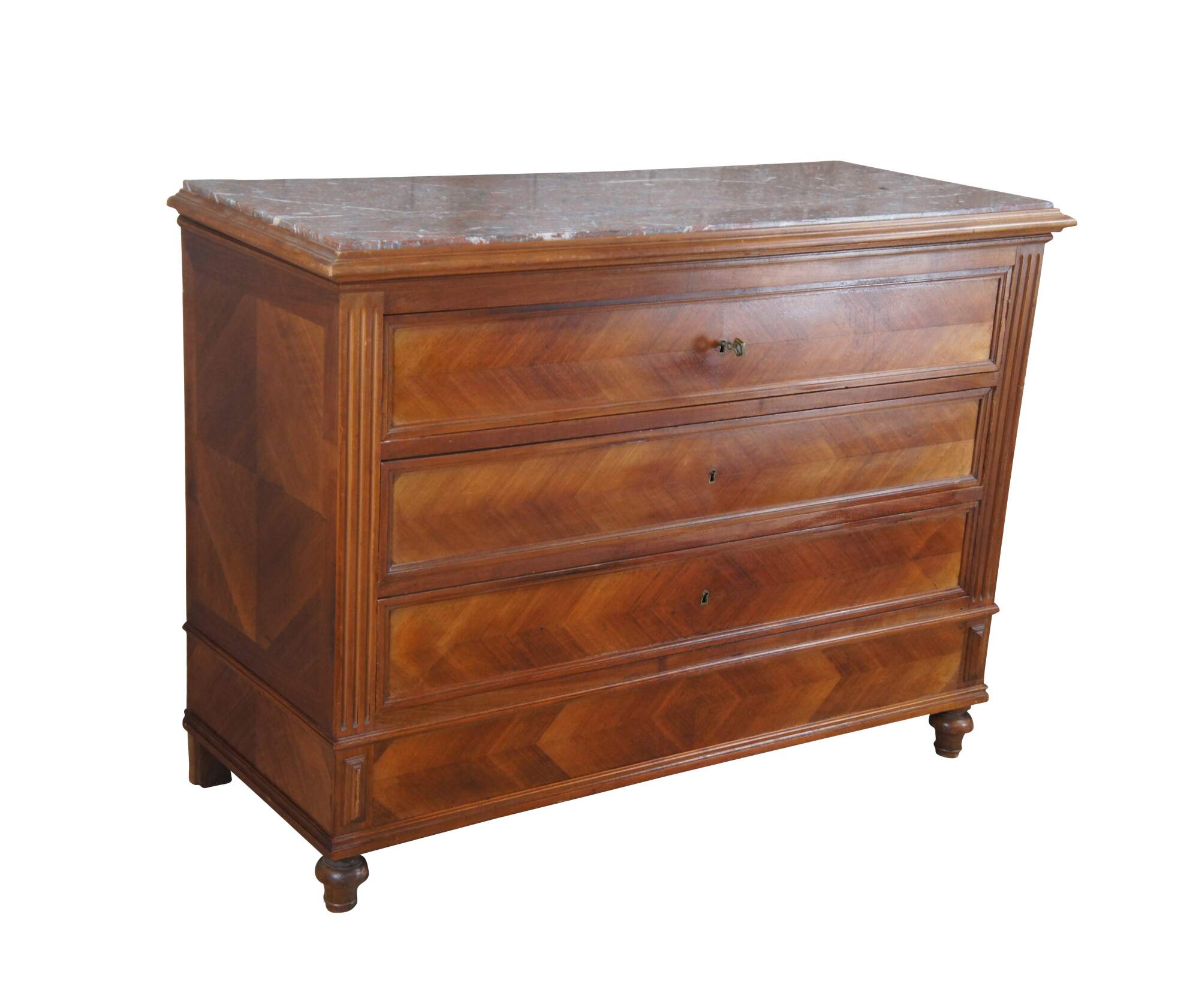 An exceptional 19th Century Louis Philippe Commode. Made from walnut with three hand dovetailed oak drawers. Features a recessed drawer configuration with fluted stiles, inset royal rouge marble top and bun feet. The chest has matchbook walnut front and sides showcasing a beautiful parquetry design. Drawers open via pentagon shaped key.