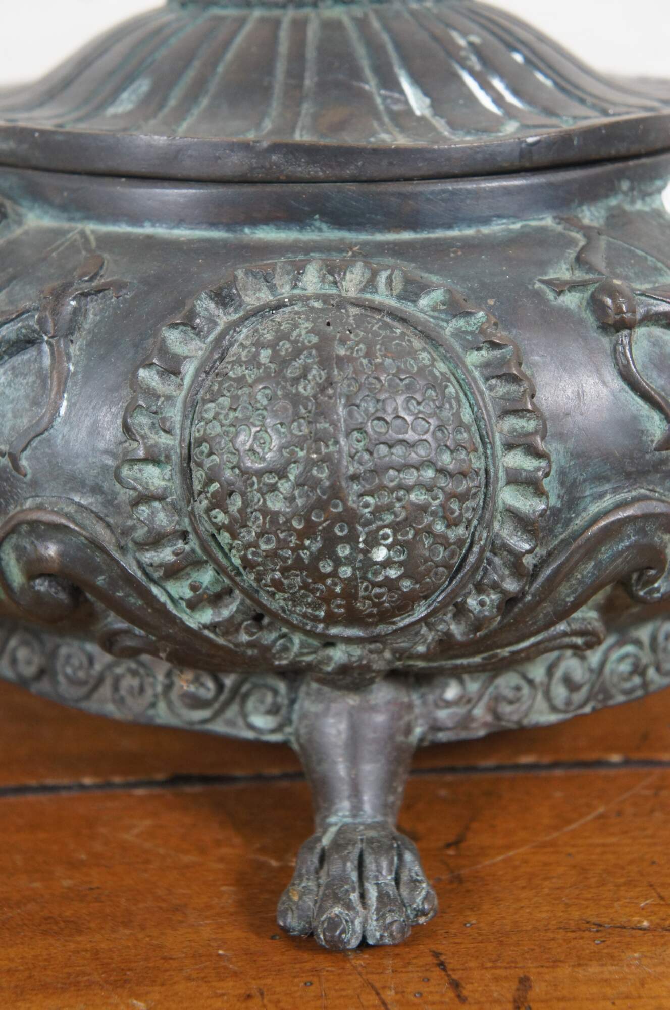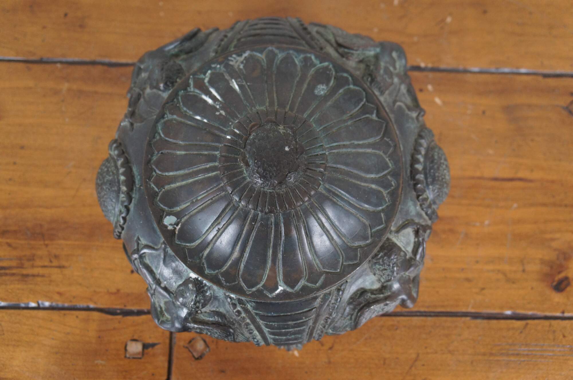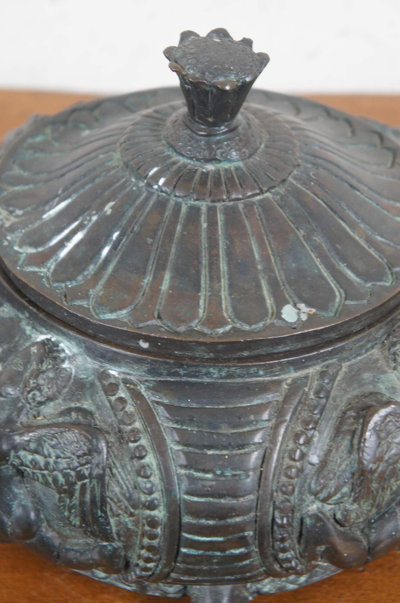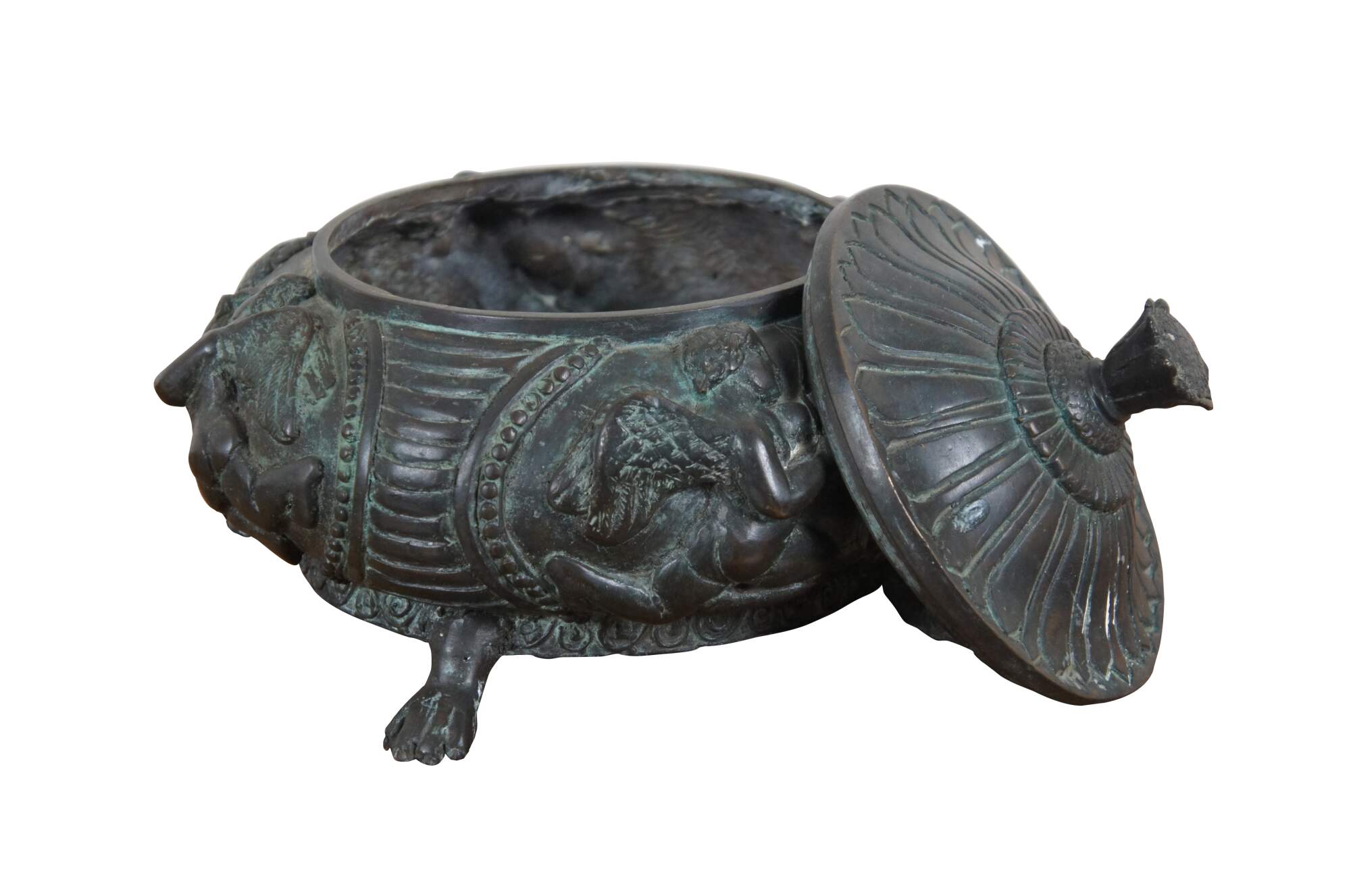 Rare vintage Maitland Smith bronze lidded and footed urn / compote featuring a low round form on paw feet, decorated with a Greek / Grecian design of cherubs in high relief, with a lid shaped like a sunflower.