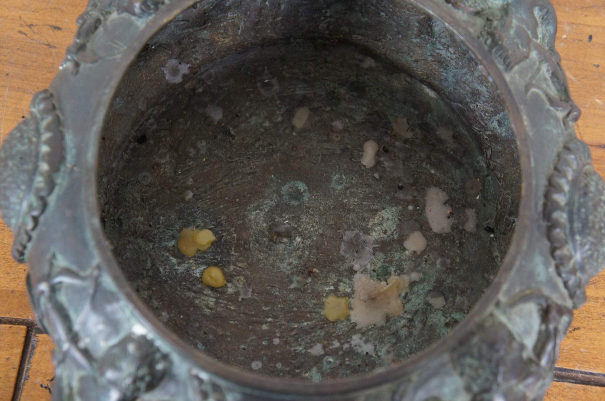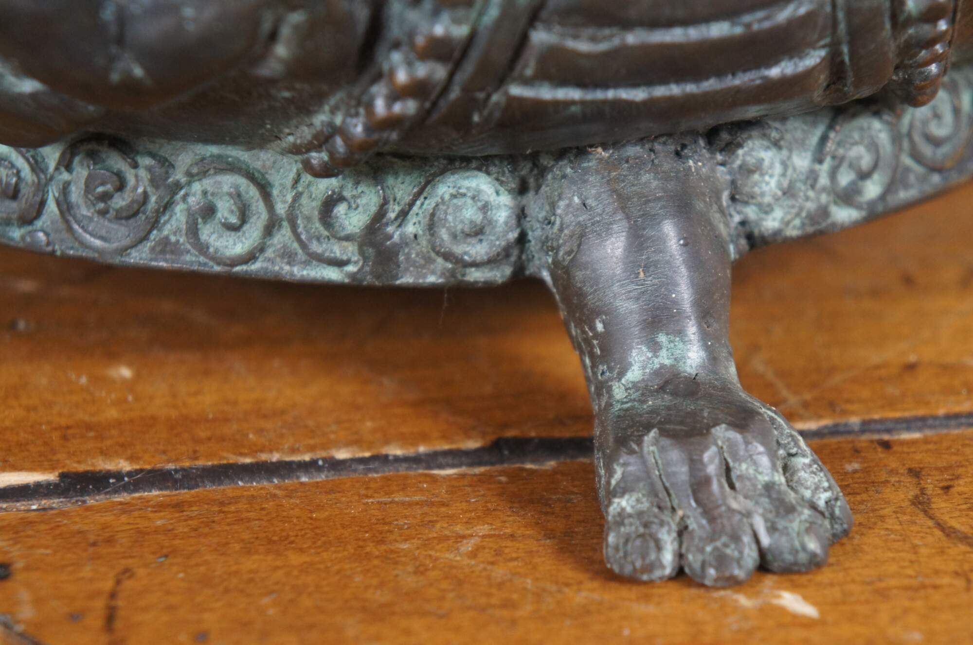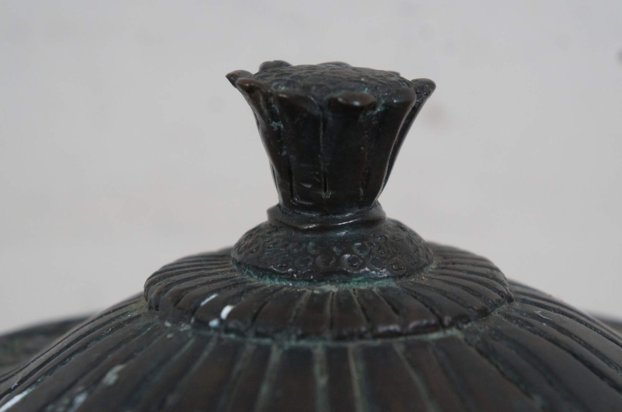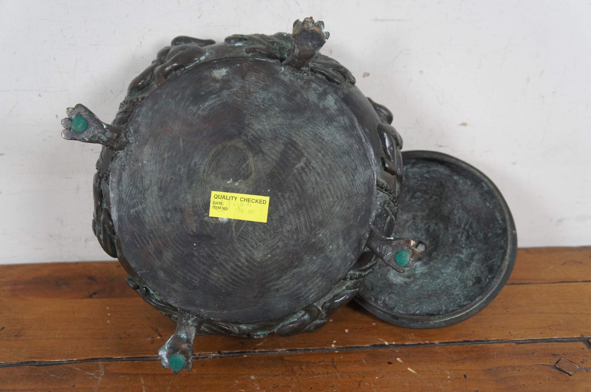 Rare vintage Maitland Smith bronze lidded and footed urn / compote featuring a low round form on paw feet, decorated with a Greek / Grecian design of cherubs in high relief, with a lid shaped like a sunflower.