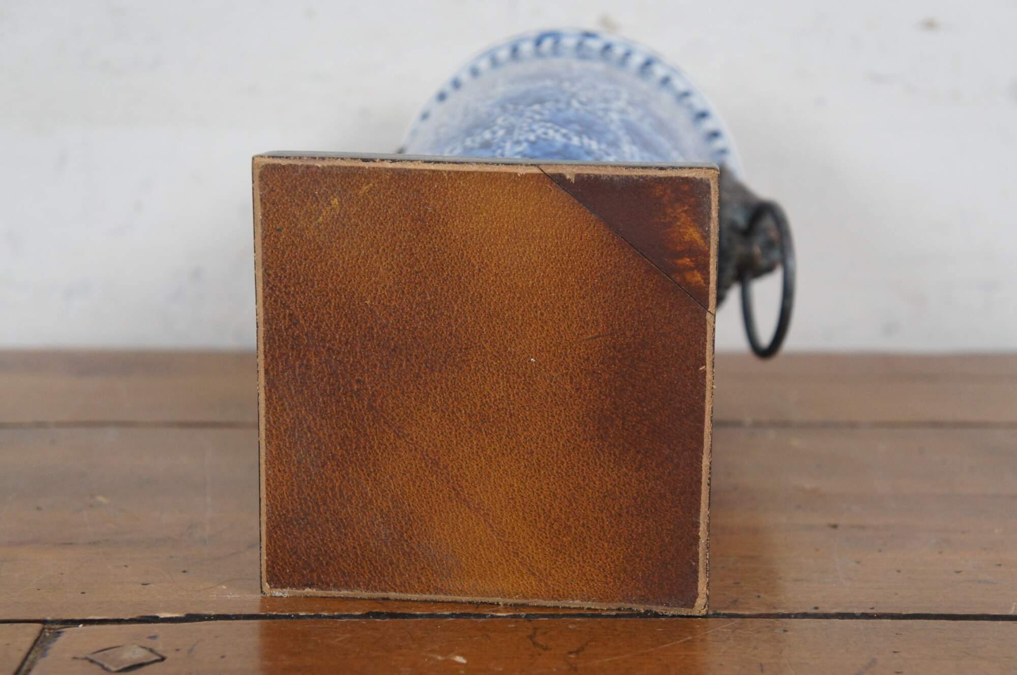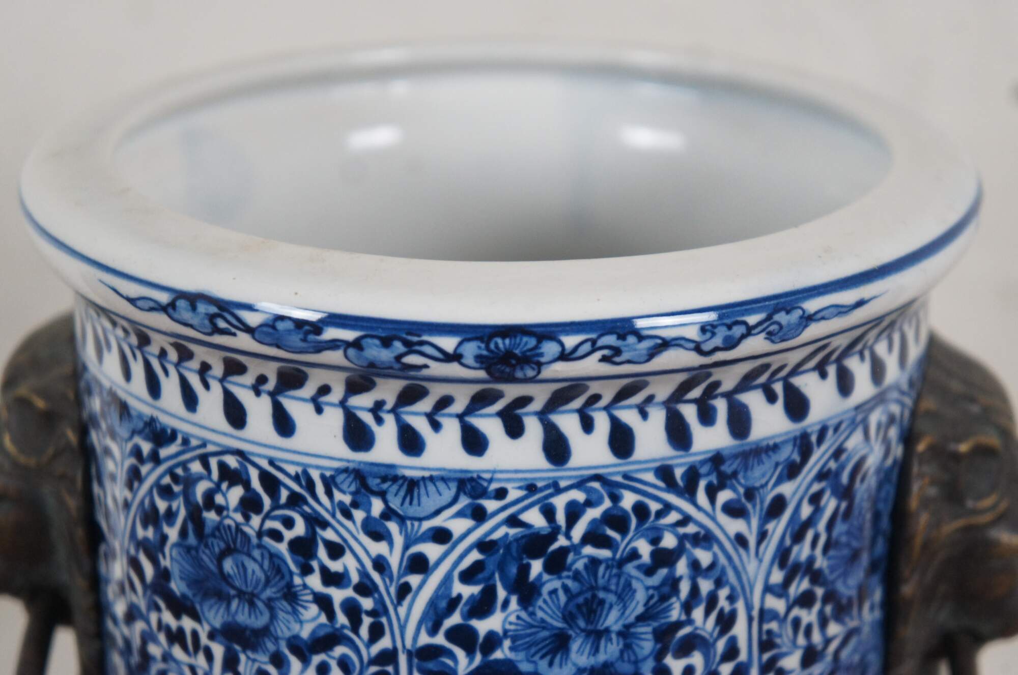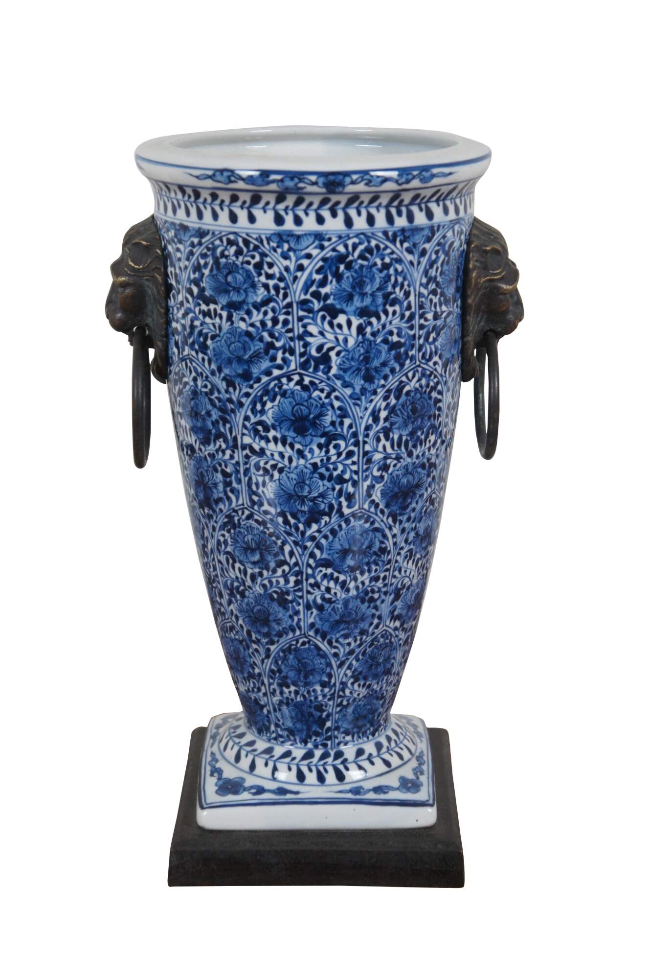 Vintage blue and white lotus flower porcelain vase with metal plinth base and lion's head holding ring handles. Attributed to Theodore Alexander.