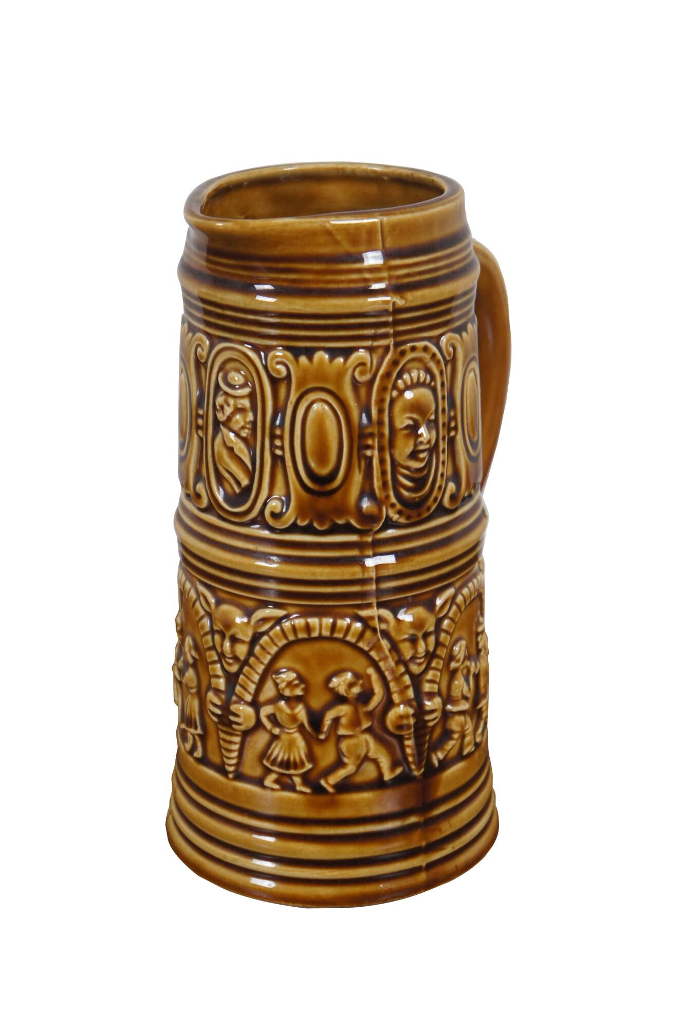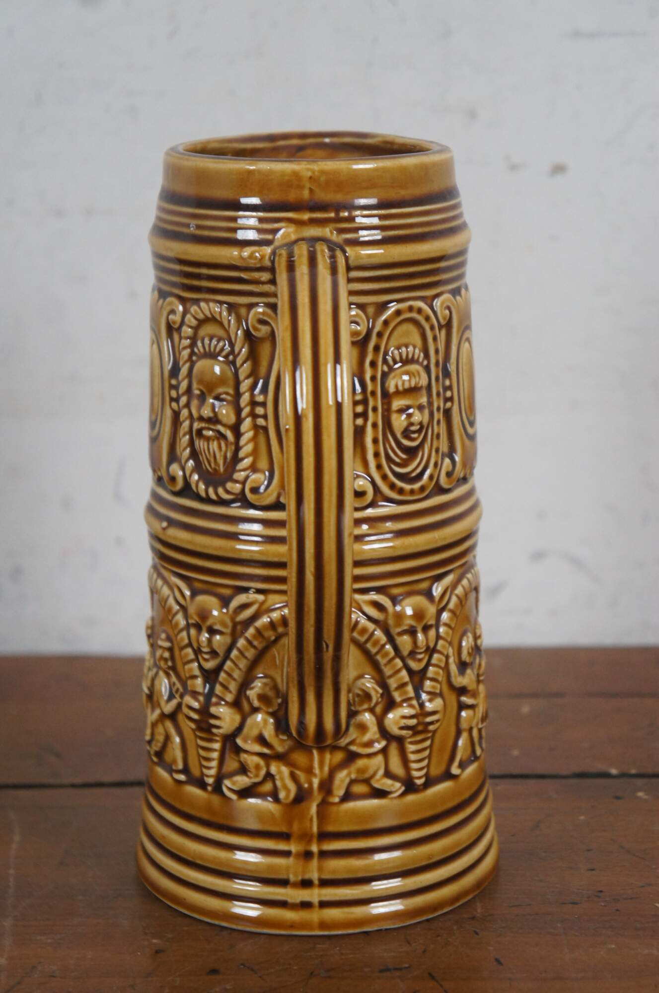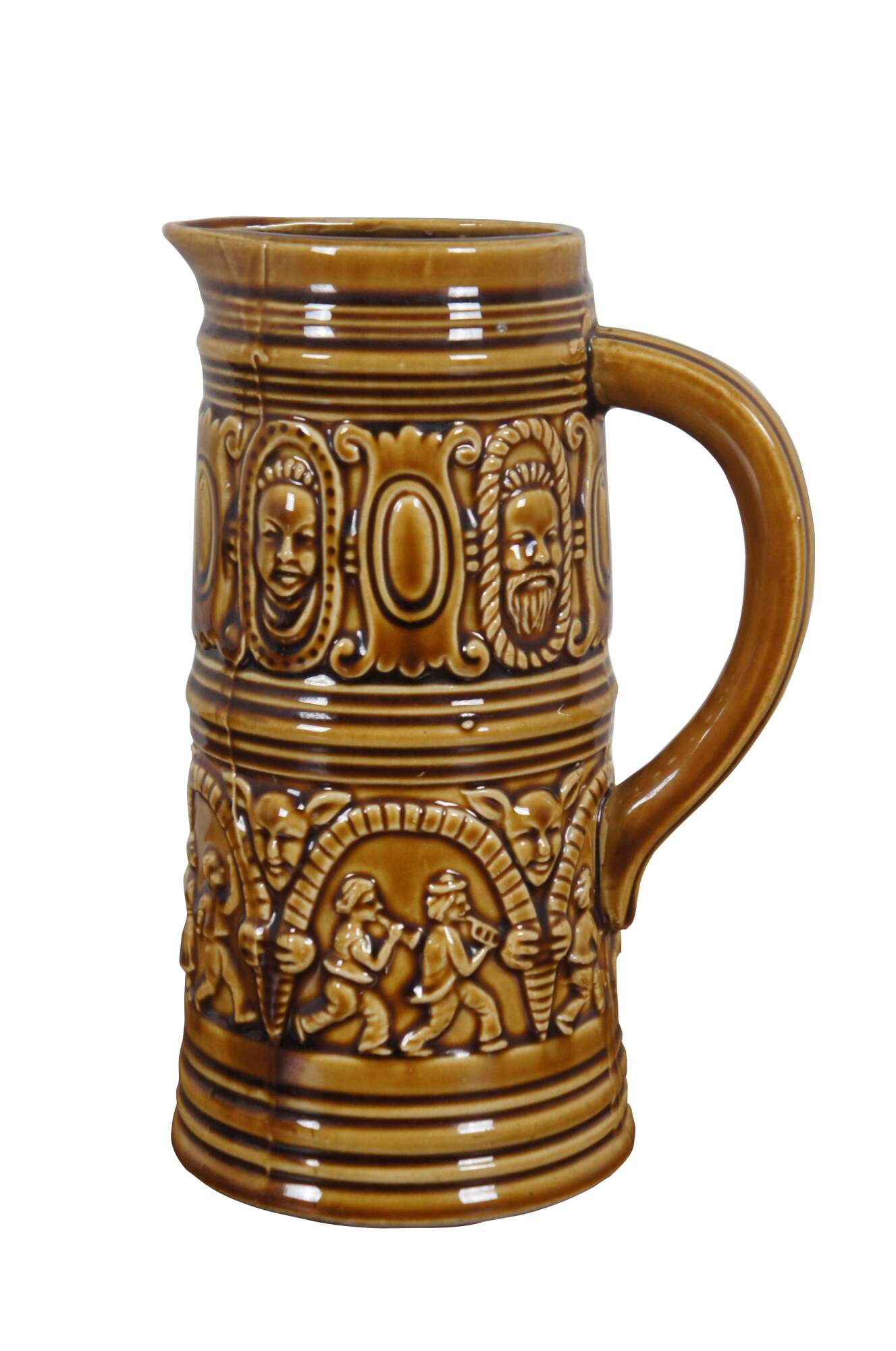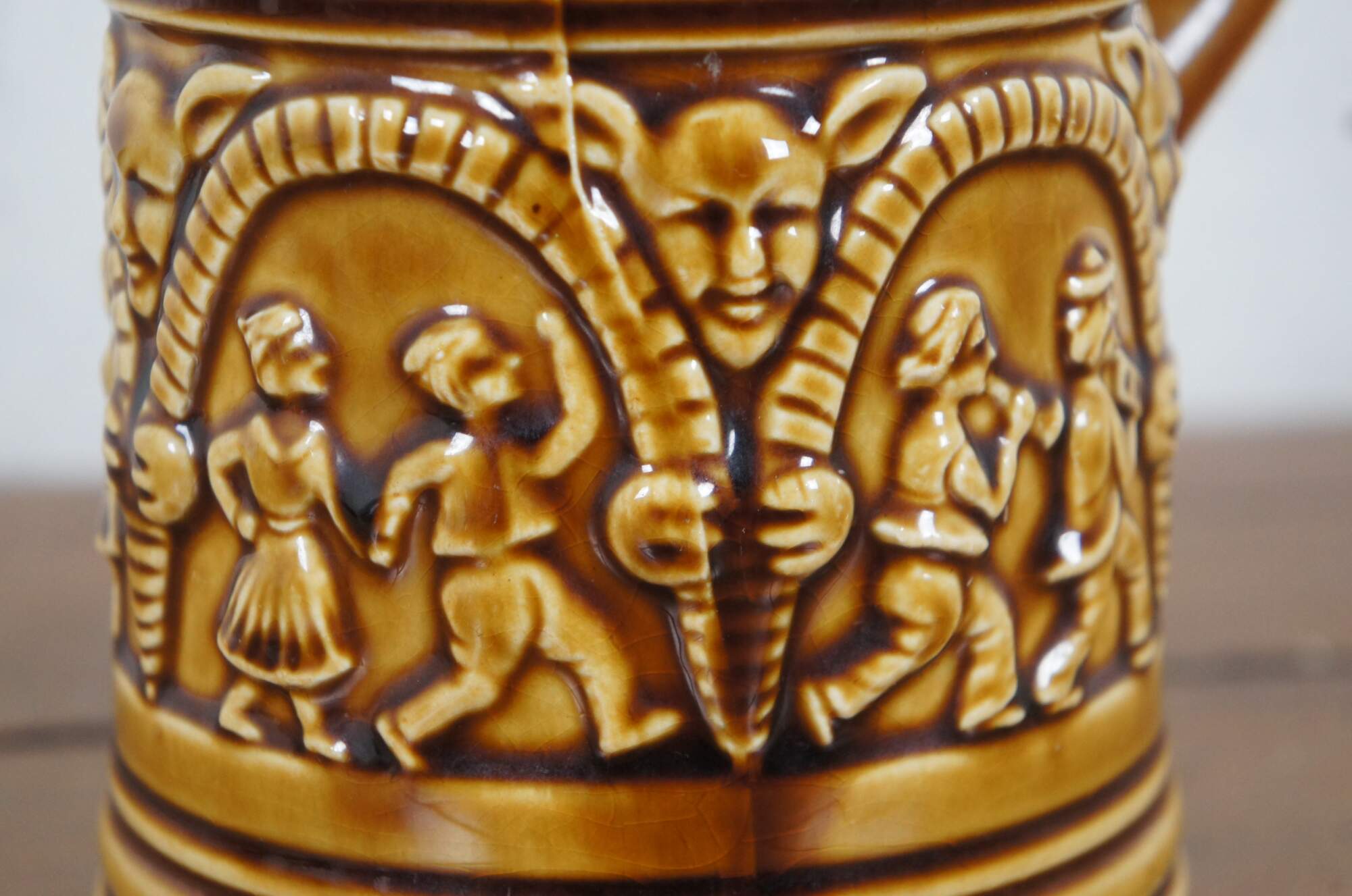 Mid century yellow porcelain / ceramic pitcher / jug featuring a German Black Forest inspired motif of busts, dancing figures, and elfin / grotesque faces. Made in Japan.