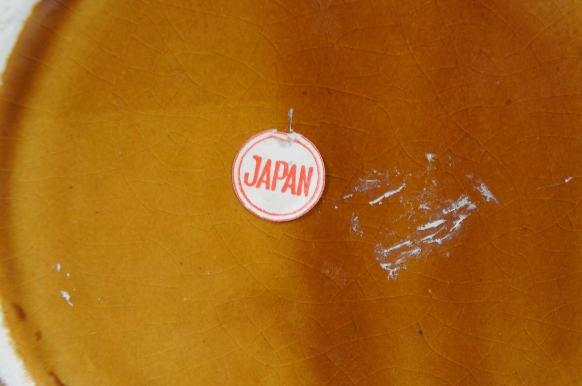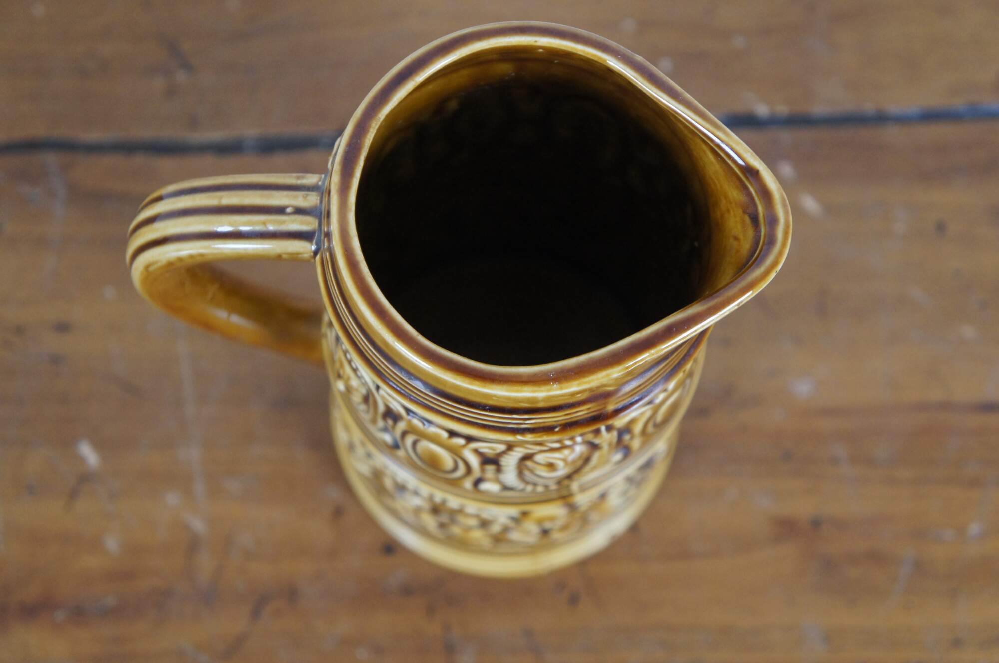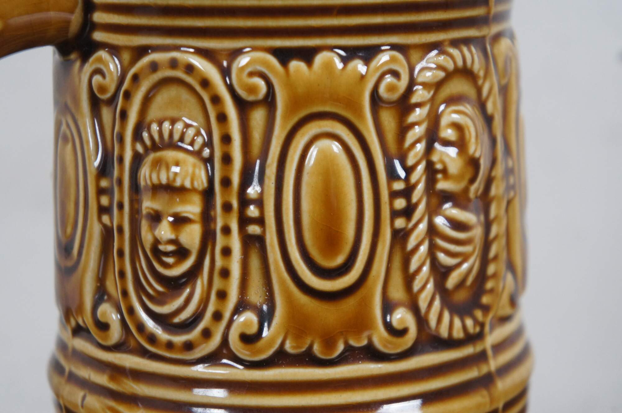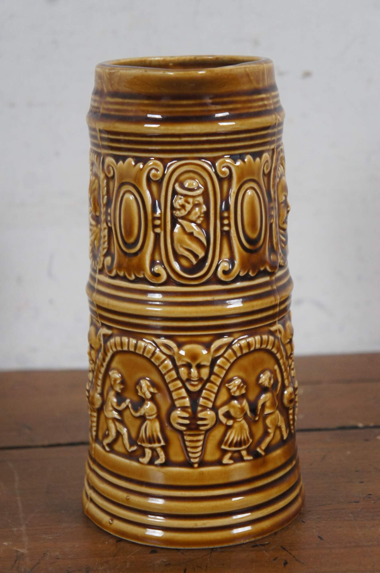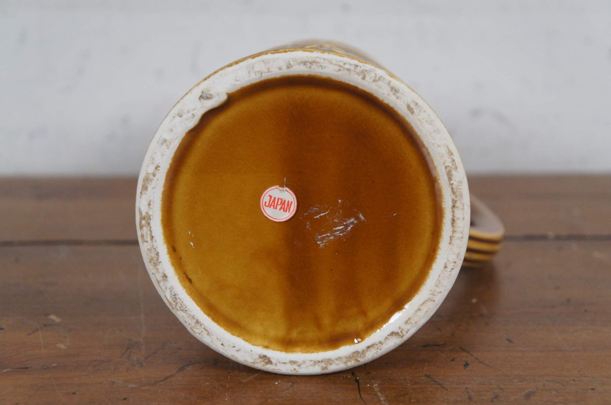 Mid century yellow porcelain / ceramic pitcher / jug featuring a German Black Forest inspired motif of busts, dancing figures, and elfin / grotesque faces. Made in Japan.
