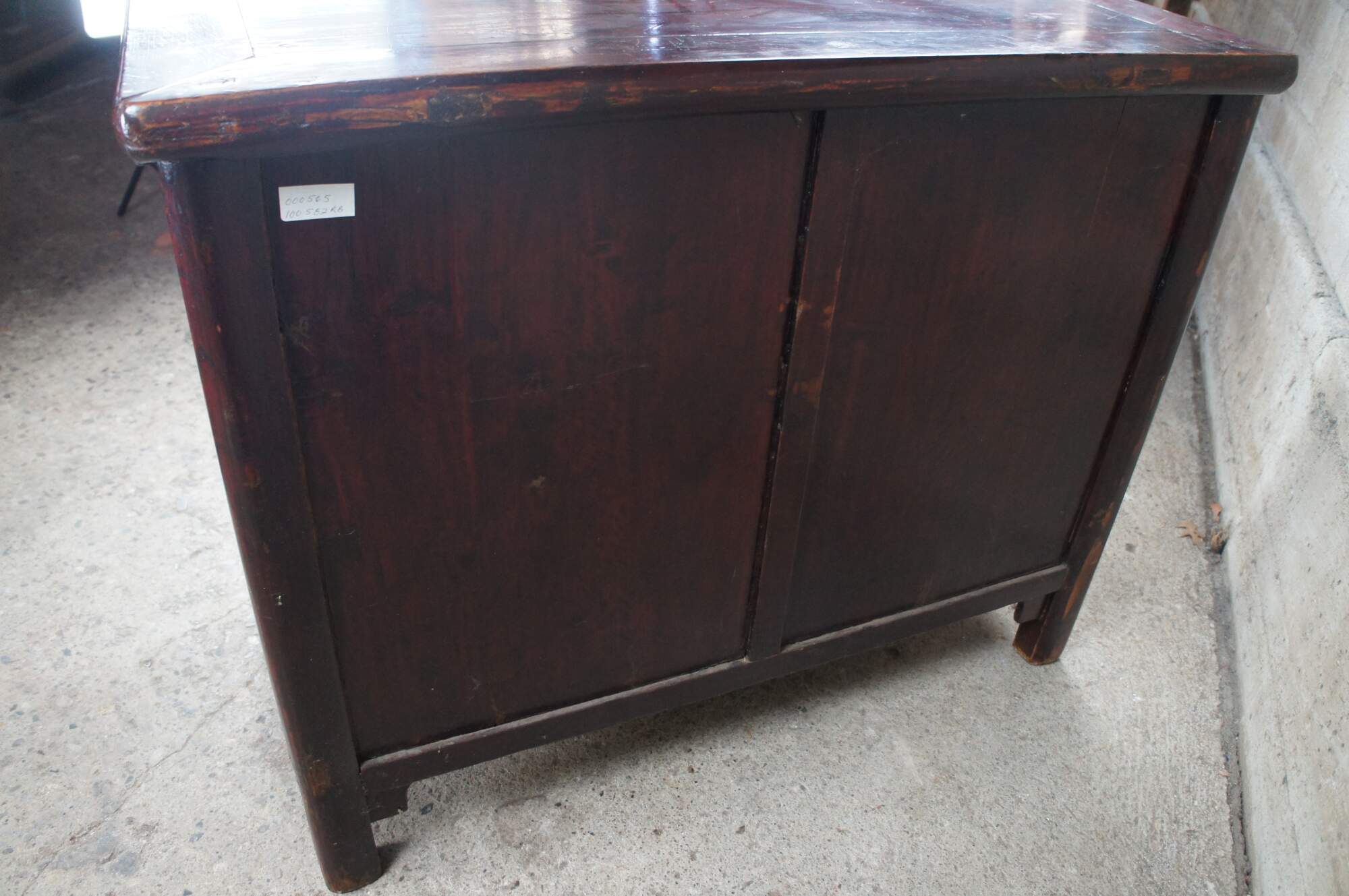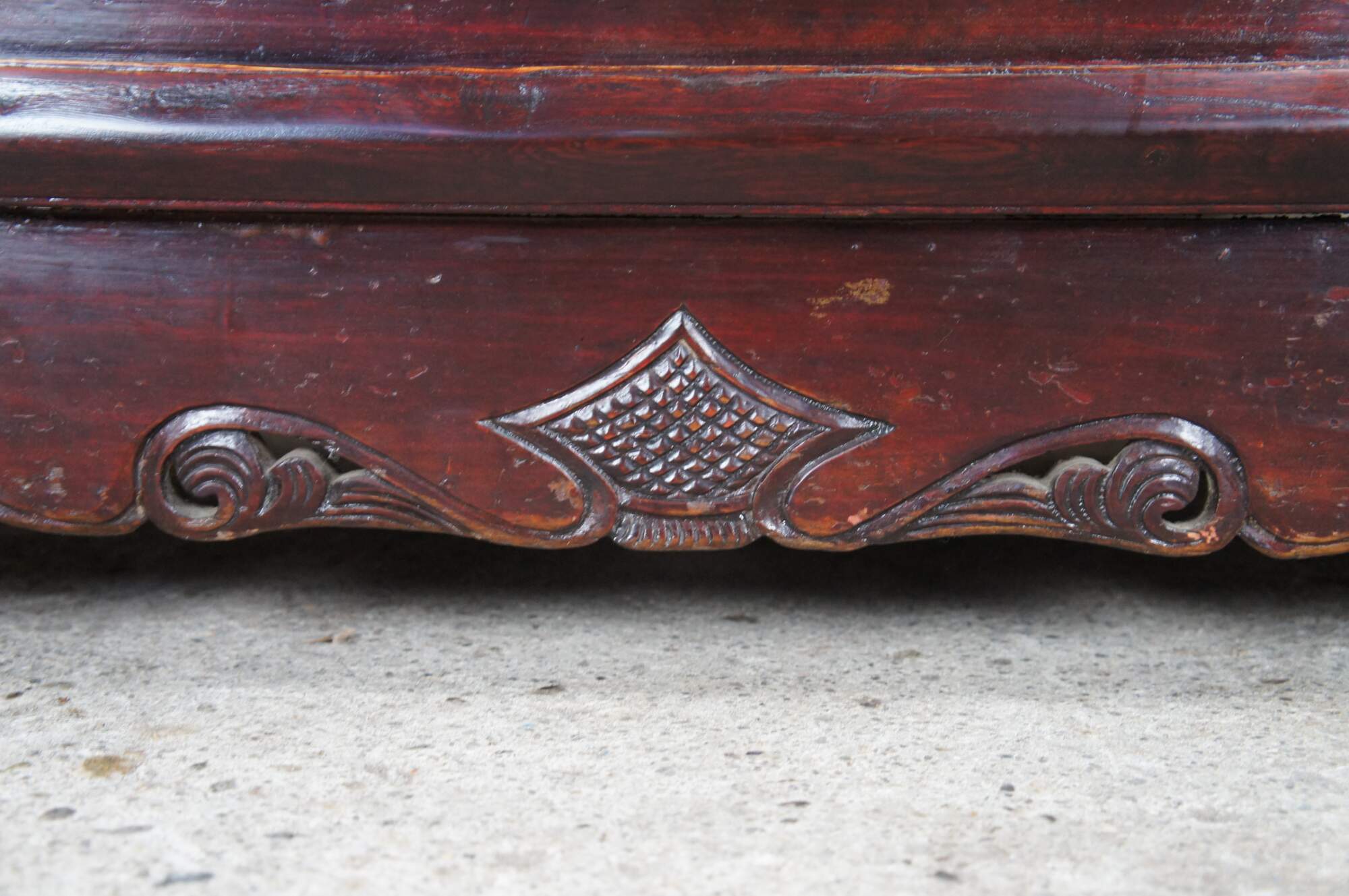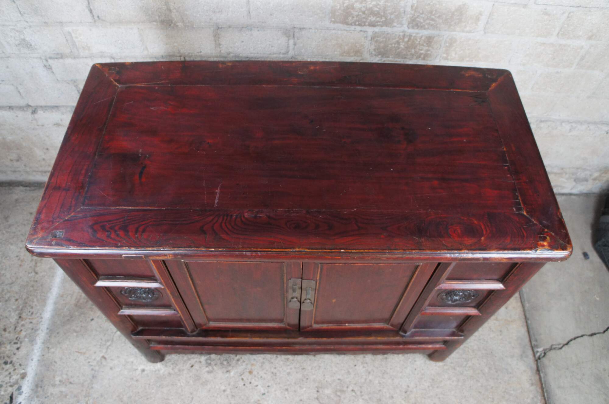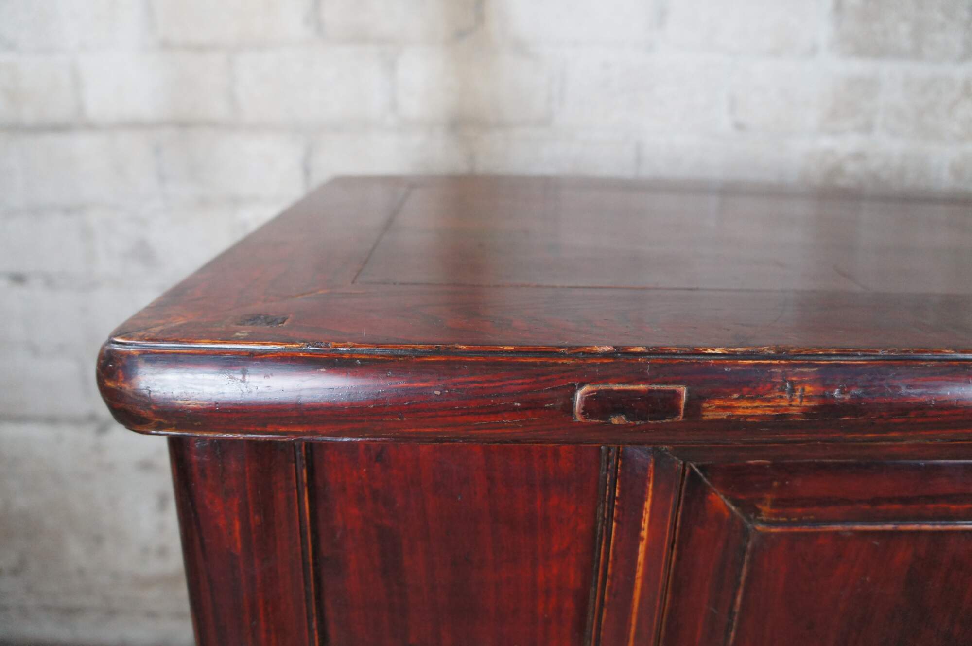 Late Qing Dynasty red lacquer Storage Chest or sideboard. Made in Shanxi North Eastern China, circa 1880s. Features a simple rectangular frame with two doors at the center flanked by round carved medallions and panels. Lower apron has carved motifs. Made using mortise and tenon construction. A stately piece for any space.