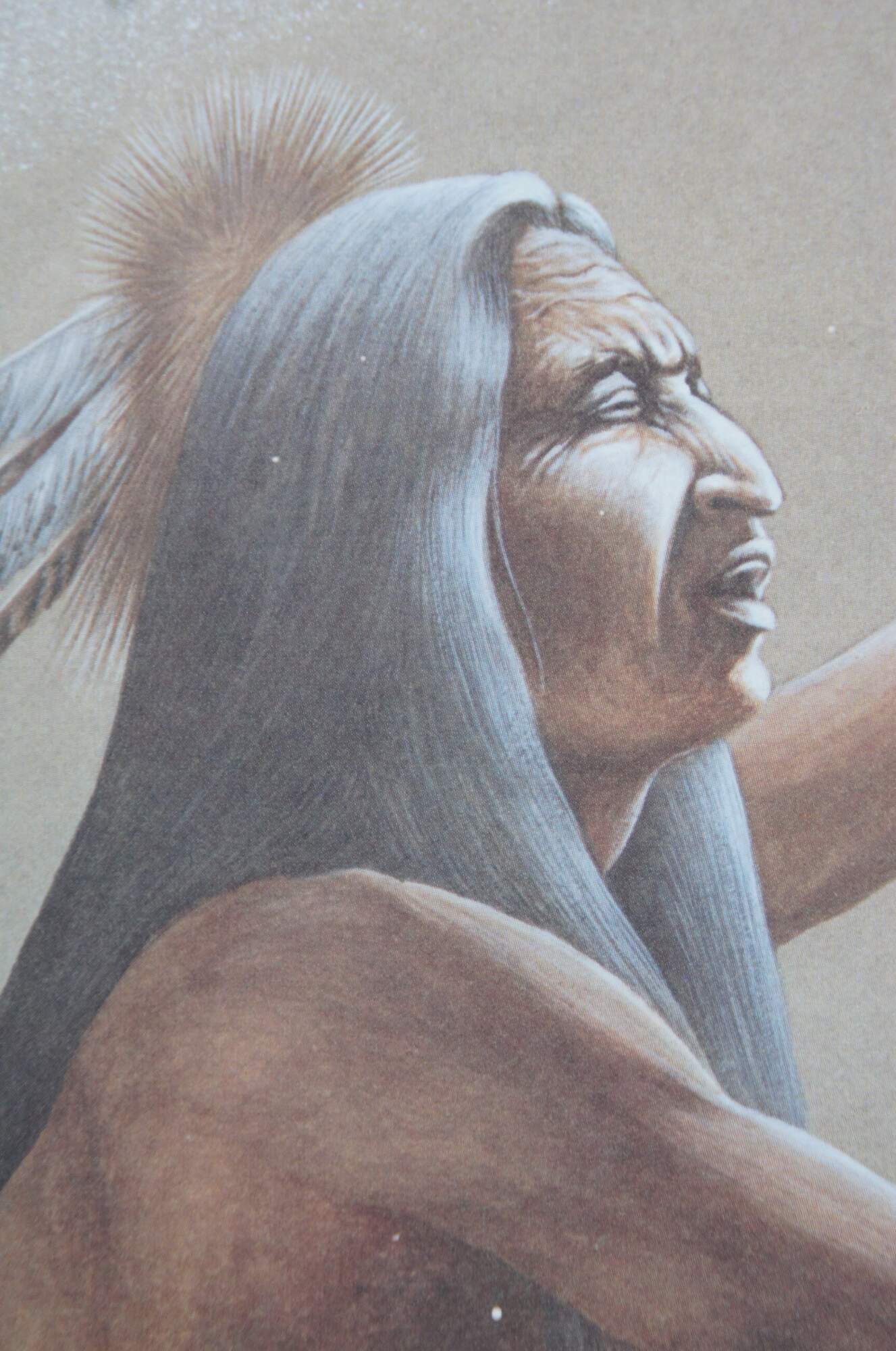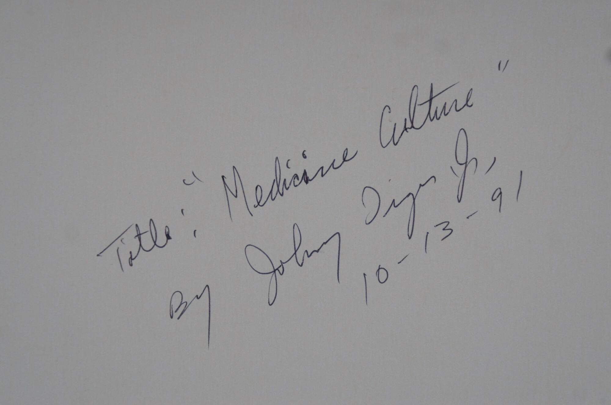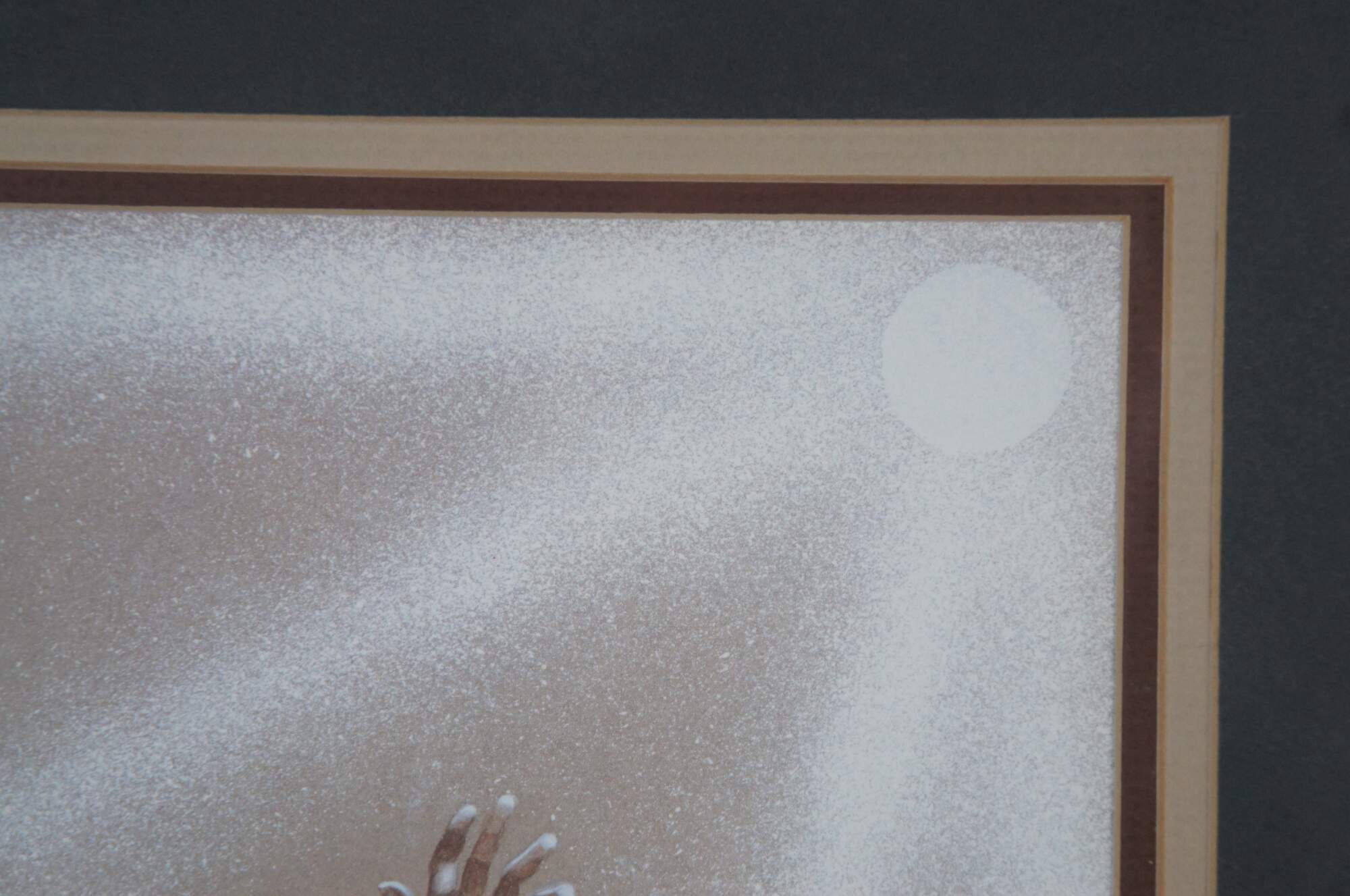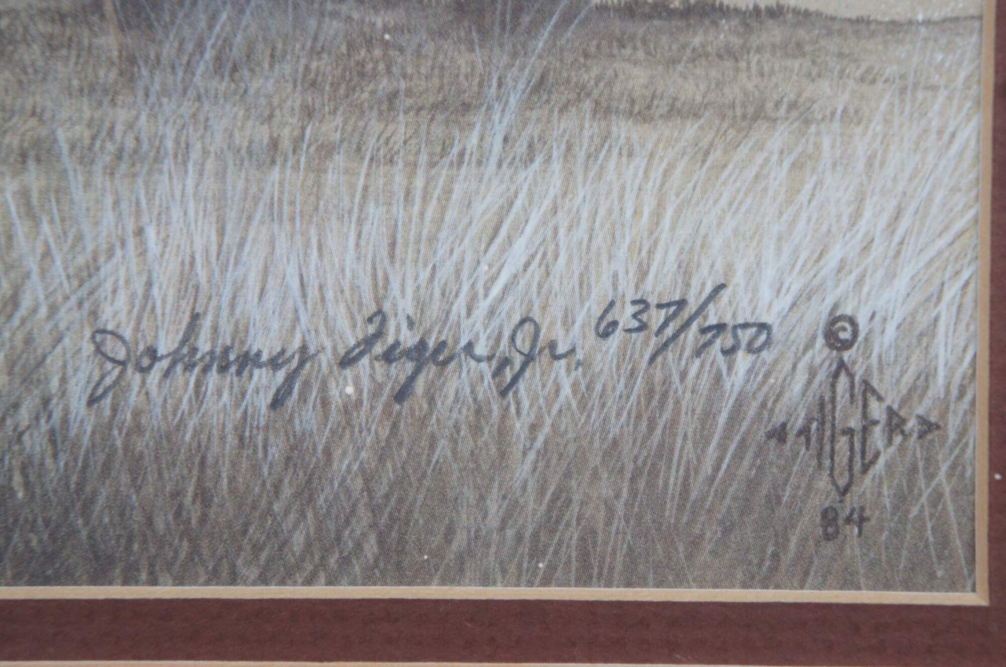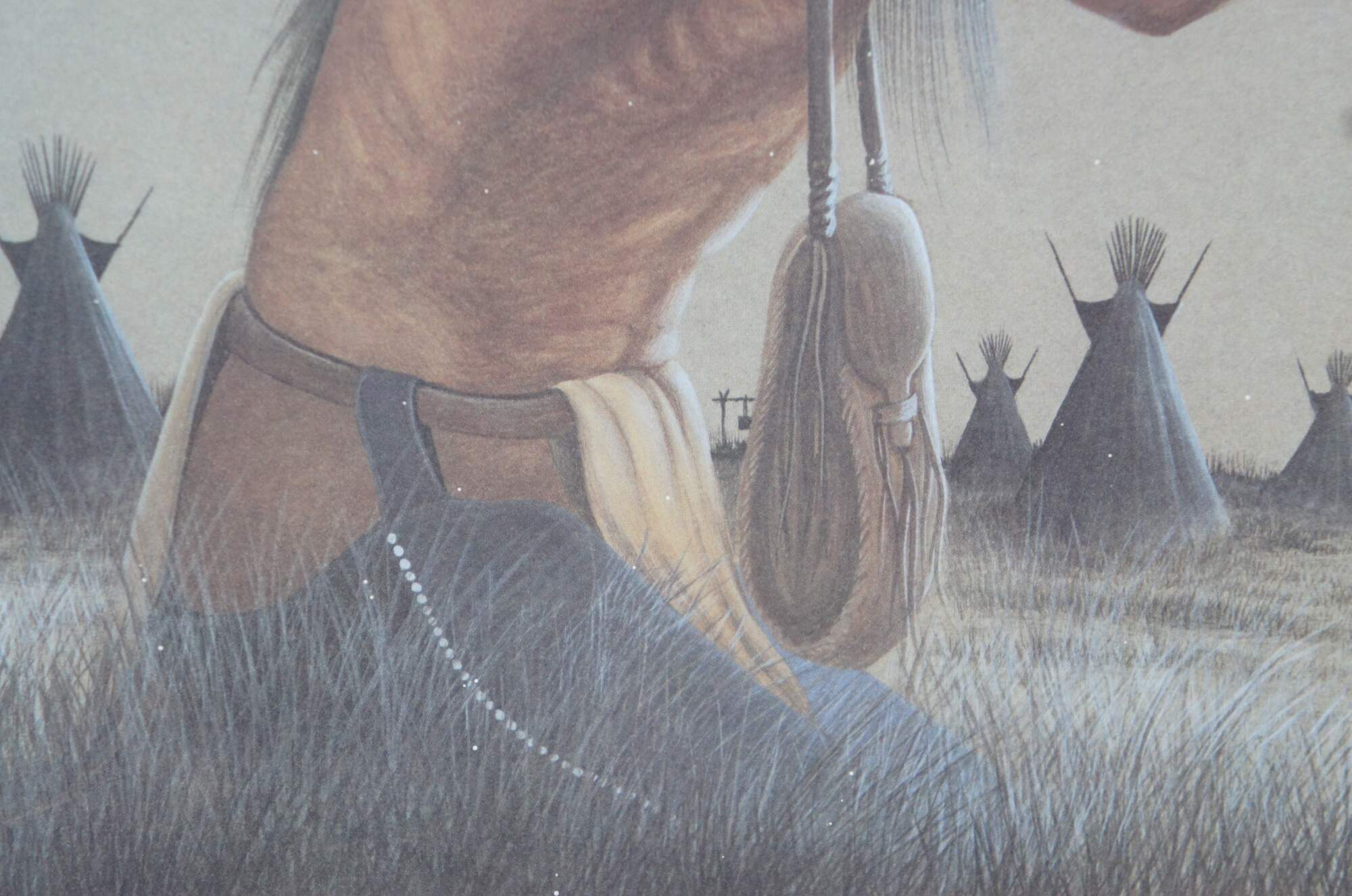 Vintage 1980's lithograph print titled "Medicine Culture" by Johnny Tiger, Jr. Shows a Native american medicine man kneeling to perform a ceremony in the grass near an array of teepees, under a bright full moon or sun. Pencil signed and numbered 637/750. Titled, signed, and date of purchase by artist on reverse. Purchased at the Second Annual Indian Market, Inter-Tribal Arts Experience 1991 - Dayton, OH. Plain black metal frame, gray and brown layered mat.