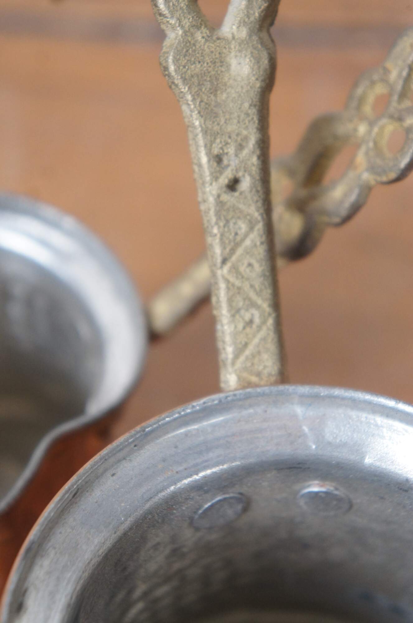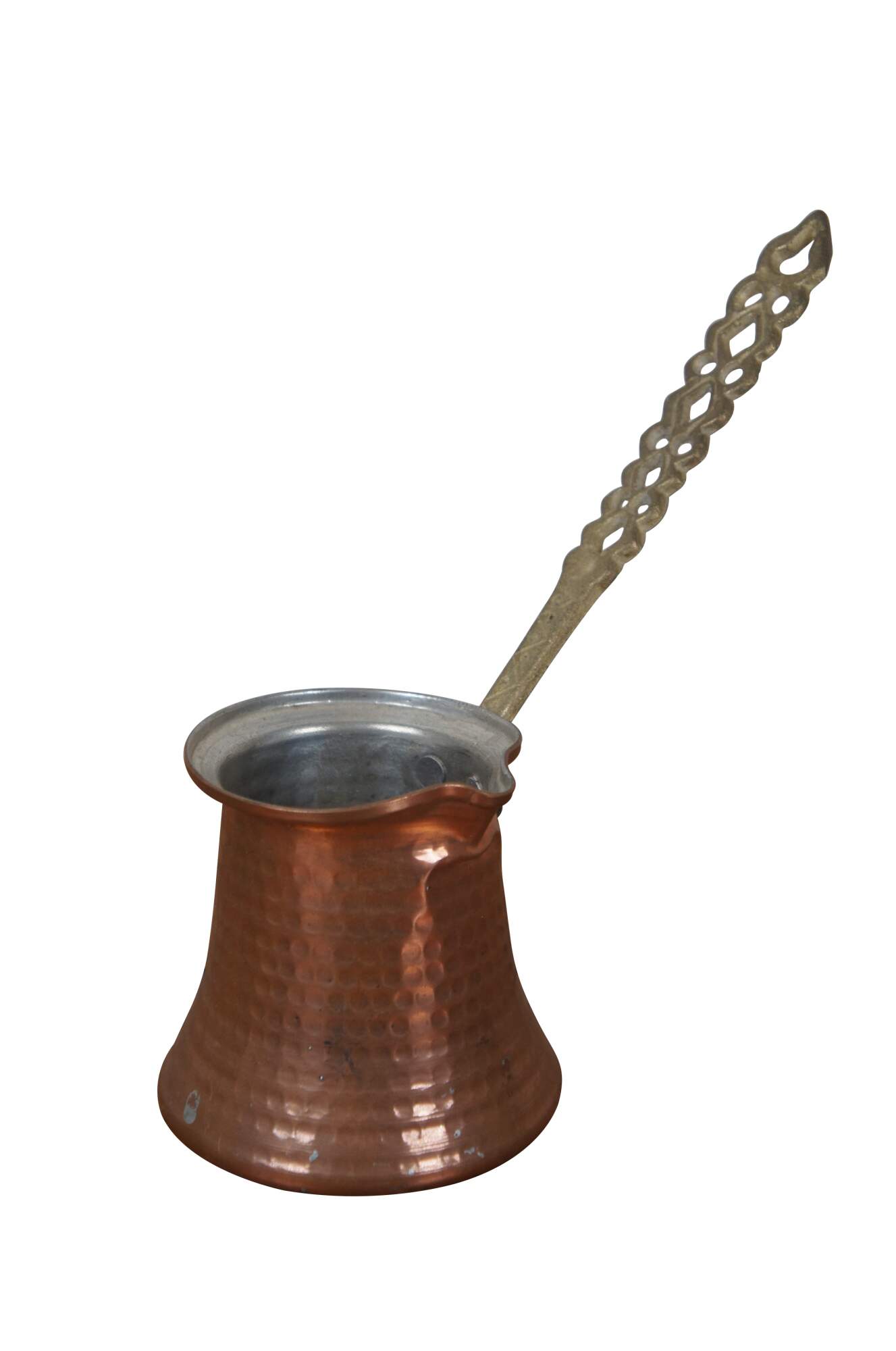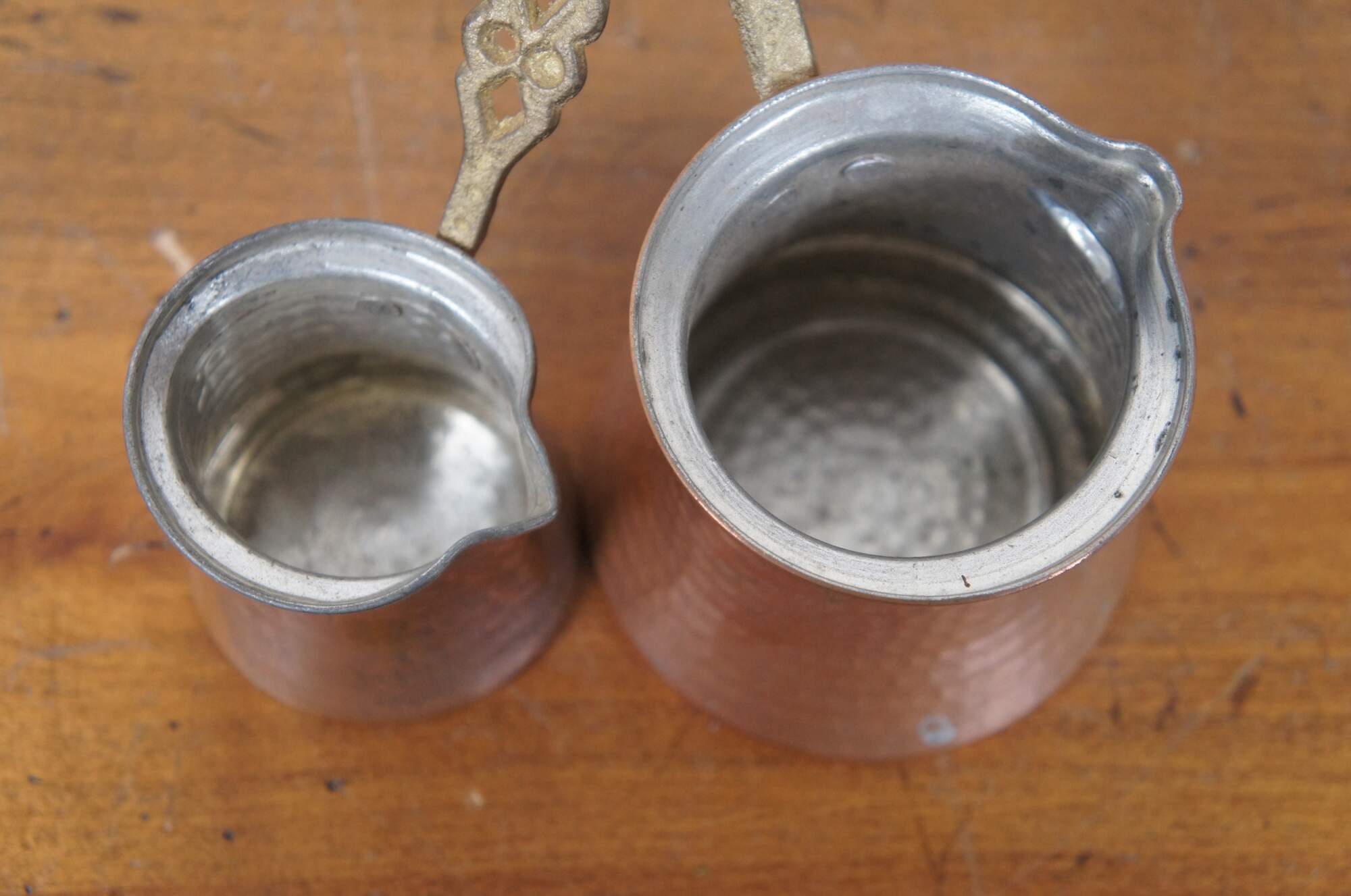 Pair of vintage hammered copper Turkish coffee pots / ibriks with pierced brass handles.