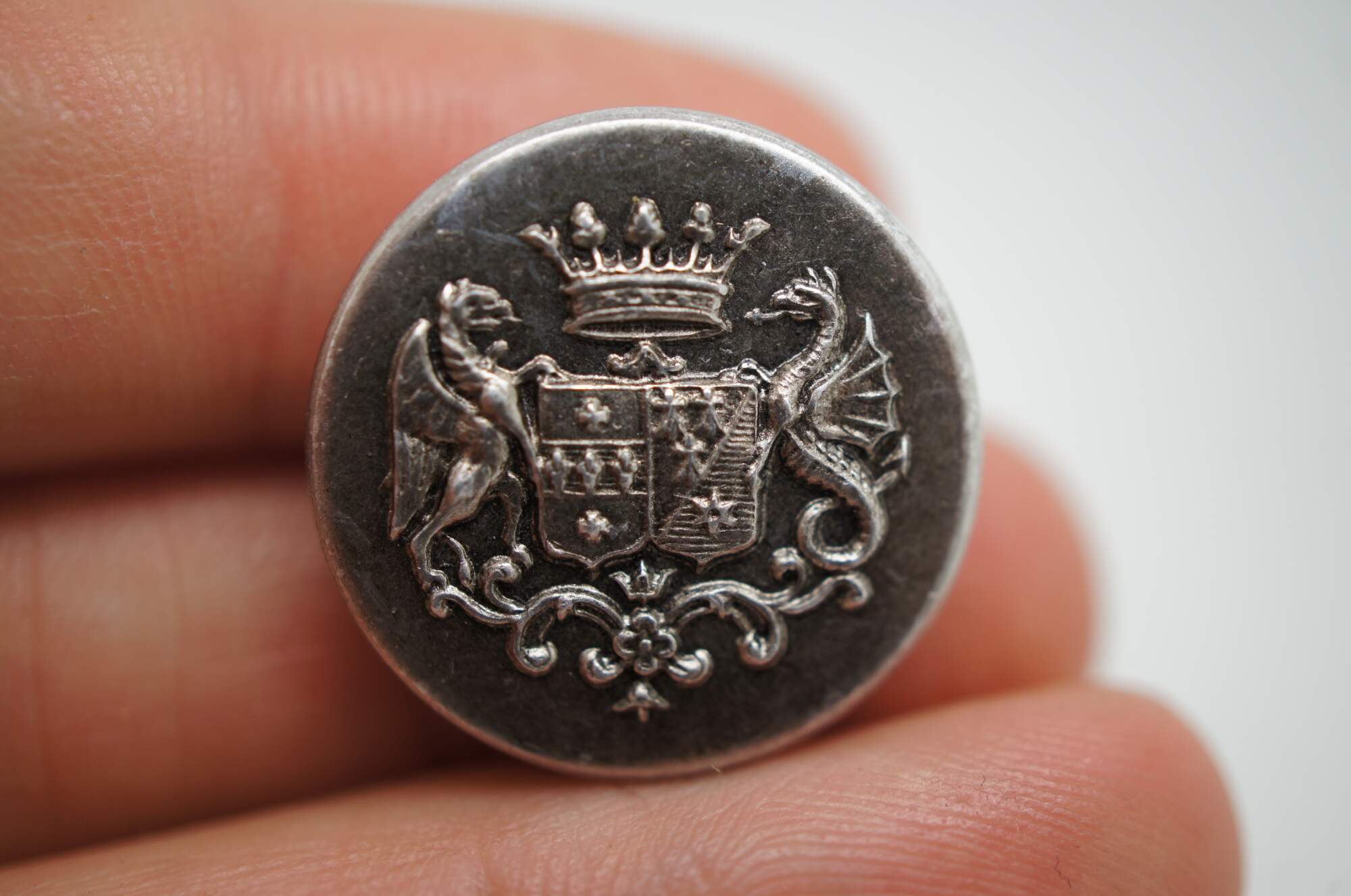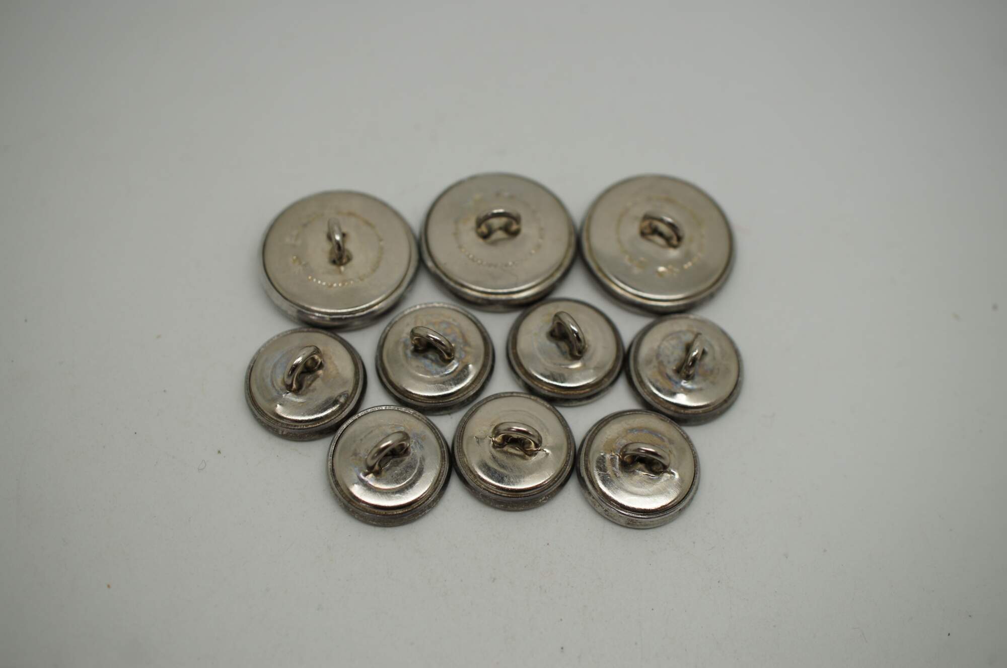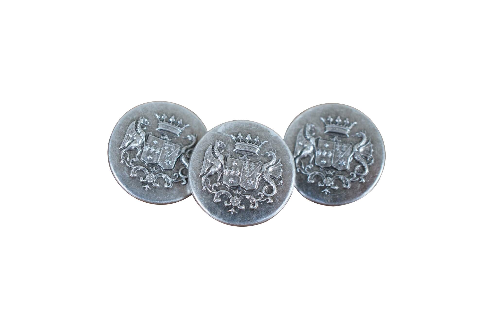 Set of ten (three large and seven small) silver tone metal, shank back buttons, embossed with a heraldic / coat of arms / armorial crest or coat of arms. Made in Italy.