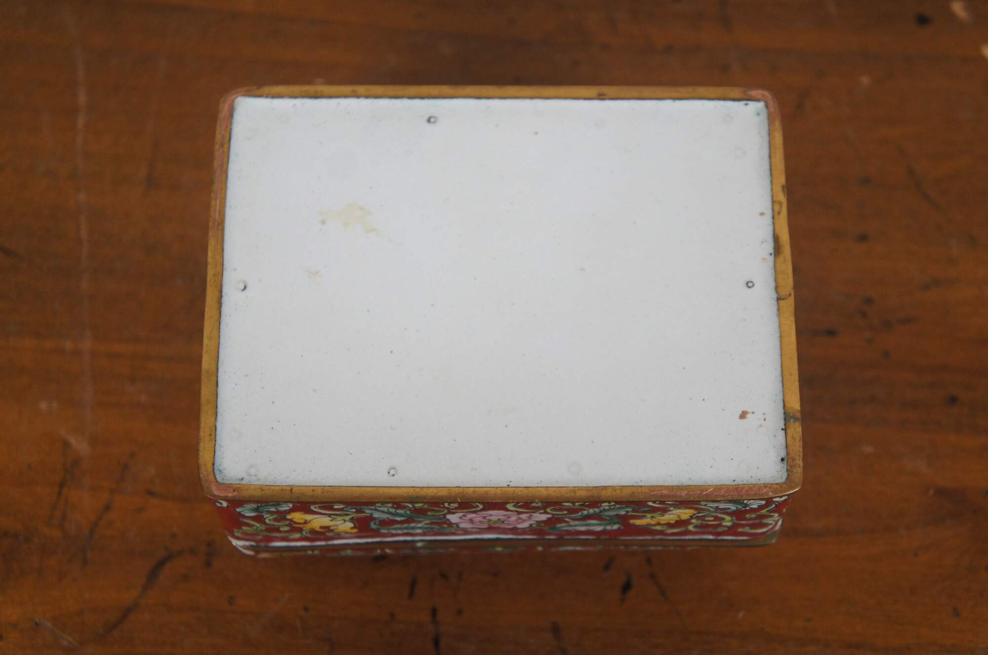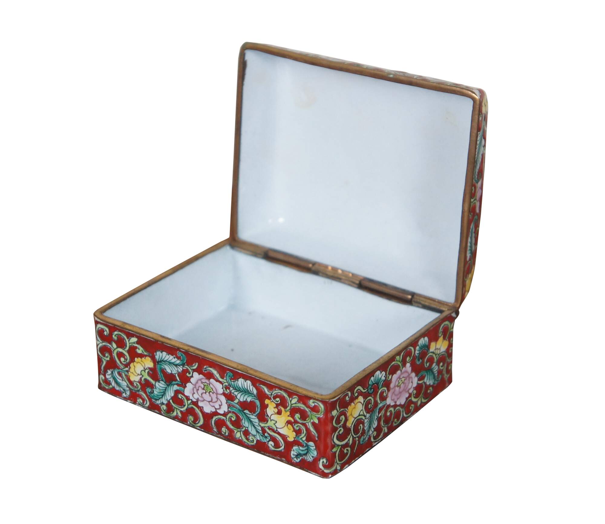 Vintage cloisonne enamel on metal Chinoiserie trinket box. Rectangular form with hinged lid, decorated in red, blue, and white with pink and yellow flowers and swirling leaves.