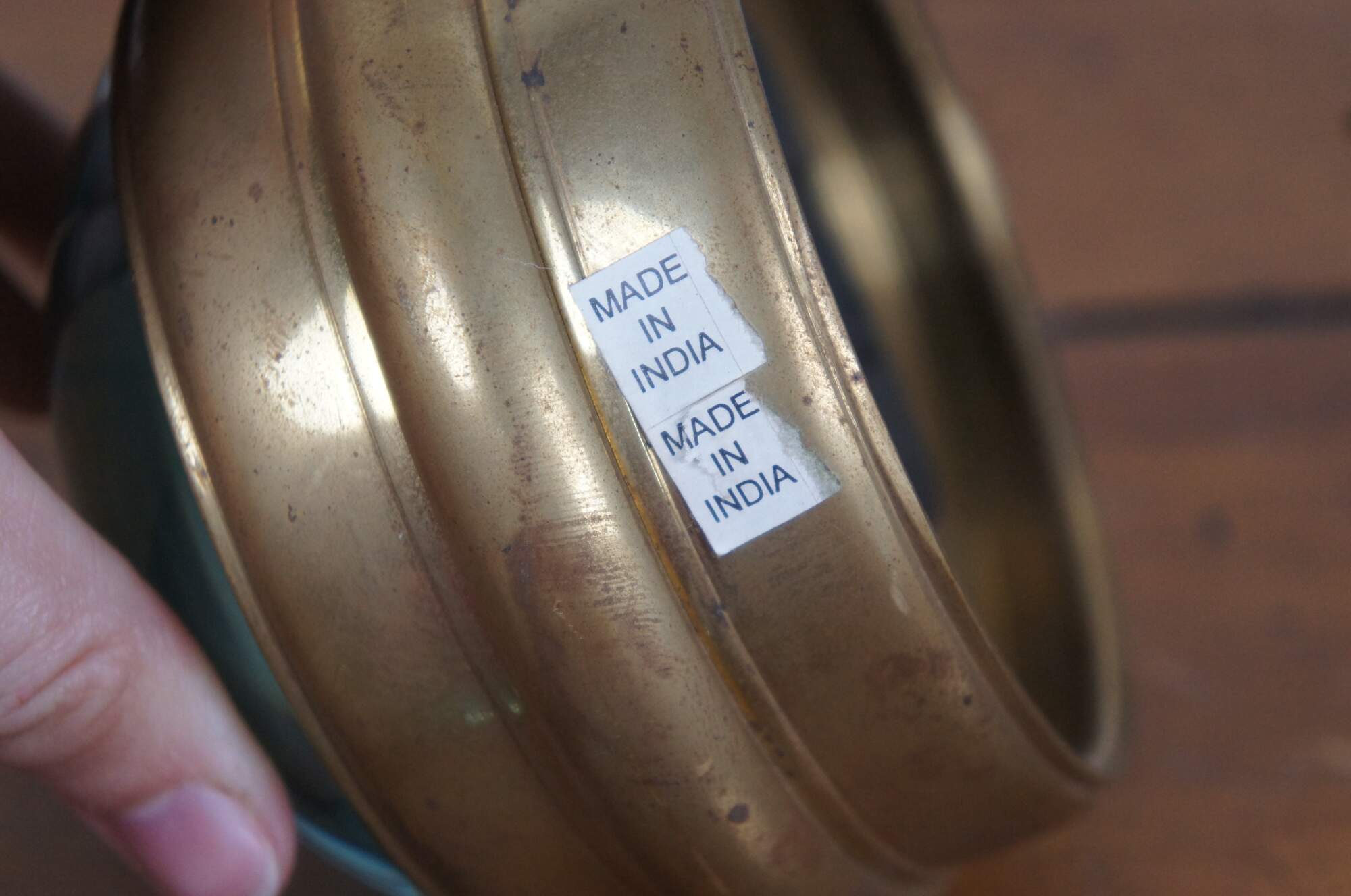 Late 20th century desk clock, crafted in the shape of a Marine pocket watch with brass frame and domes of magnifying glass on the front and back. White face with Arabic numerals, including seconds and 24 hour time. Made in India. M2188 Quartz battery operated movement.