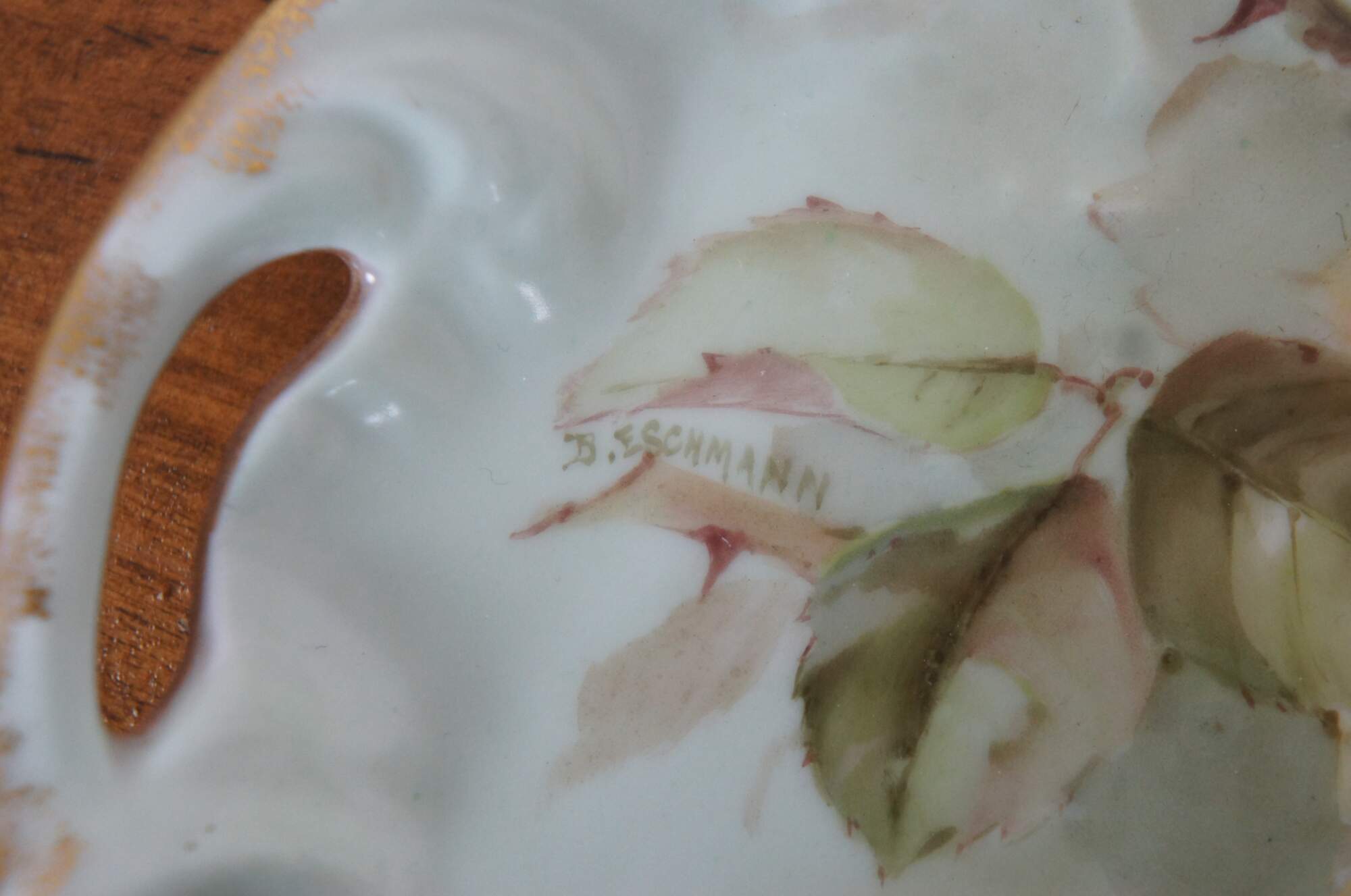 Late 19th - early 20th century Limoges porcelain vanity tray by William Guerin and Company. Kidney bean / artist palette shape with gilded, scalloped edge and pierced handle. Hand painted with green and mauve ombre and stems of yellow roses. Signed B. Eschmann.