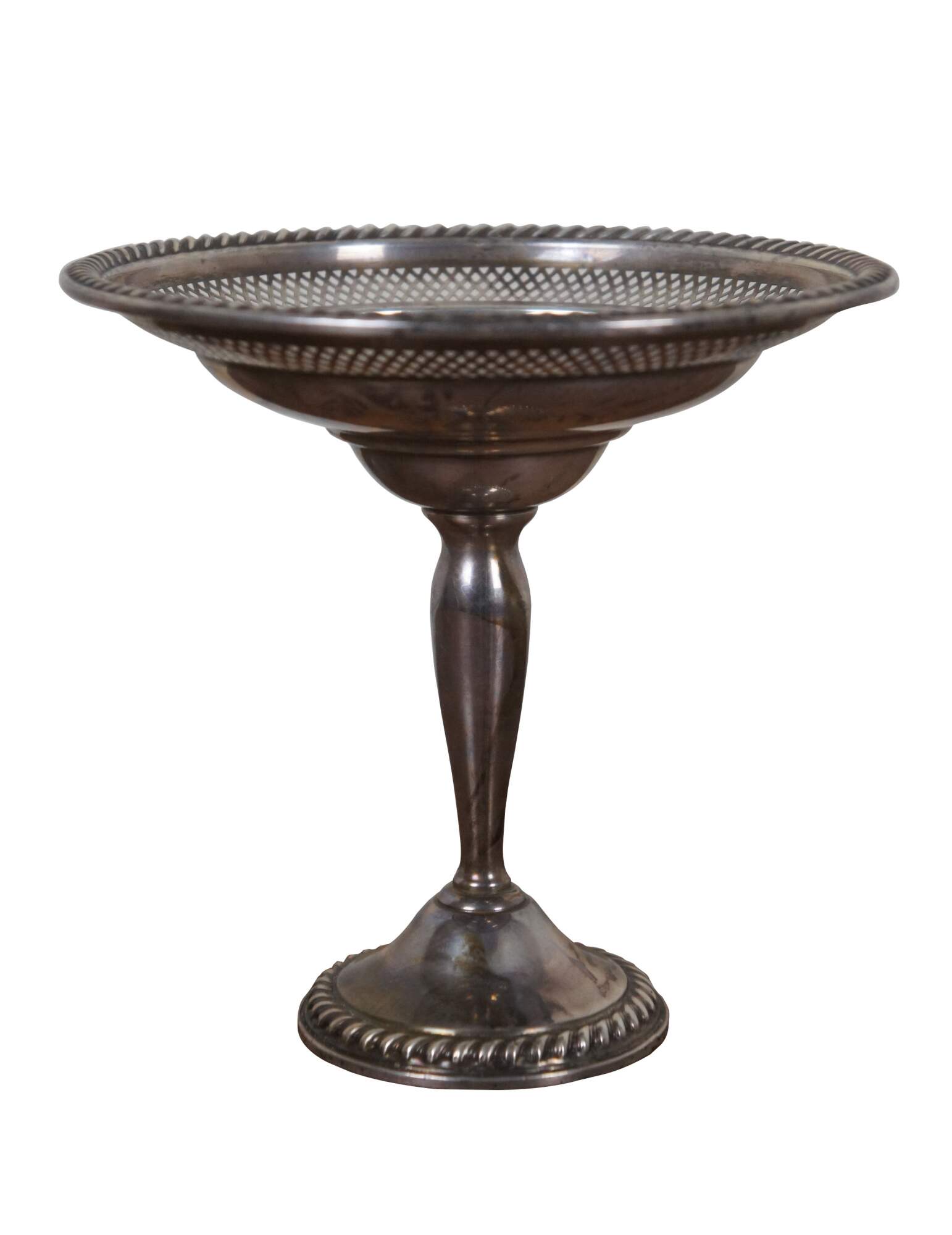 20th century weighted, reinforced, sterling silver number 32 Cornwell compote by Watrous Mfg Co. Pedestal style nut / candy dish with rope twist border and pierced reticulated lattice detail.