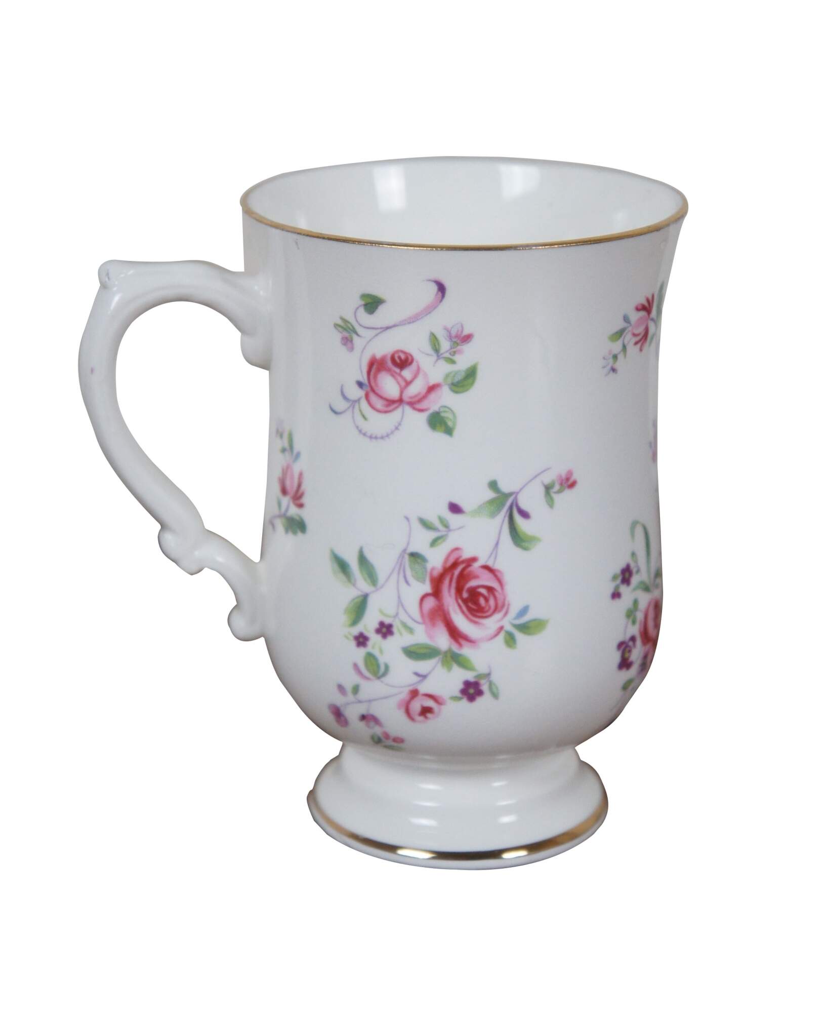Set of six late 20th century fine bone china coffee cups / mugs with pedestal bases by Royal Victoria, decorated with a pattern of small purple flowers, pink roses and gilded trim.