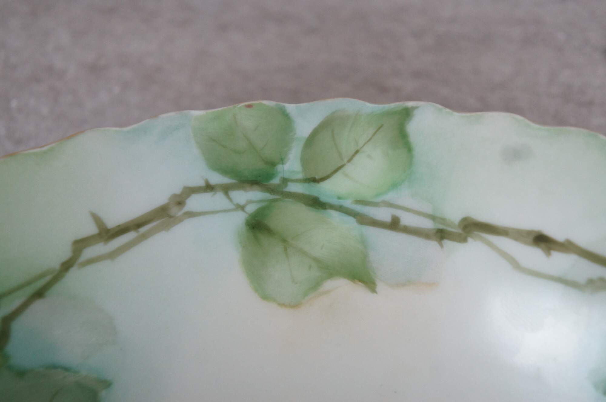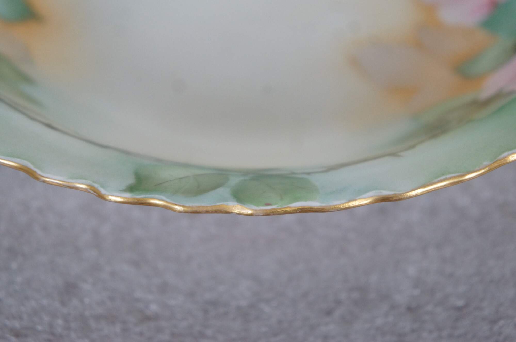 Early 20th century round porcelain serving bowl by O&EG Royal Austria. Hand painted green ombre with pink and yellow roses; gilded lightly scalloped rim. Mark used circa 1899-1918.