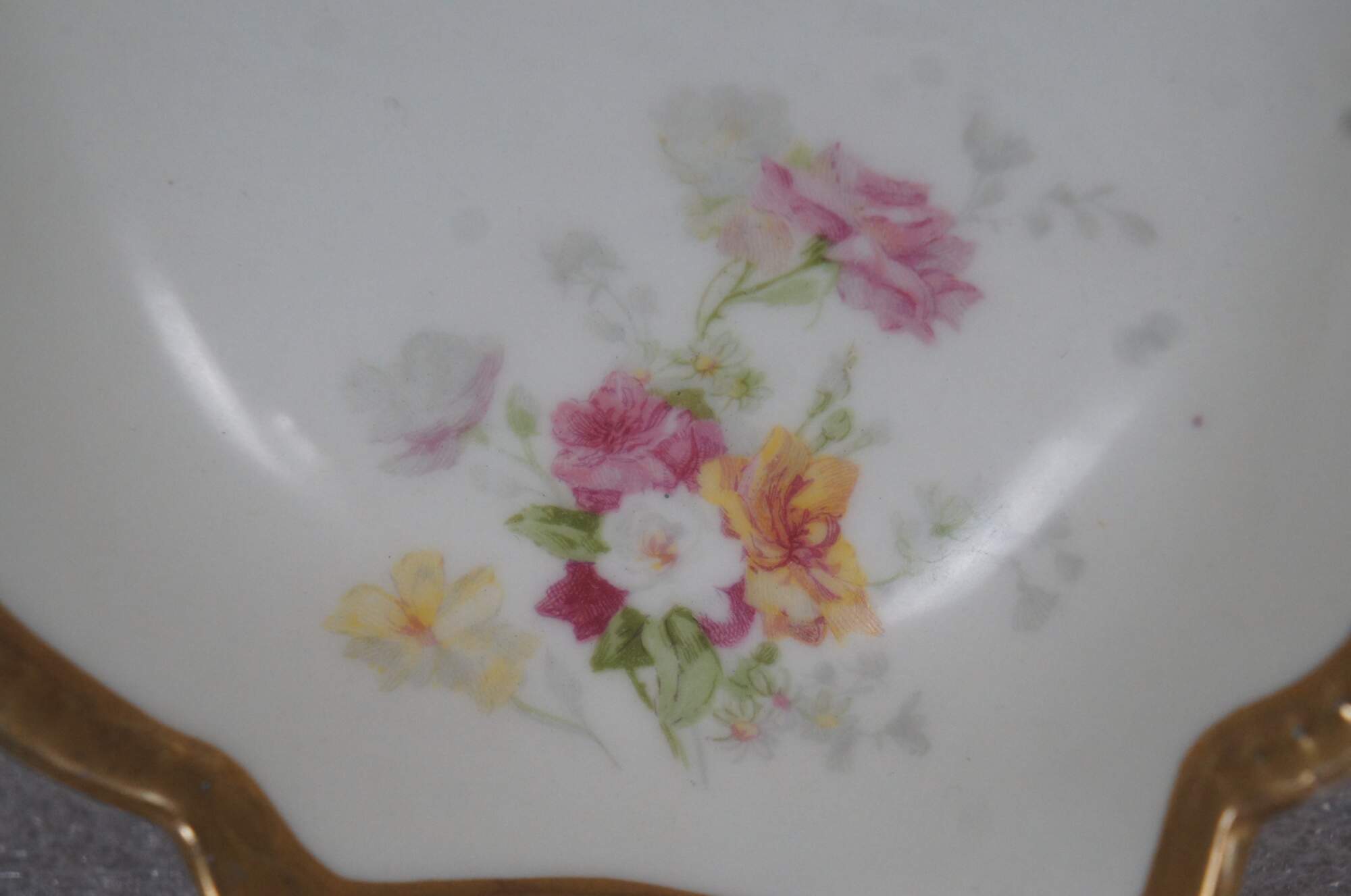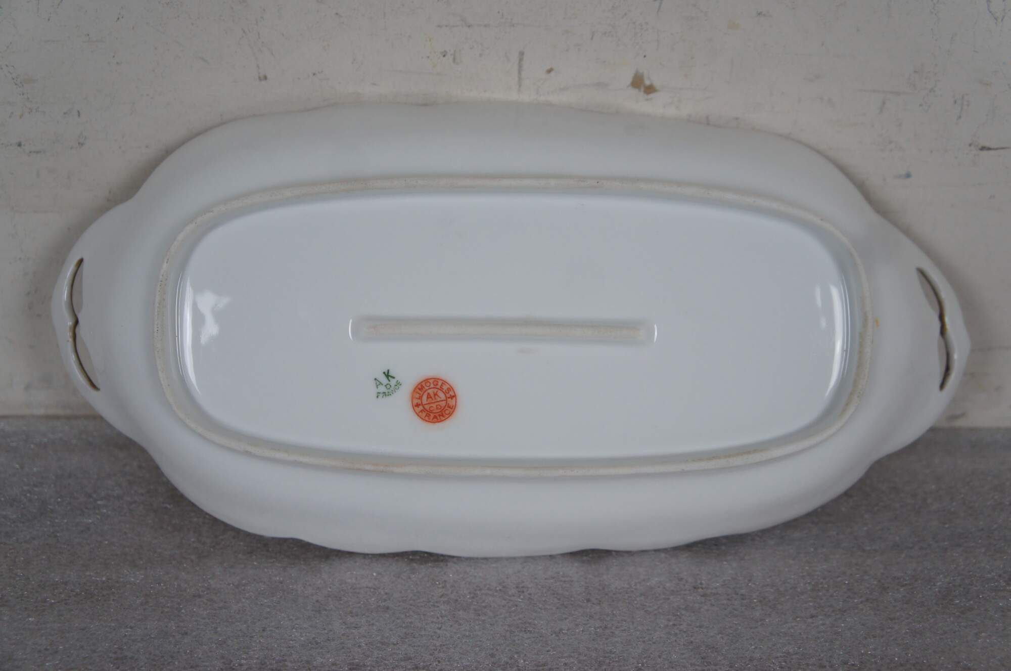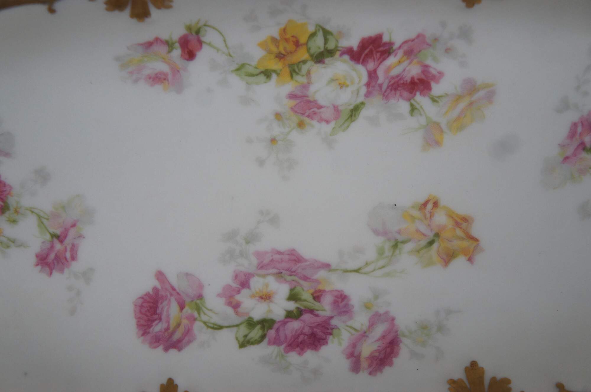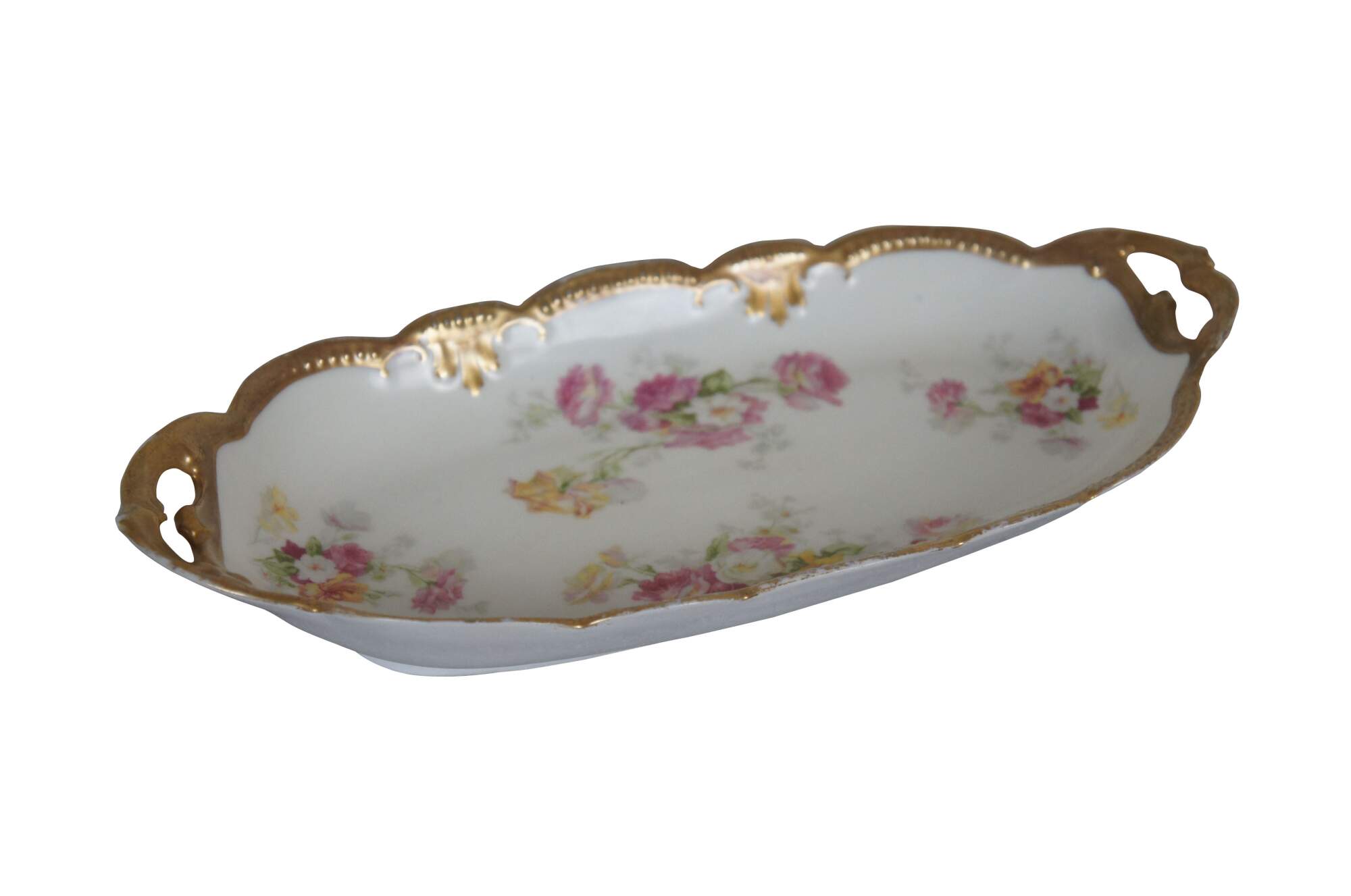 Early 20th century Limoges porcelain serving dish / vanity tray by Alfred Klingenberg and Charles Dwenger. Long oval shape with scalloped edges and pierced handles. Gilded border. Sprays of pink, yellow, and green flowers. Mark used circa 1900-1910.