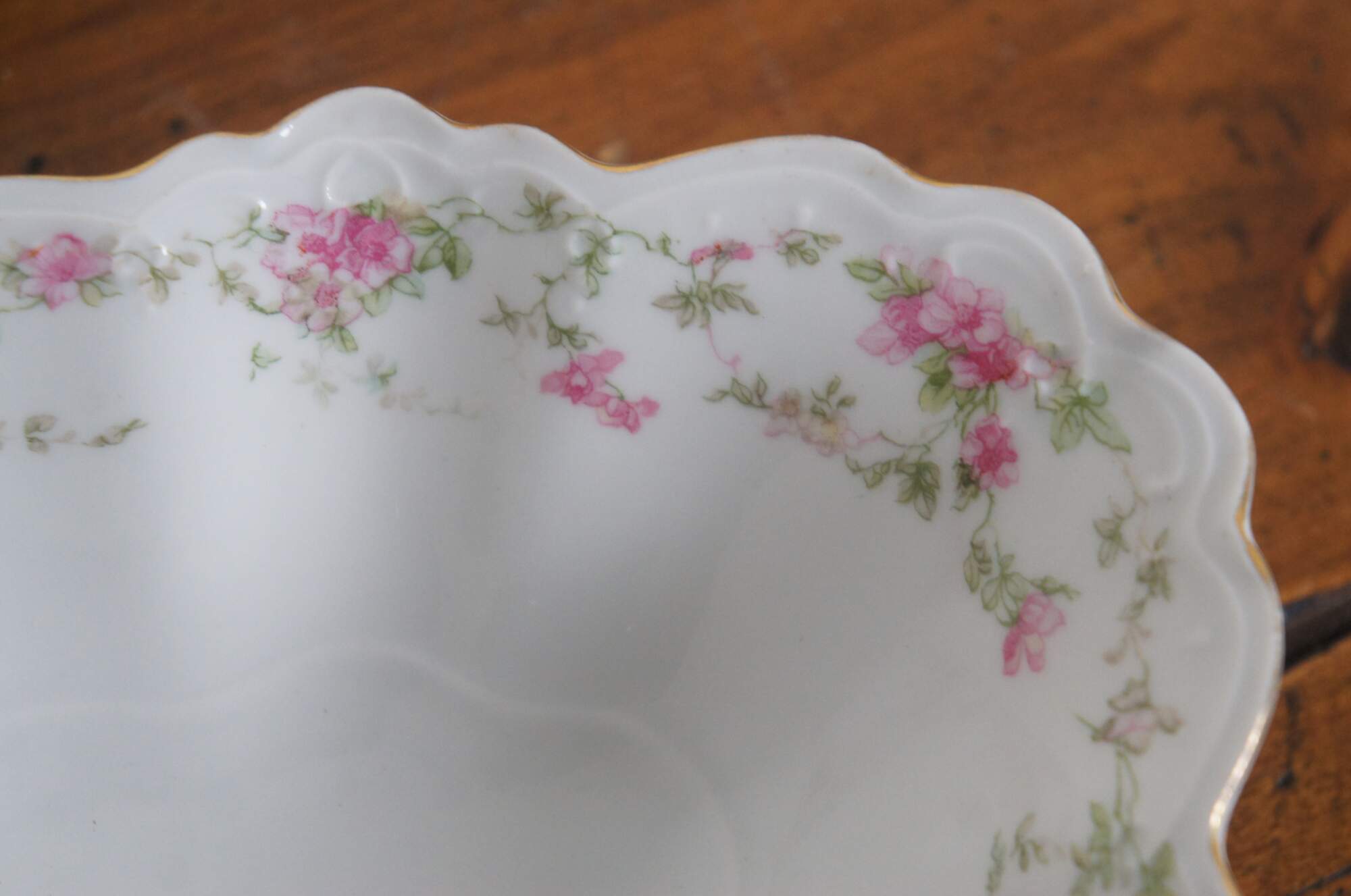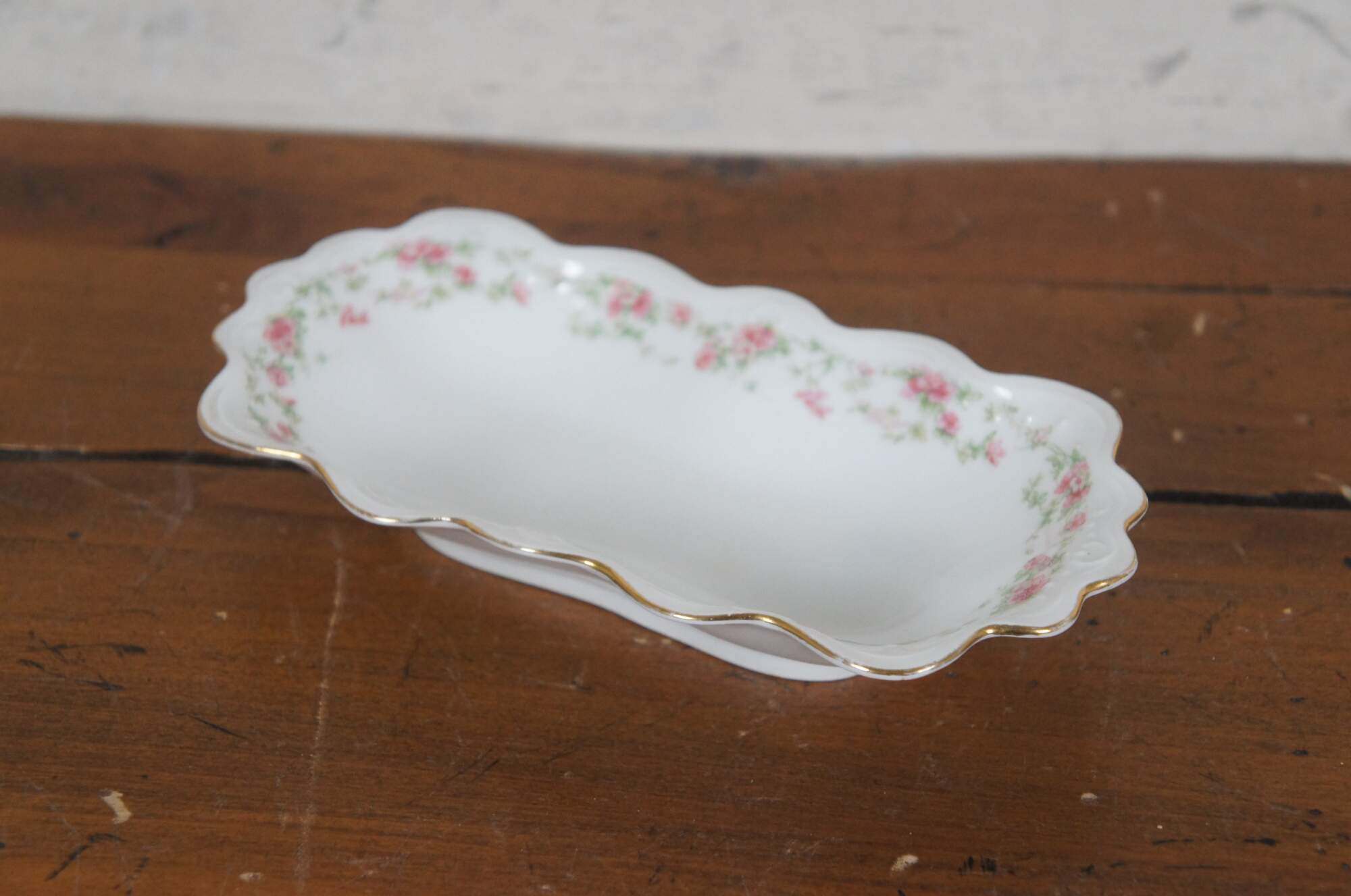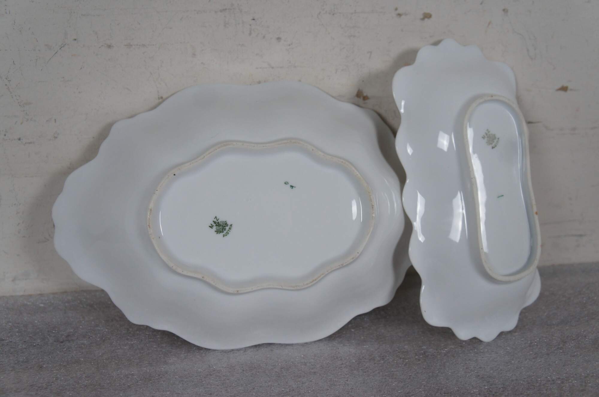 Pair of turn of the century porcelain serving dishes by MZ Austria. One oval bowl and one rectangular serving dish, scalloped edges with gold trim, pink rose and green leaf garland pattern. Mark used circa 1884-1909.
