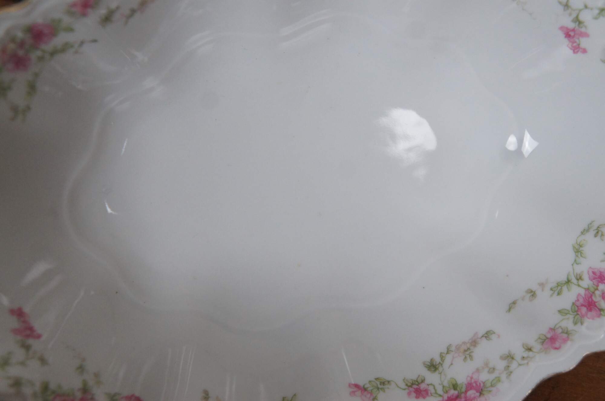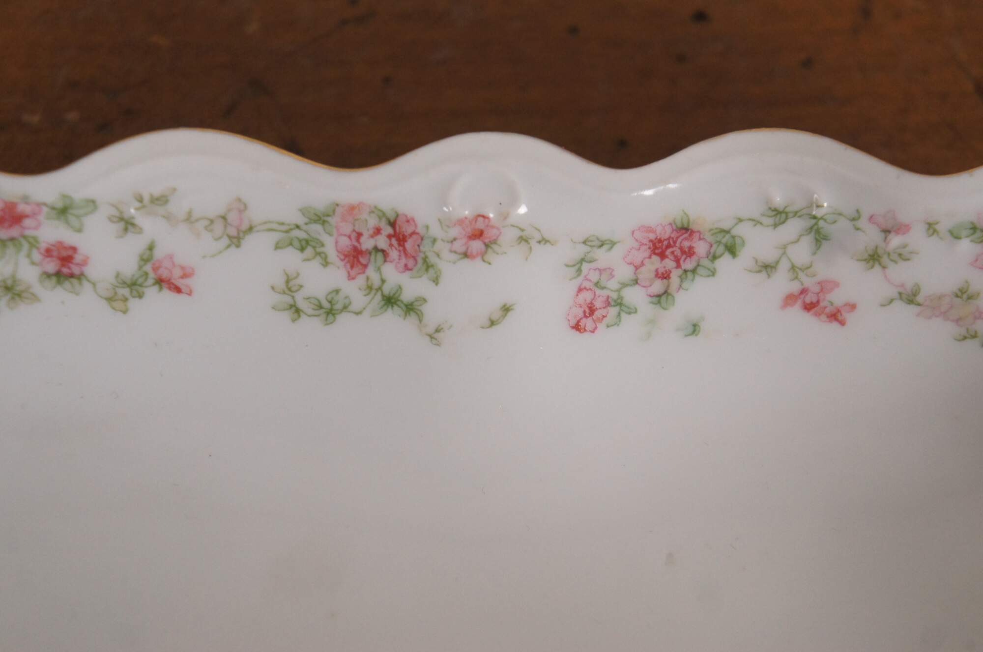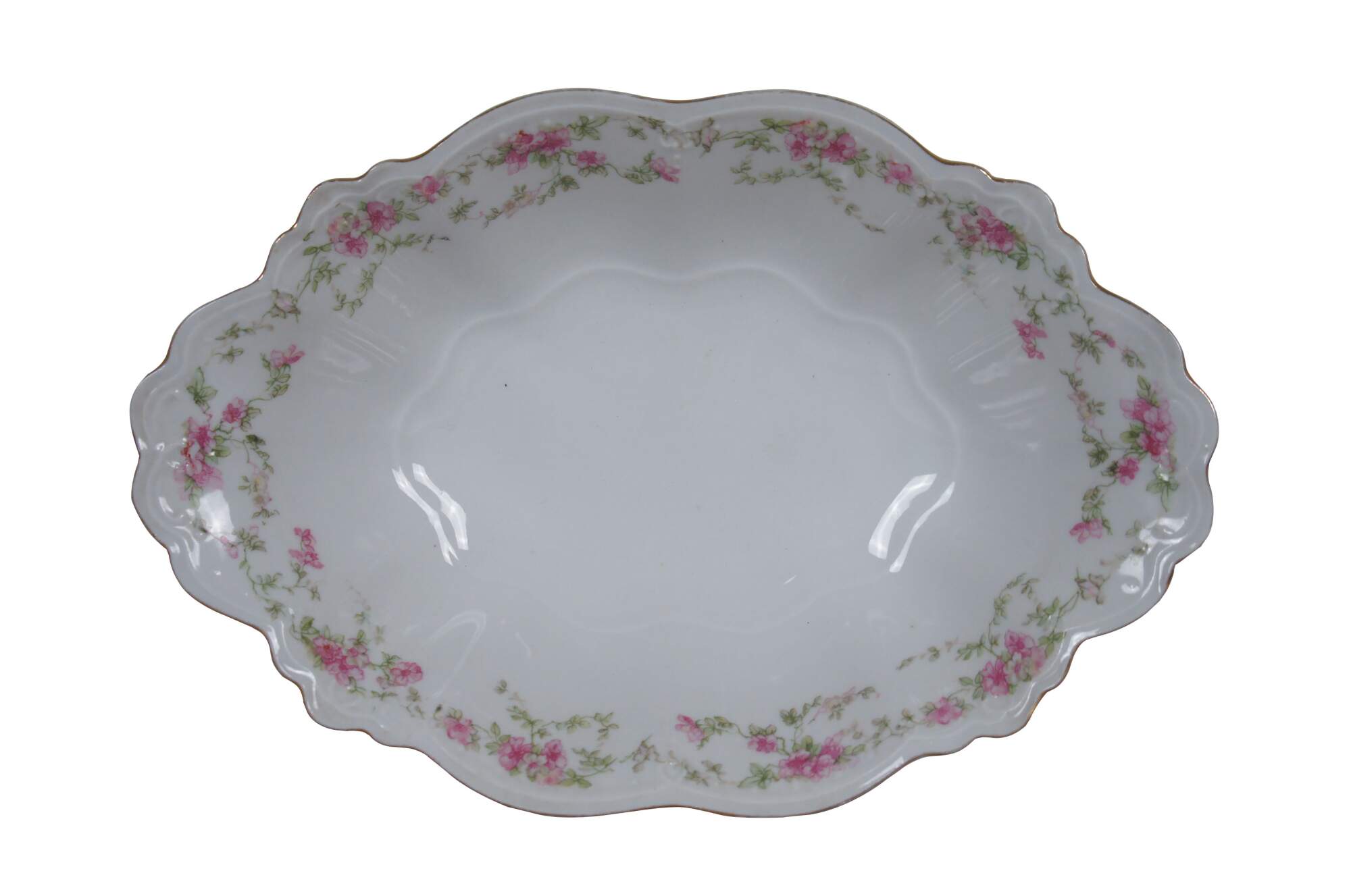 Pair of turn of the century porcelain serving dishes by MZ Austria. One oval bowl and one rectangular serving dish, scalloped edges with gold trim, pink rose and green leaf garland pattern. Mark used circa 1884-1909.